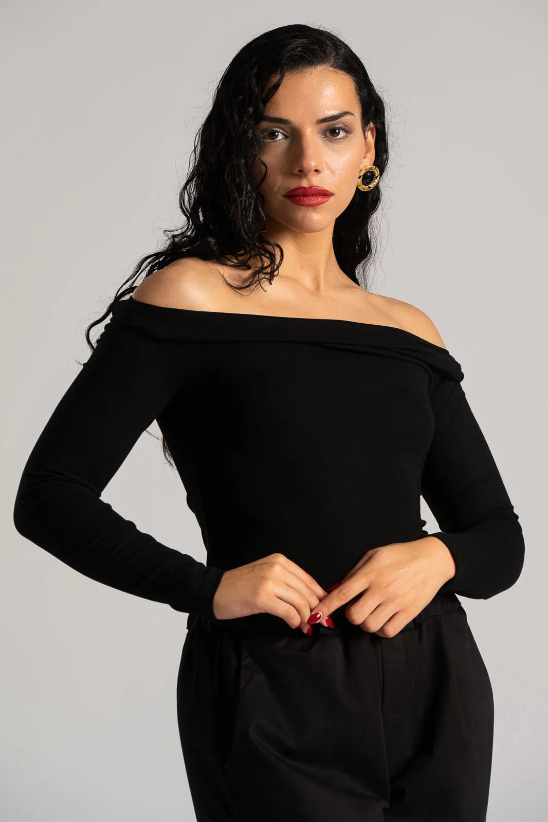 Blouse with a smile neckline. It has long sleeves and a straight cut. It is an ideal choice for all hours of the day. The fabric is very soft. The measurements in the table are representative for each code. 75% cotton, 20% viscose, 5% elastane.