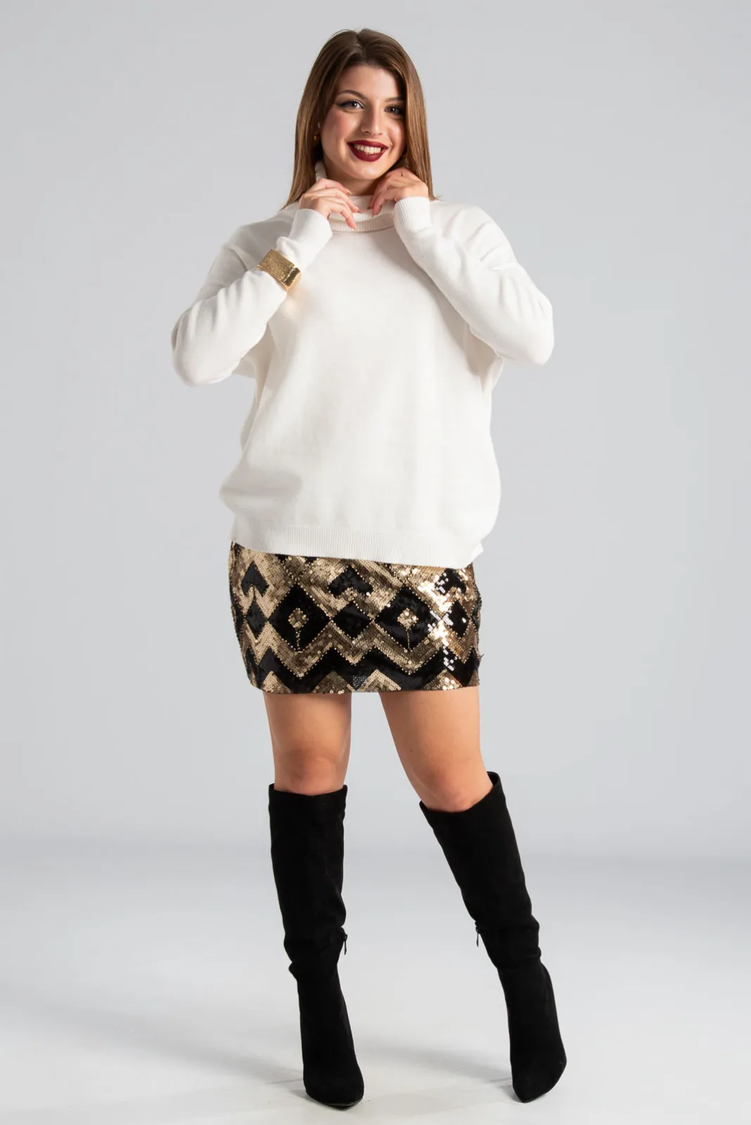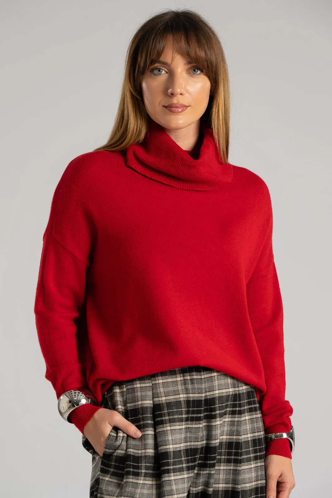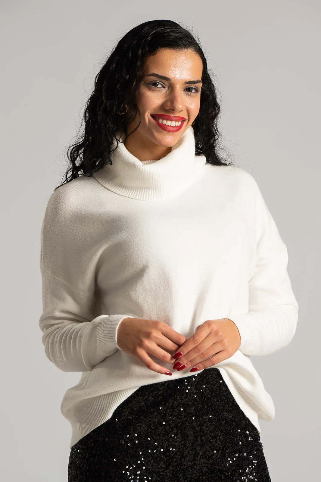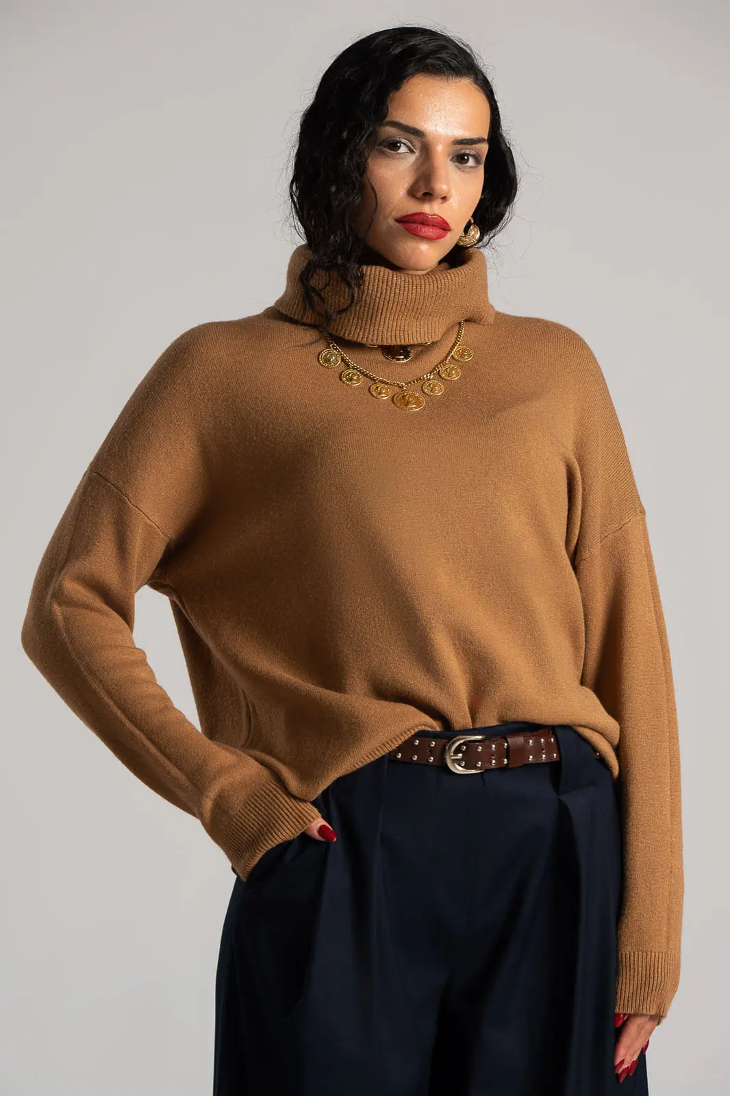 Blouse with a rich turtleneck collar. It is woolen with a compact weave. It has long sleeves. It is a basic choice for your wardrobe. The measurements in the table are representative for each product. 65% viscose, 35% nylon.