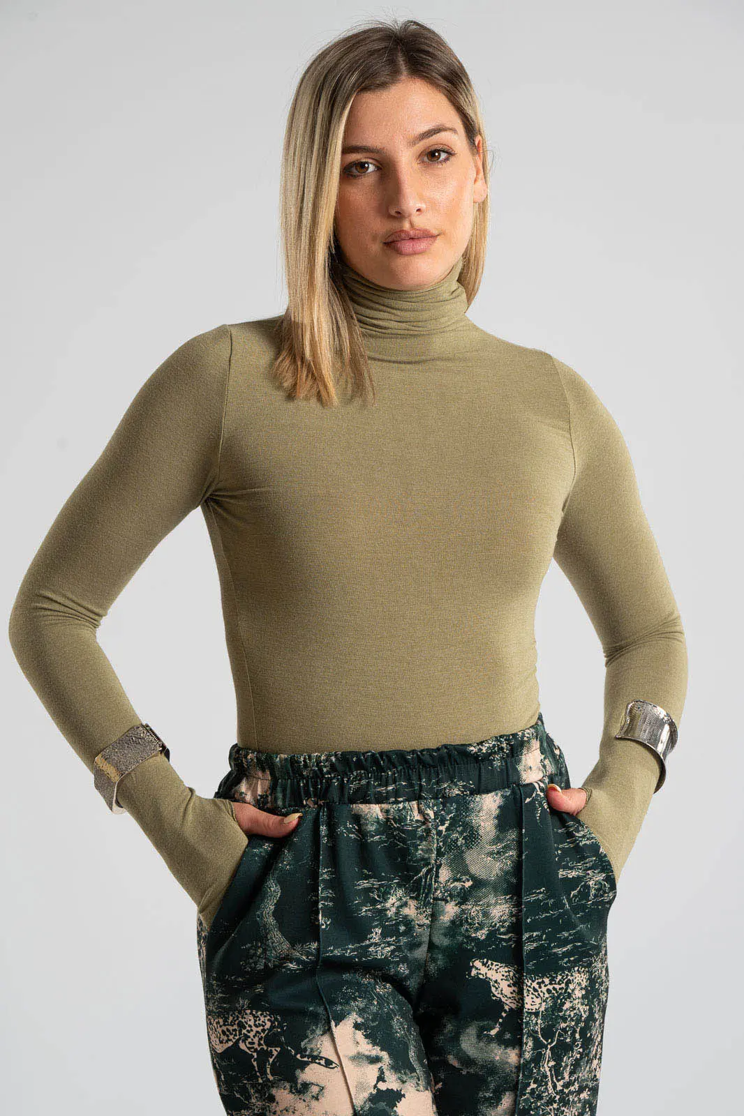 Turtleneck blouse. It has long sleeves with thumb holes and a comfortable fit. It is a smart choice for any time of day. The measurements in the table are representative for each code. 65% viscose, 30% acrylic, 5% elastane.