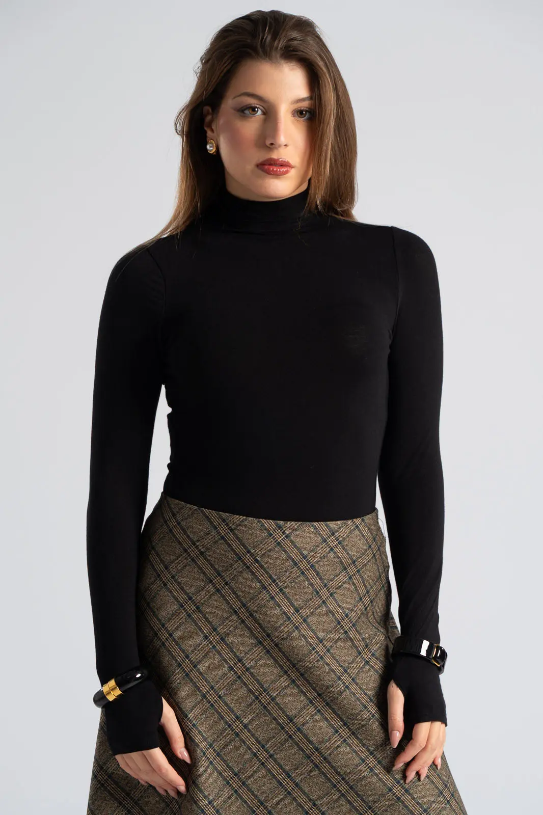 Turtleneck blouse. It has long sleeves with thumb holes and a comfortable fit. It is a smart choice for any time of day. The measurements in the table are representative for each code. 65% viscose, 30% acrylic, 5% elastane.