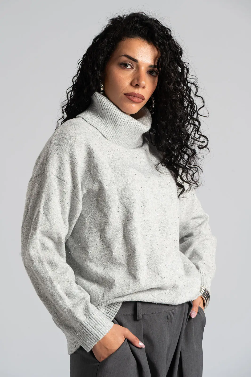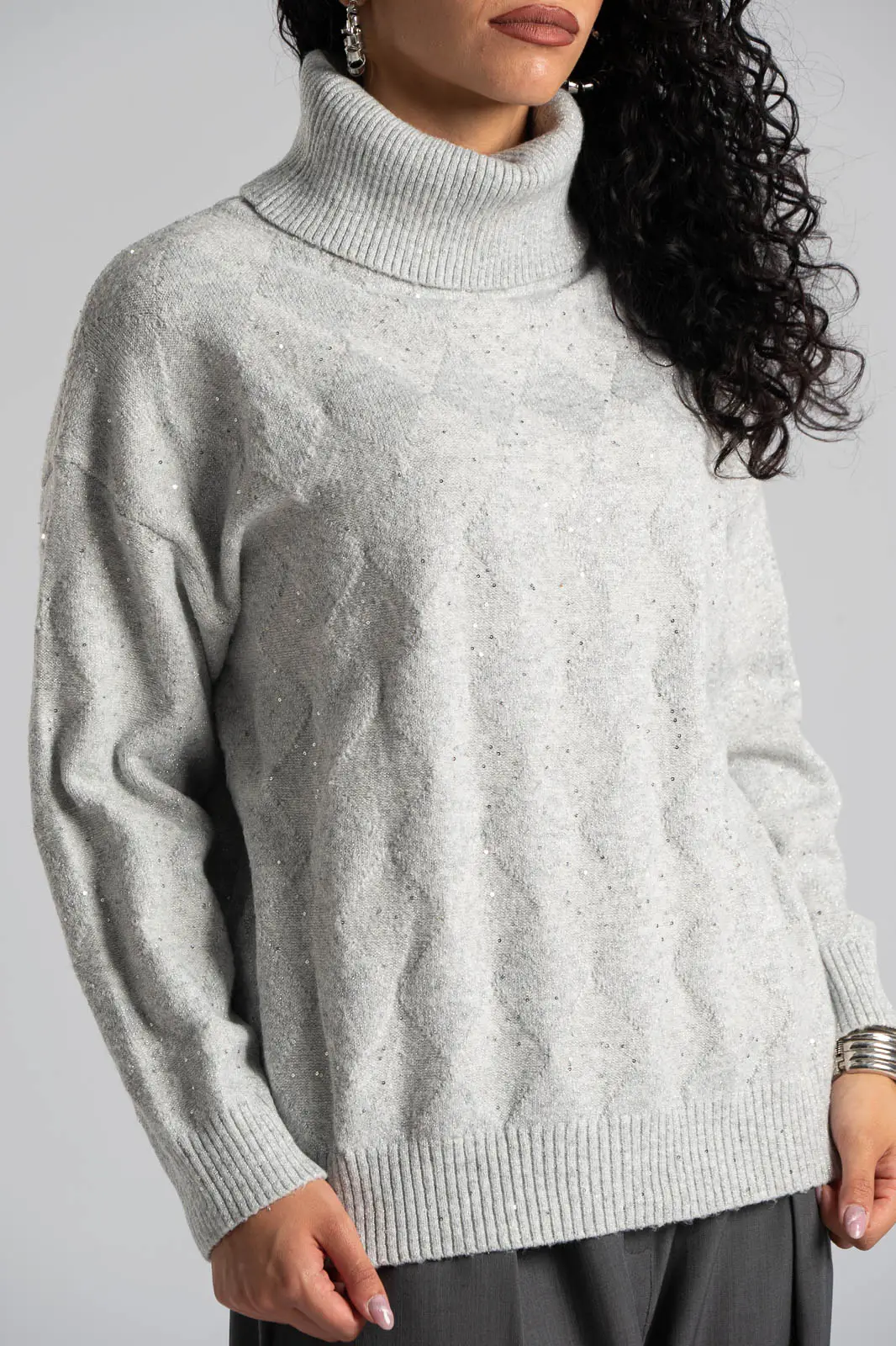 Sweater with a turtleneck. It has long sleeves. Decorated with small silver thread sequins all over. Straight cut. The measurements in the table are representative of each product. 30% acrylic, 30% viscose, 20% modal, 20% elastane.