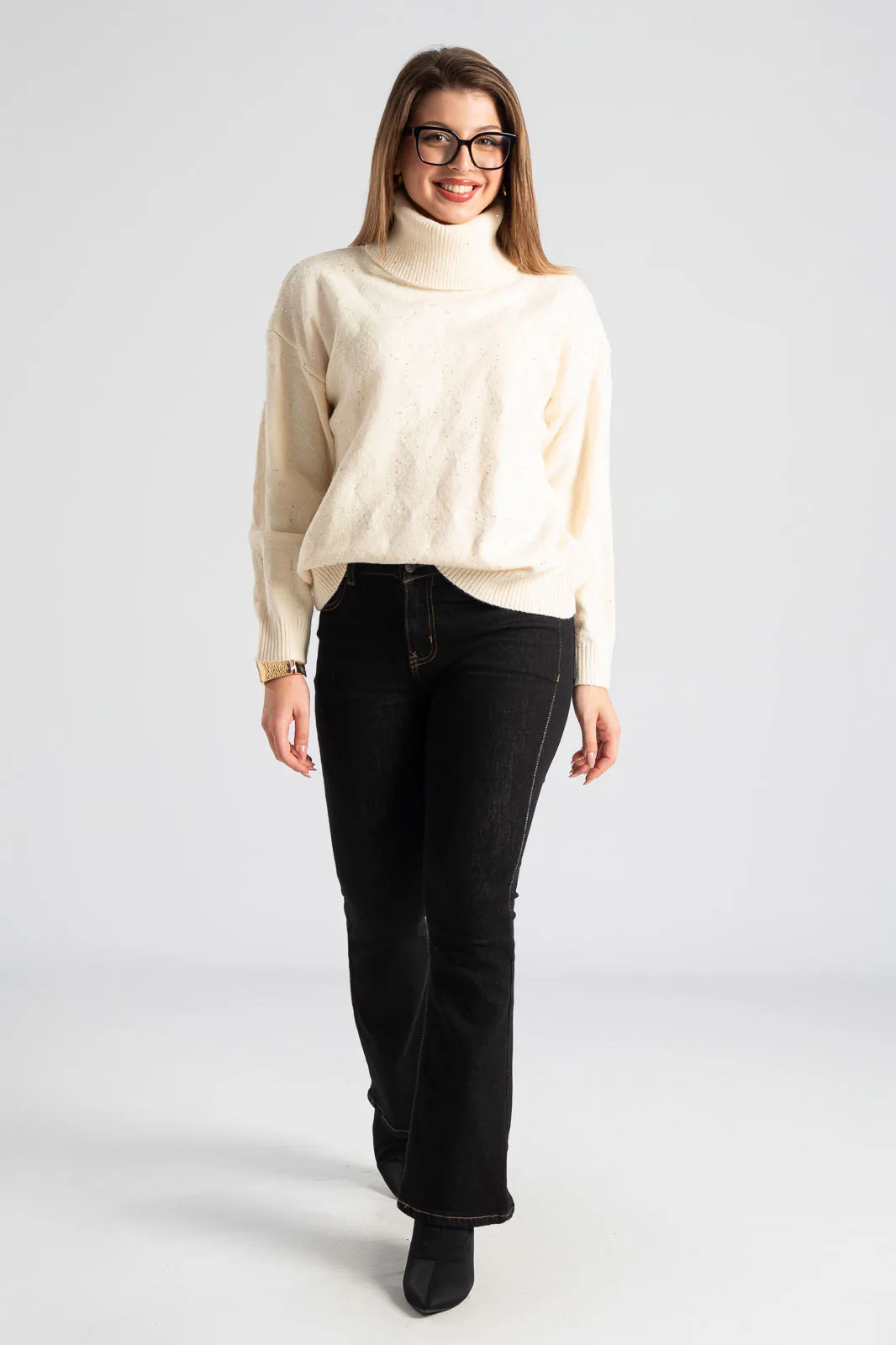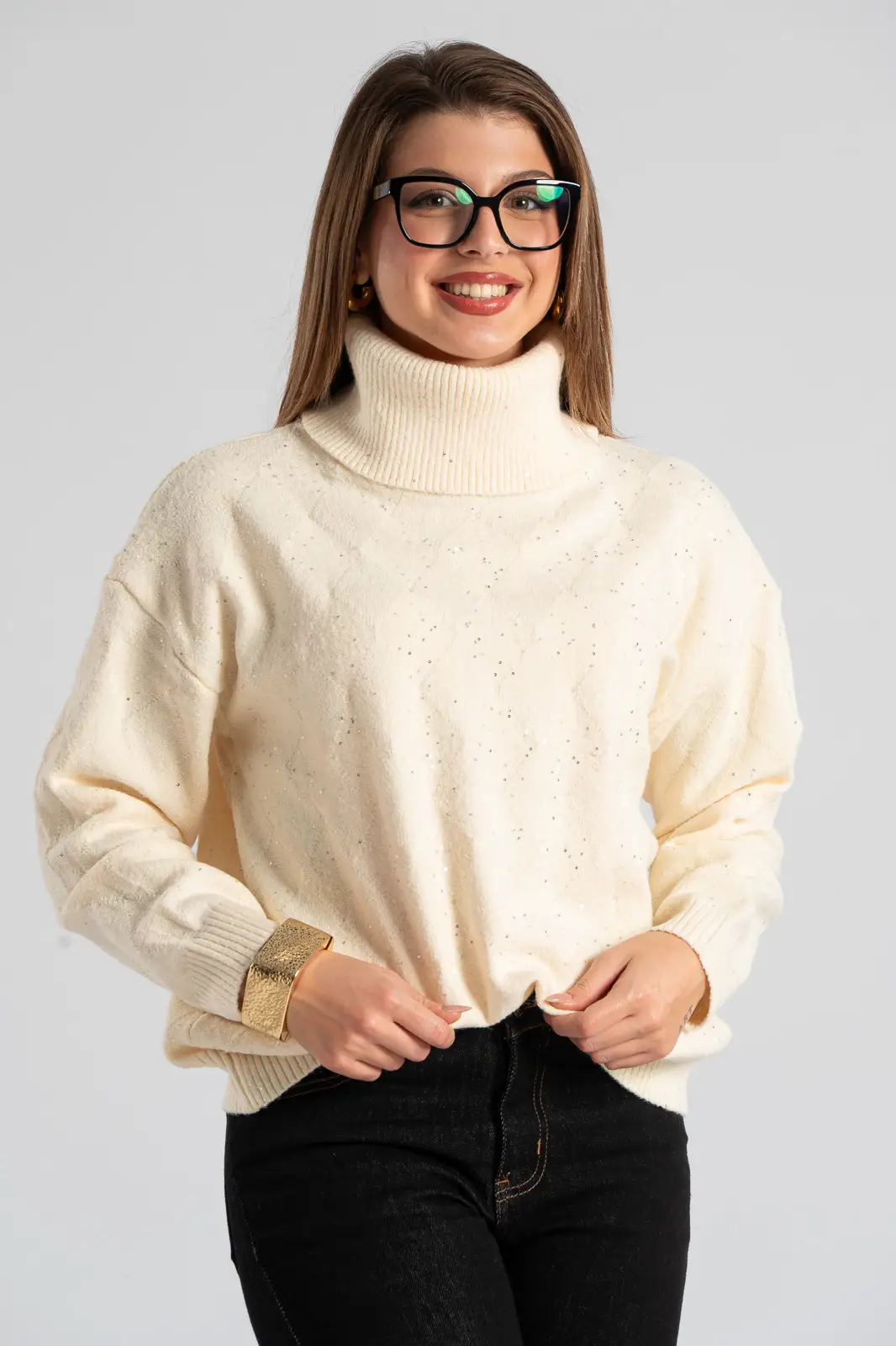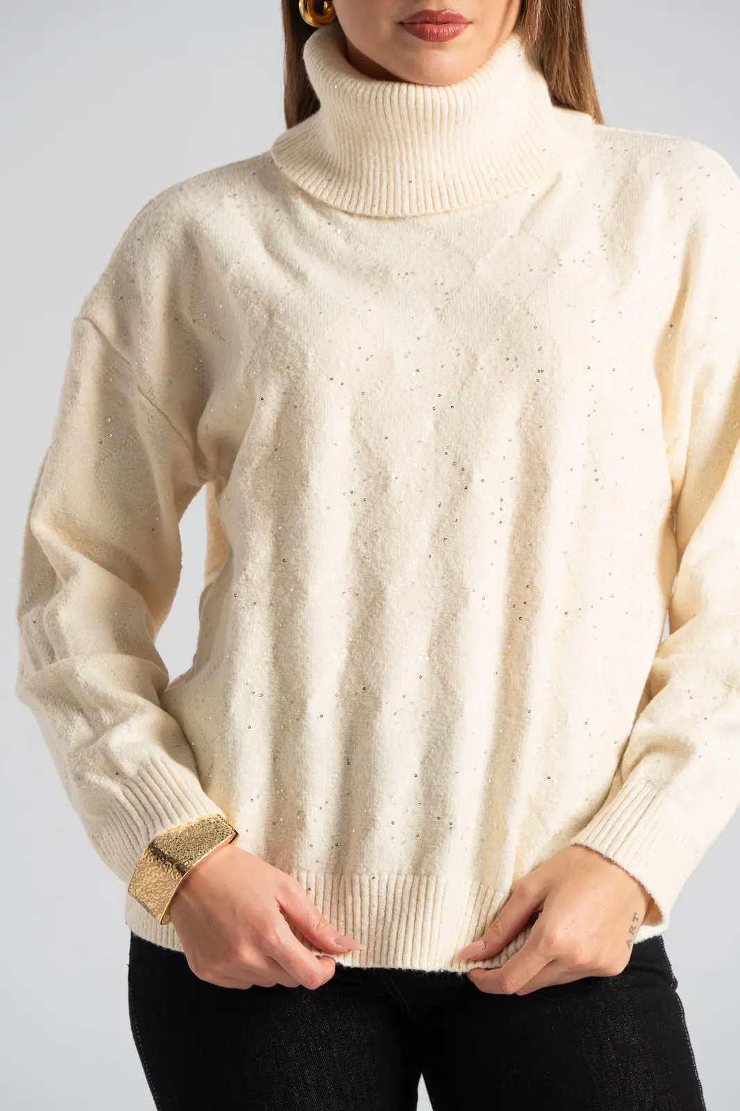 Sweater with a turtleneck. It has long sleeves. Decorated with small silver thread sequins all over. Straight cut. The measurements in the table are representative of each product. 30% acrylic, 30% viscose, 20% modal, 20% elastane.