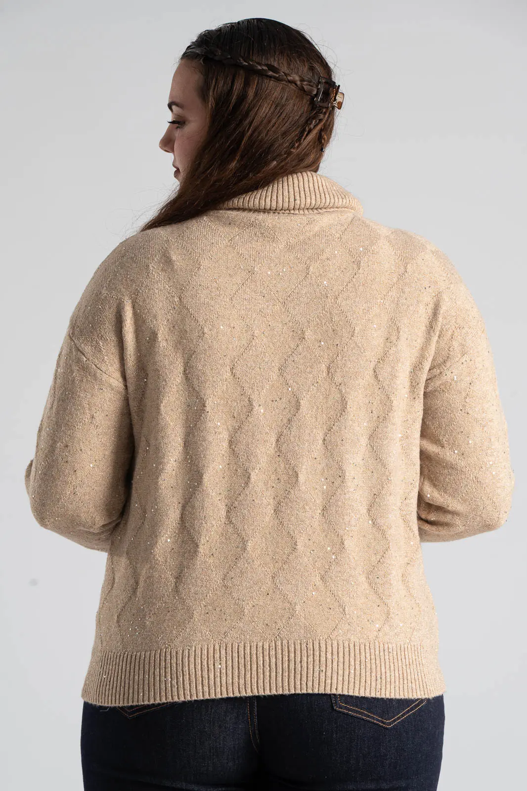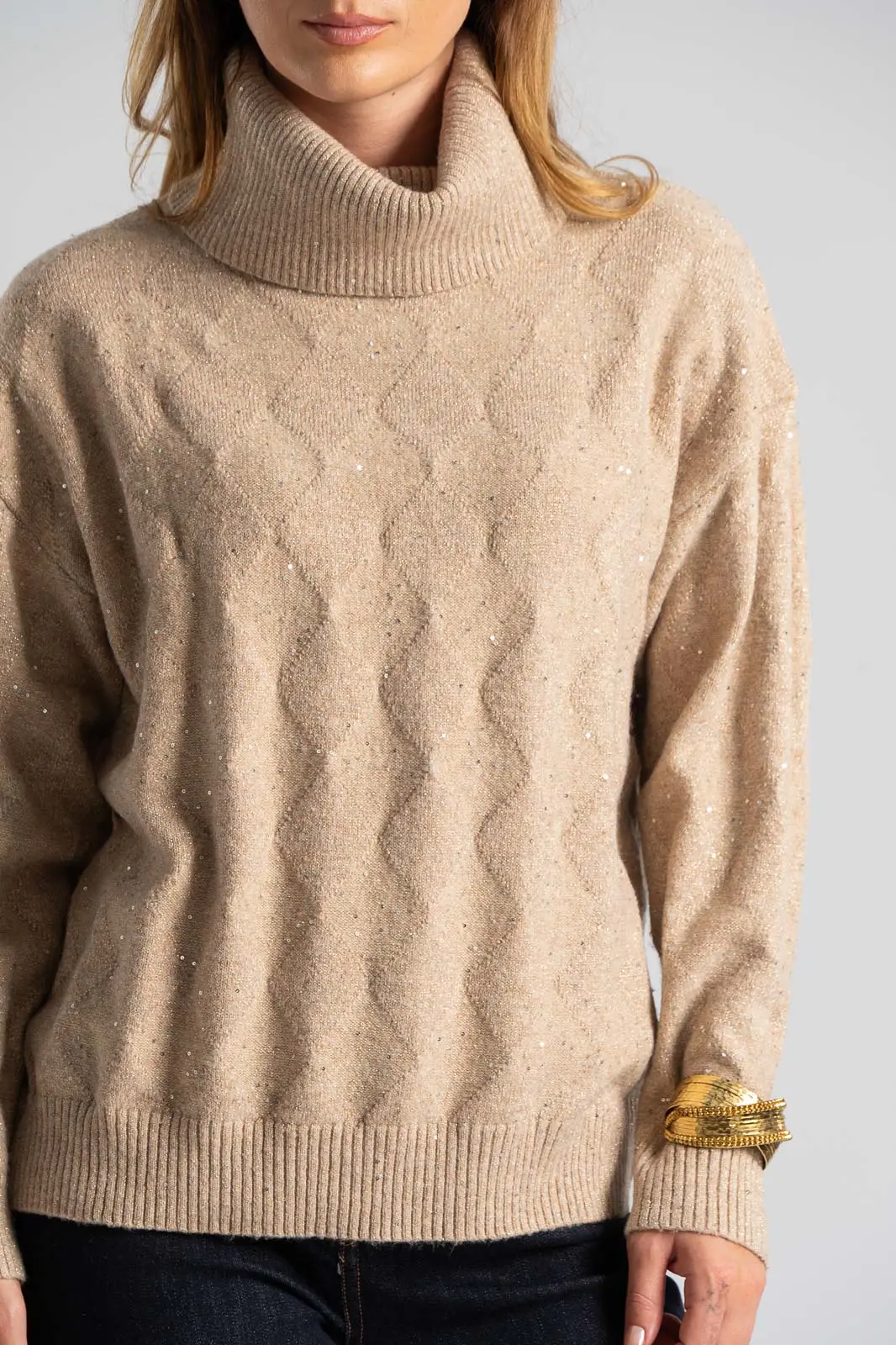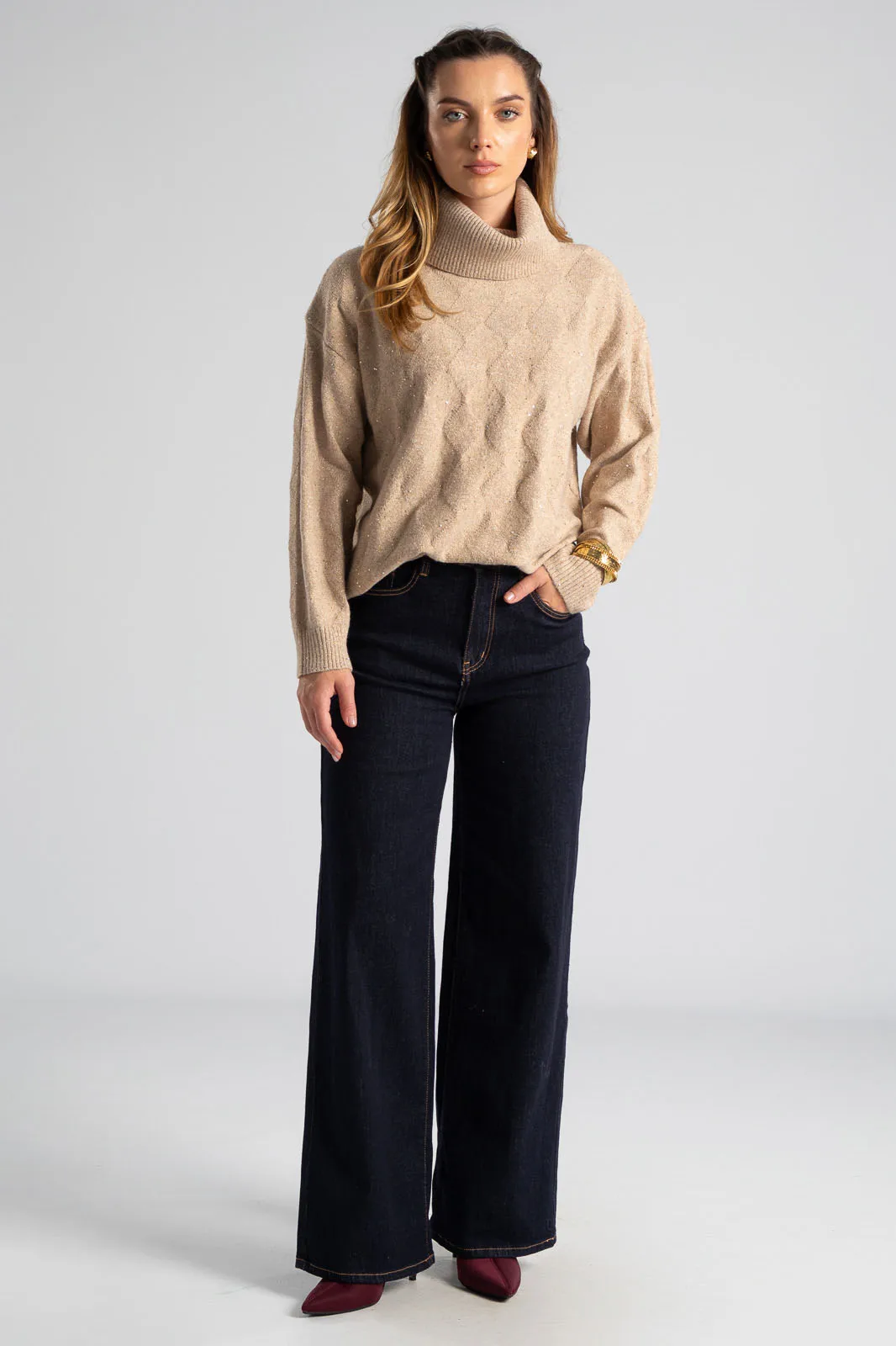 Sweater with a turtleneck. It has long sleeves. Decorated with small silver thread sequins all over. Straight cut. The measurements in the table are representative of each product. 30% acrylic, 30% viscose, 20% modal, 20% elastane.