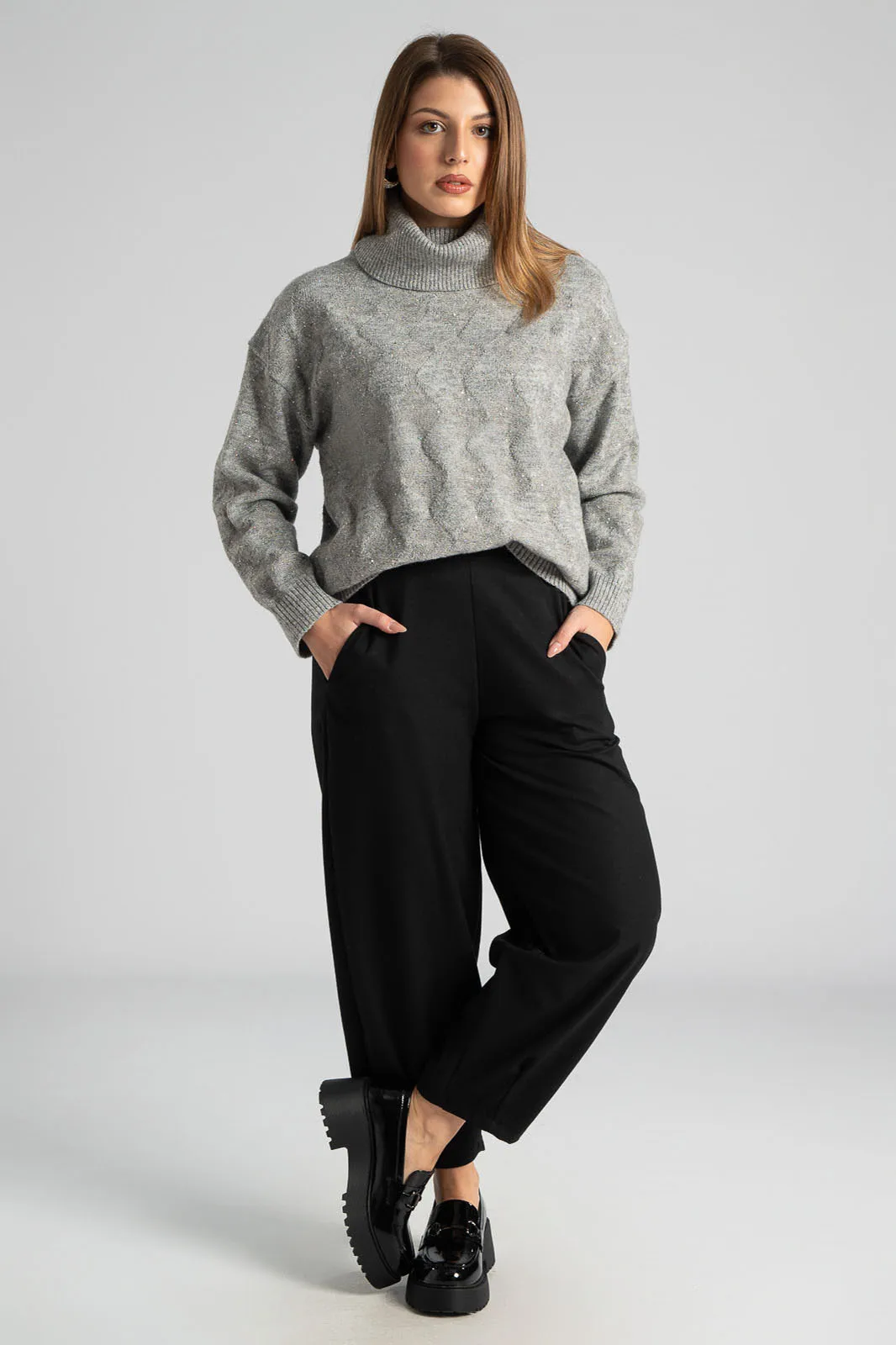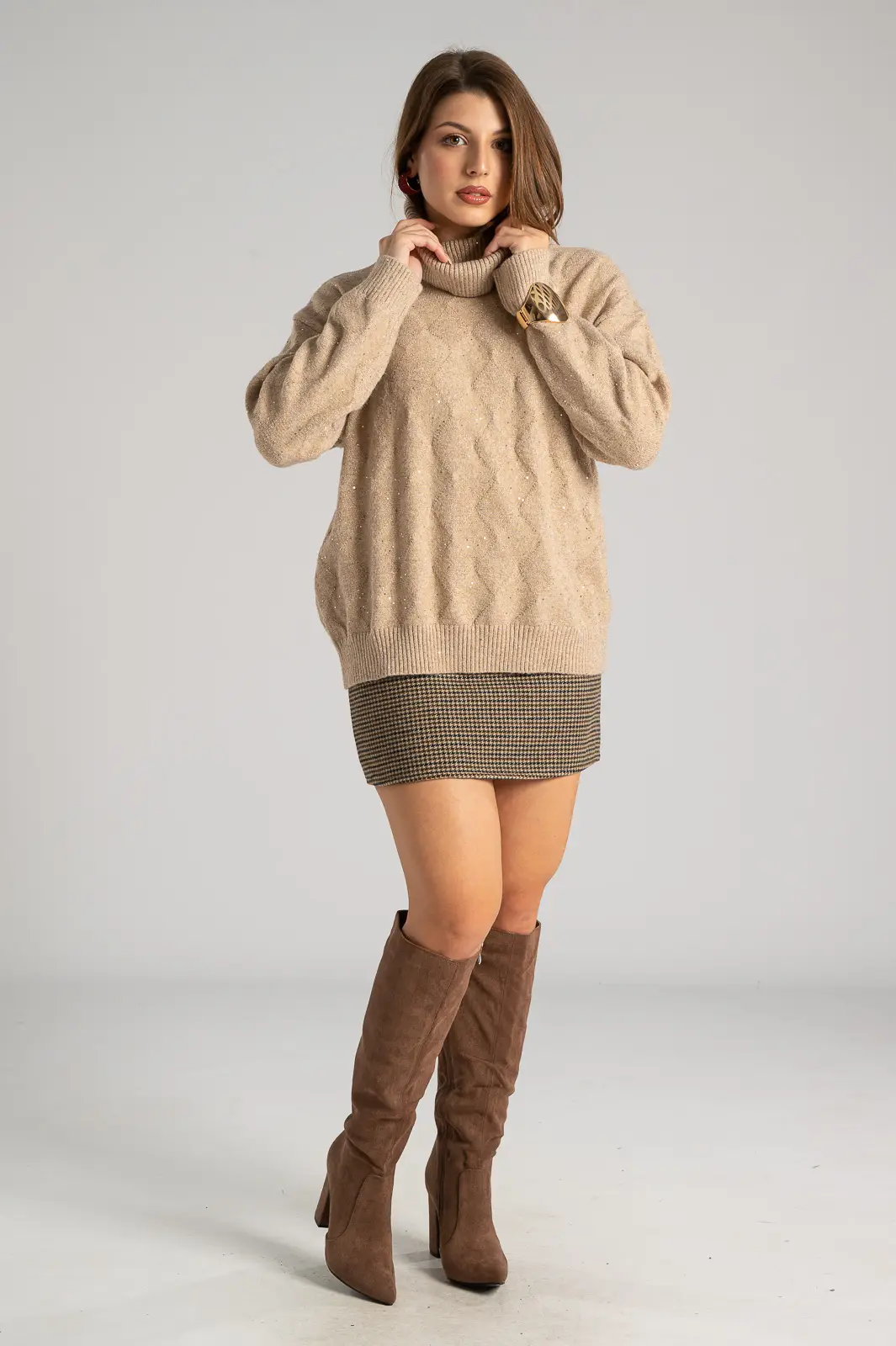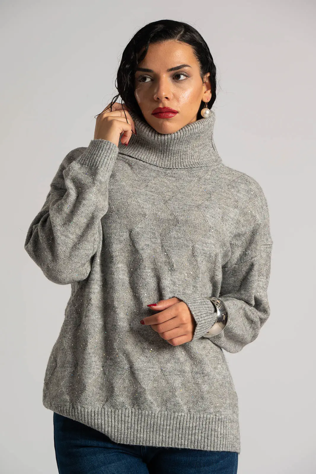 Sweater with a turtleneck. It has long sleeves. Decorated with small silver thread sequins all over. Straight cut. The measurements in the table are representative of each product. 30% acrylic, 30% viscose, 20% modal, 20% elastane.
