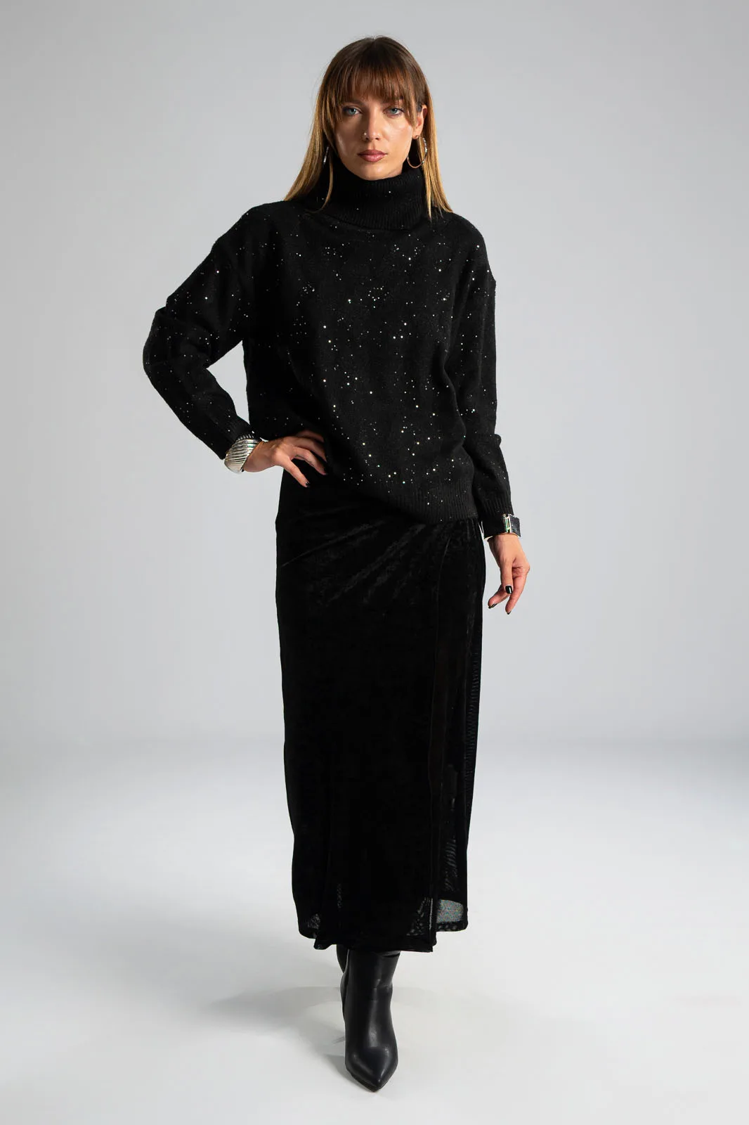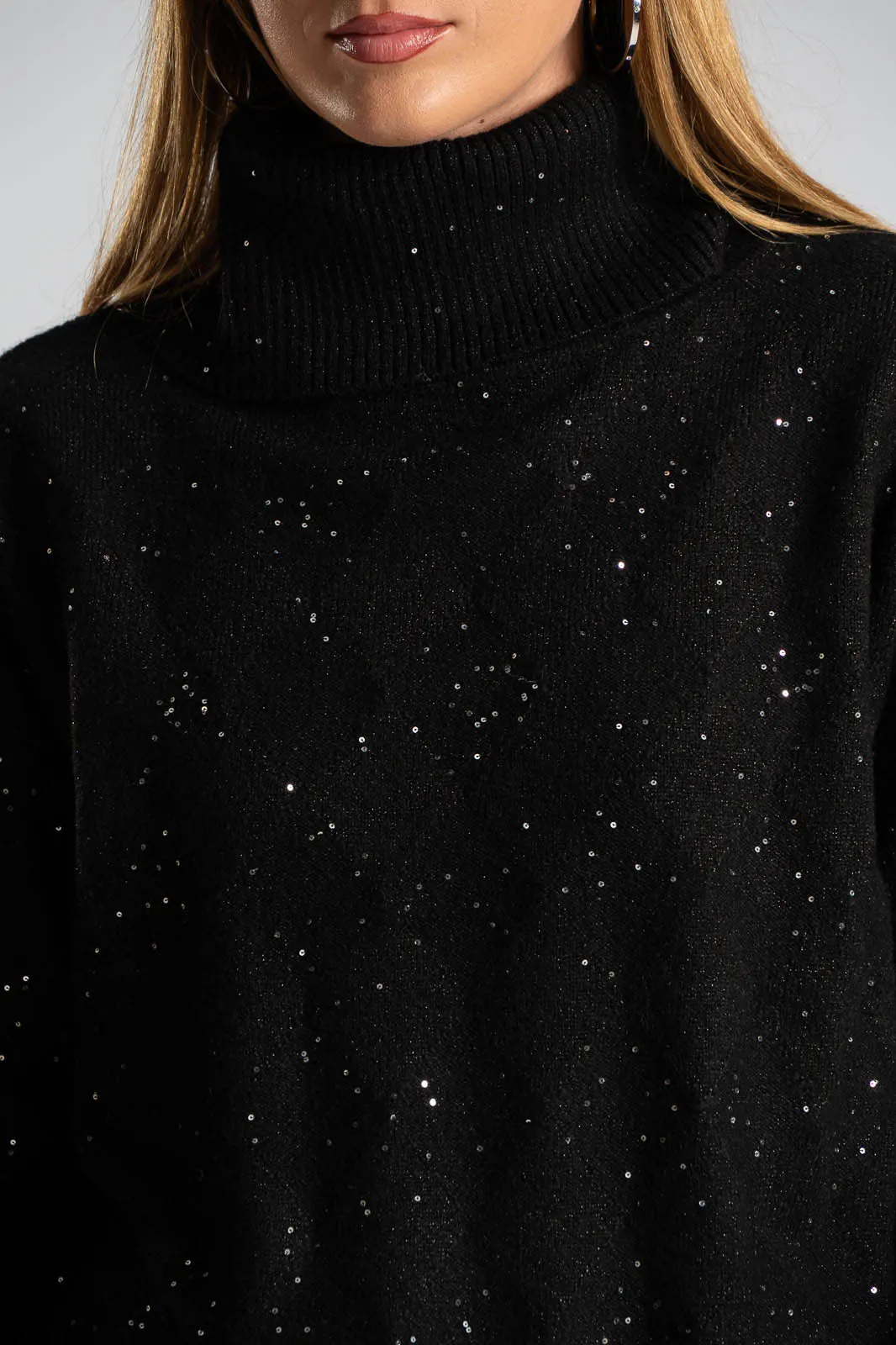 Sweater with a turtleneck. It has long sleeves. Decorated with small silver thread sequins all over. Straight cut. The measurements in the table are representative of each product. 30% acrylic, 30% viscose, 20% modal, 20% elastane.