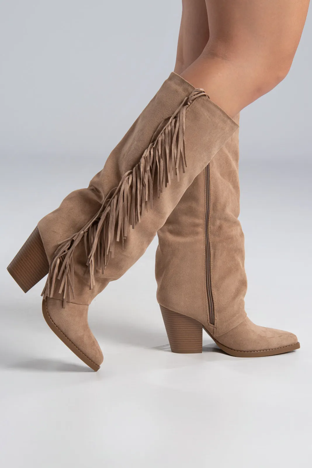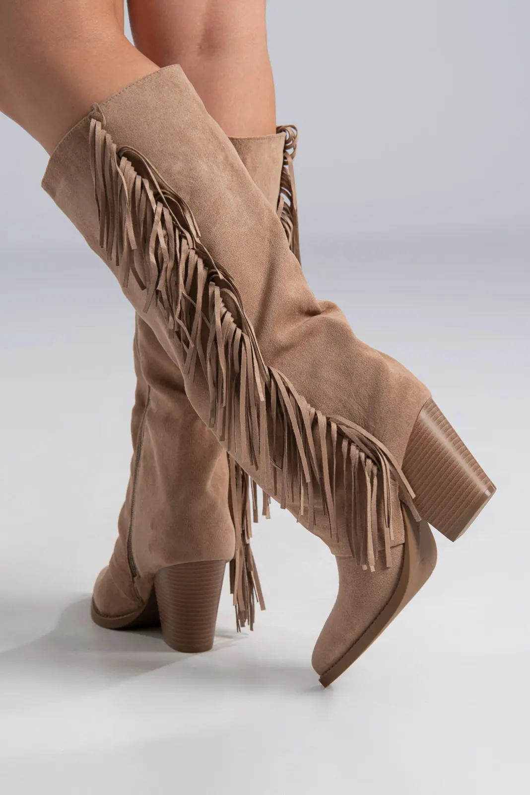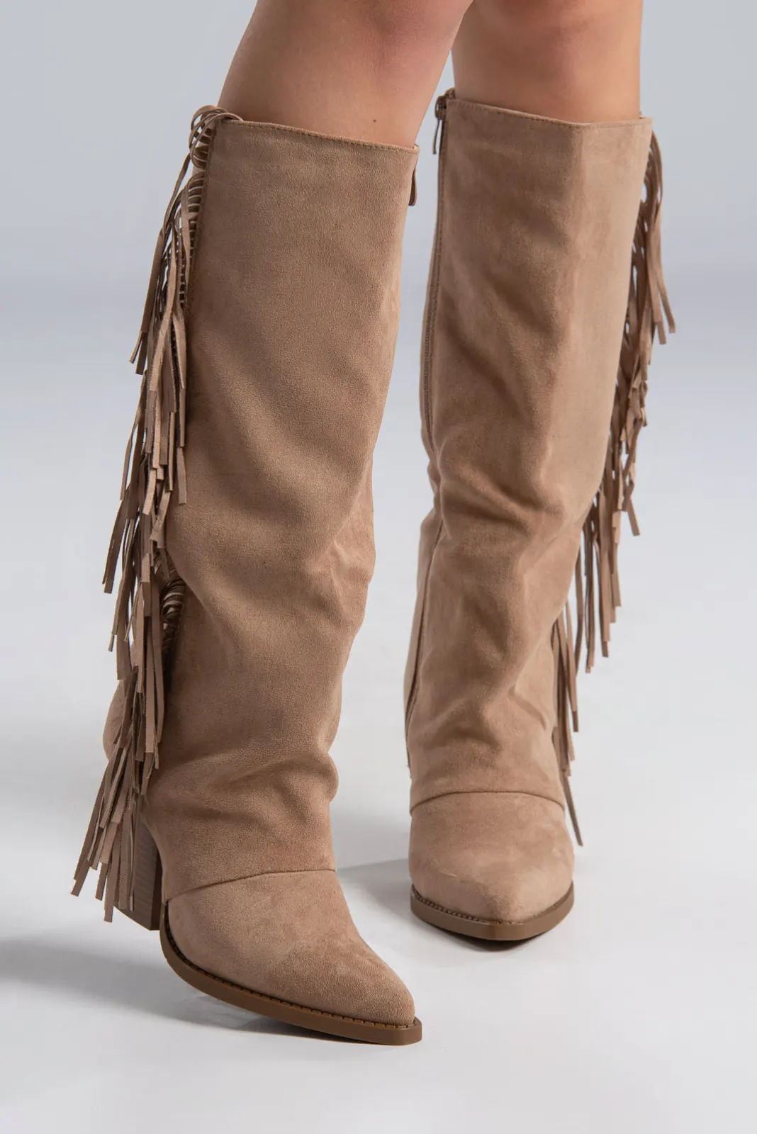 Μπότα cow suede μυτερή. Έχει κρόσσια στο πλάι. Έχει φερμουάρ σε όλο το μήκος στο πλάι. Έχει χοντρό τακούνι με ύψος 8,5cm. Είναι μια θηλυκή επιλογή και ιδανική για κάθε περίσταση.
