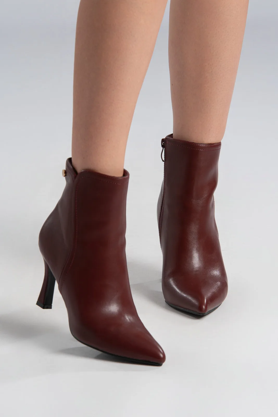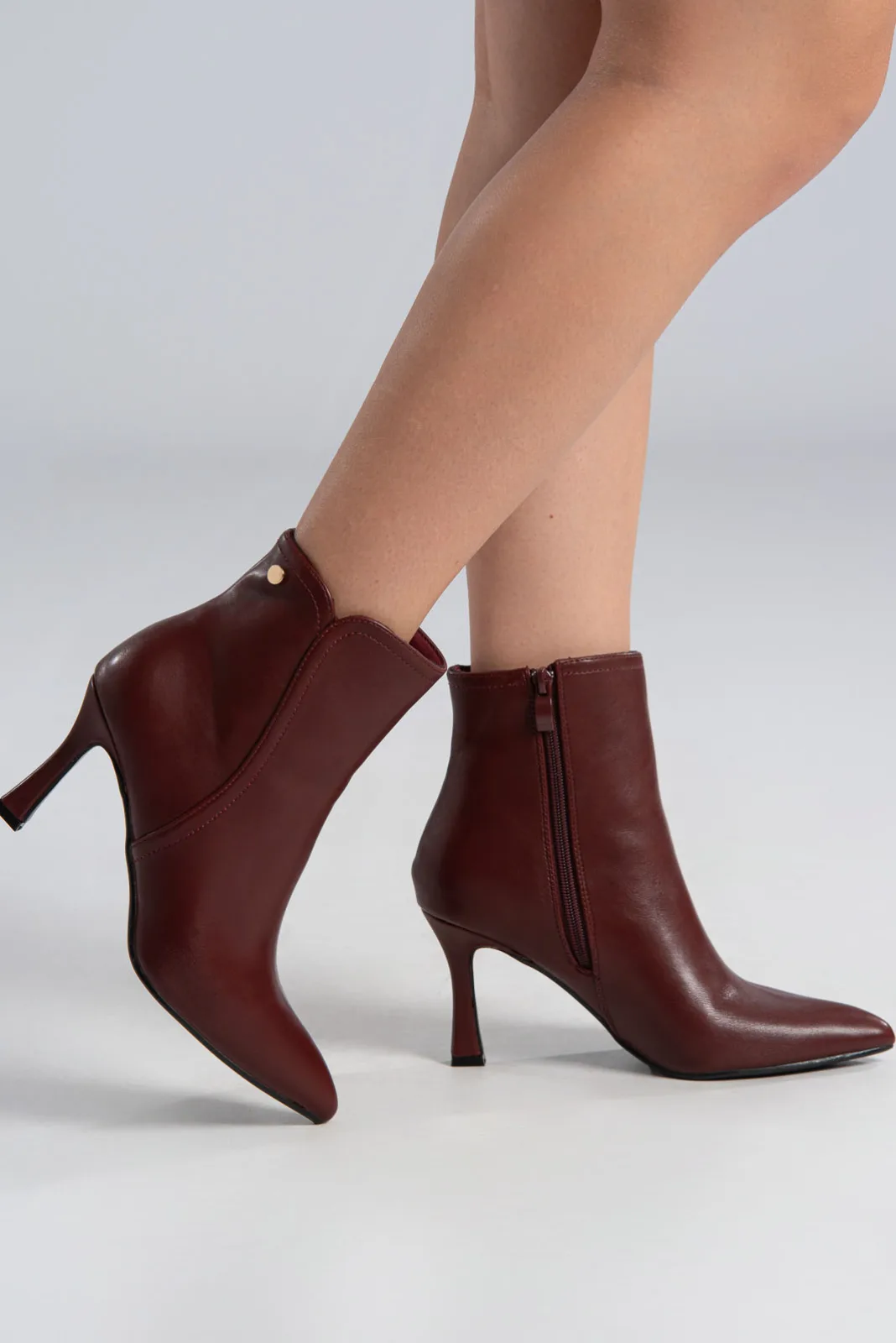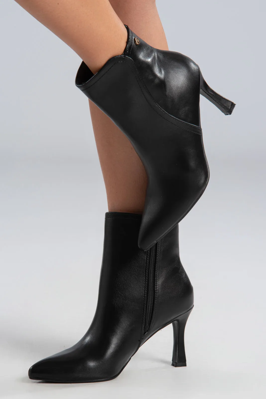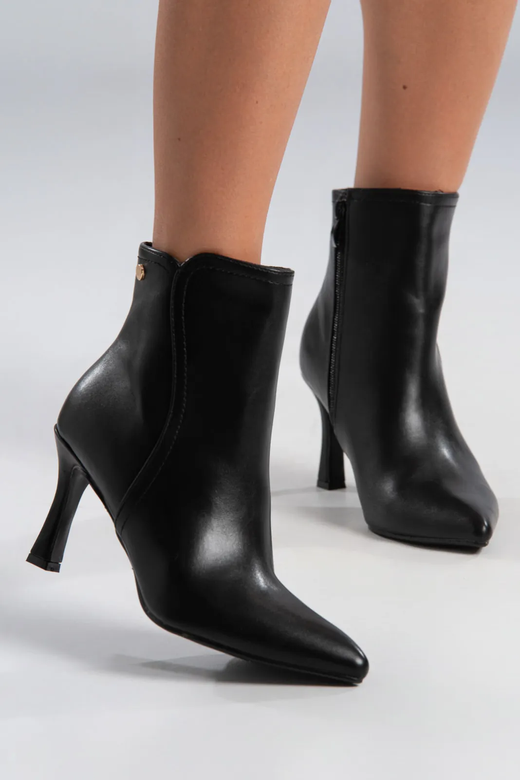 Μποτάκι από εξαιρετικής ποιότητας δερματίνη. Είναι μυτερό μπροστά και κλείνει με φερμουάρ στο πλάι. Στο πλάι έχει διακοσμητικό μεταλλικό στοιχείο. Το τακούνι του έχει ύψος 8cm. Είναι μια θηλυκή επιλογή και δεν πρέπει να λείπει από καμία ντουλάπα.