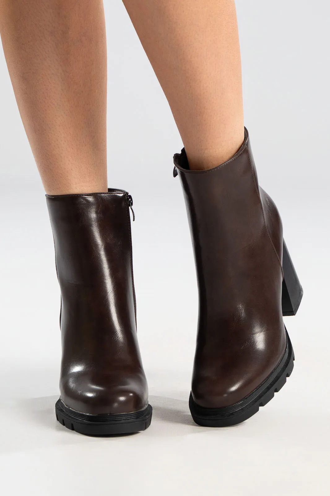 Μποτάκια από εξαιρετικής ποιότητας δερματίνη. Κλείνουν με φερμουάρ στο πλάι. Έχουν υπερυψωμένη σόλα, τρακτερωτό πάτο και στρογγυλή μύτη. Το μπροστινό μέρος έχει ύψος 2cm και το τακούνι 4cm. Η μέτρηση στον πίνακα έχει γίνει στον αστράγαλο.