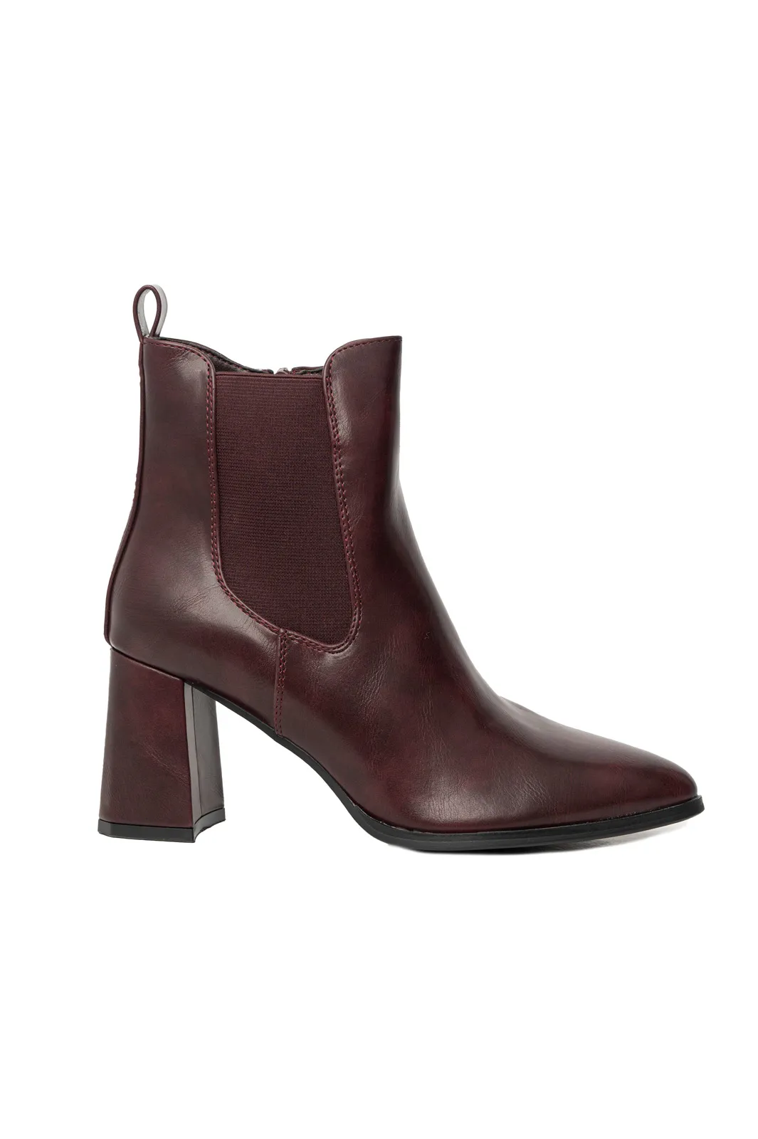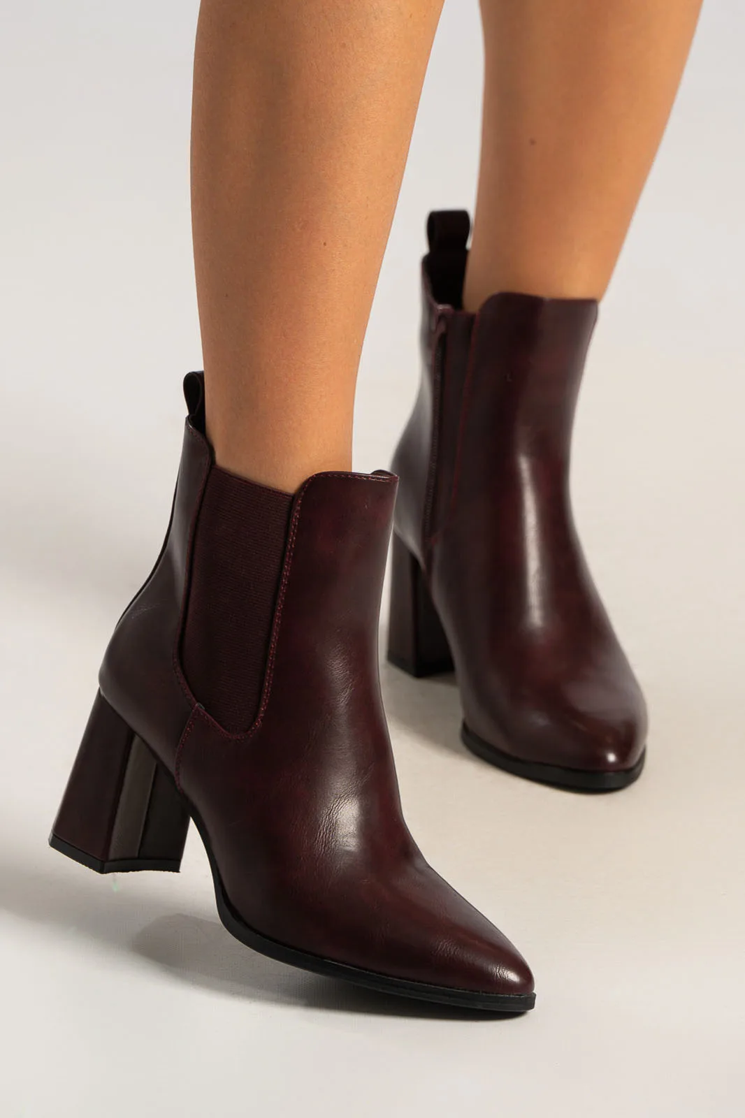 Μποτάκια αστραγάλου από εξαιρετικής ποιότητας δερματίνη. Κλείνουν με φερμουάρ στο πλάι και στην εξωτερική πλευρά έχει λάστιχο για καλύτερη εφαρμογή. Είναι μυτερά και έχει χοντρό τακούνι με ύψος 8cm. Η μέτρηση έχει γίνει στο ύψος του αστραγάλου.