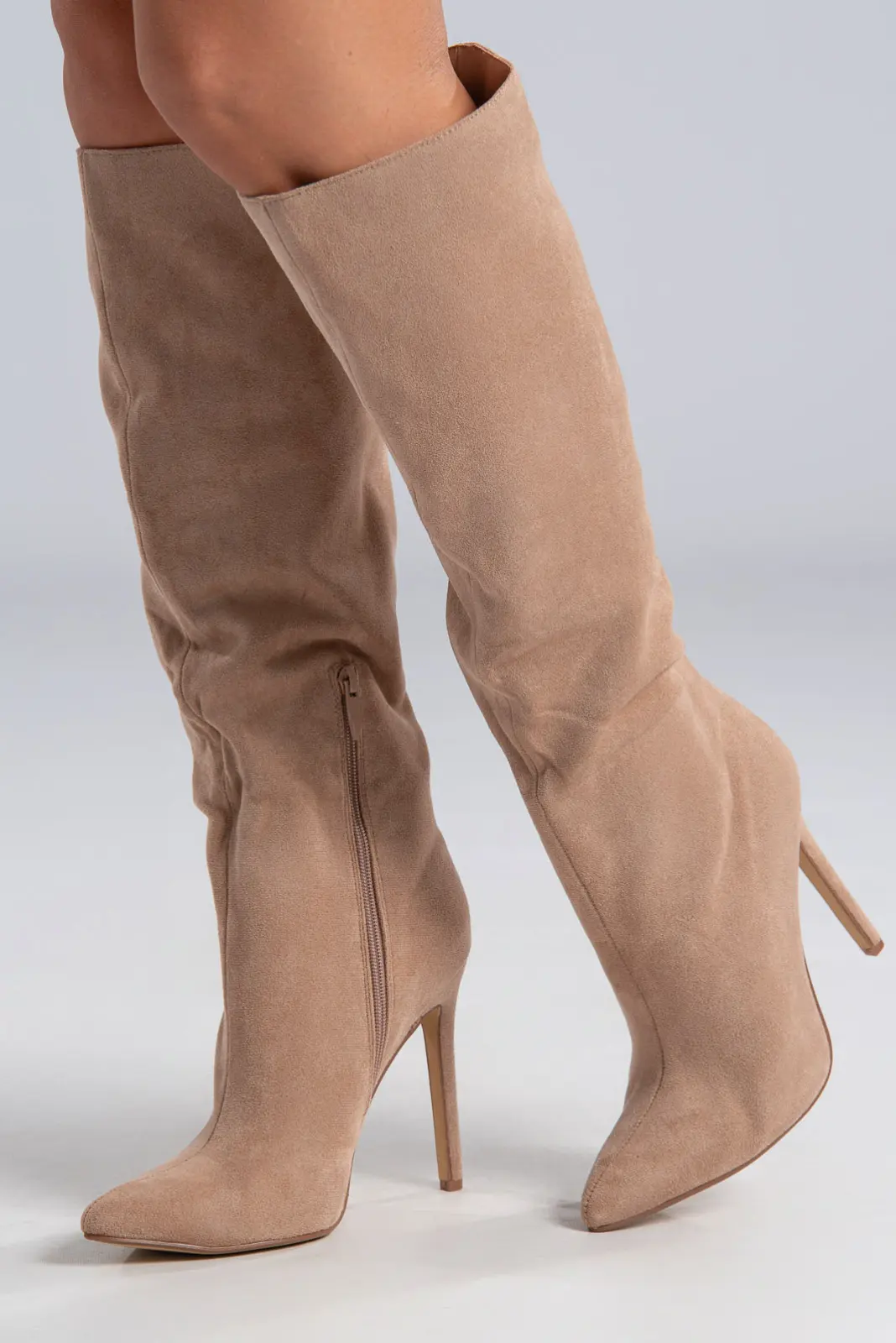 Suede texture boots. They are pointed. They are worn like socks and fasten with a zipper above the ankle. They have a high heel with a length of 12 cm.