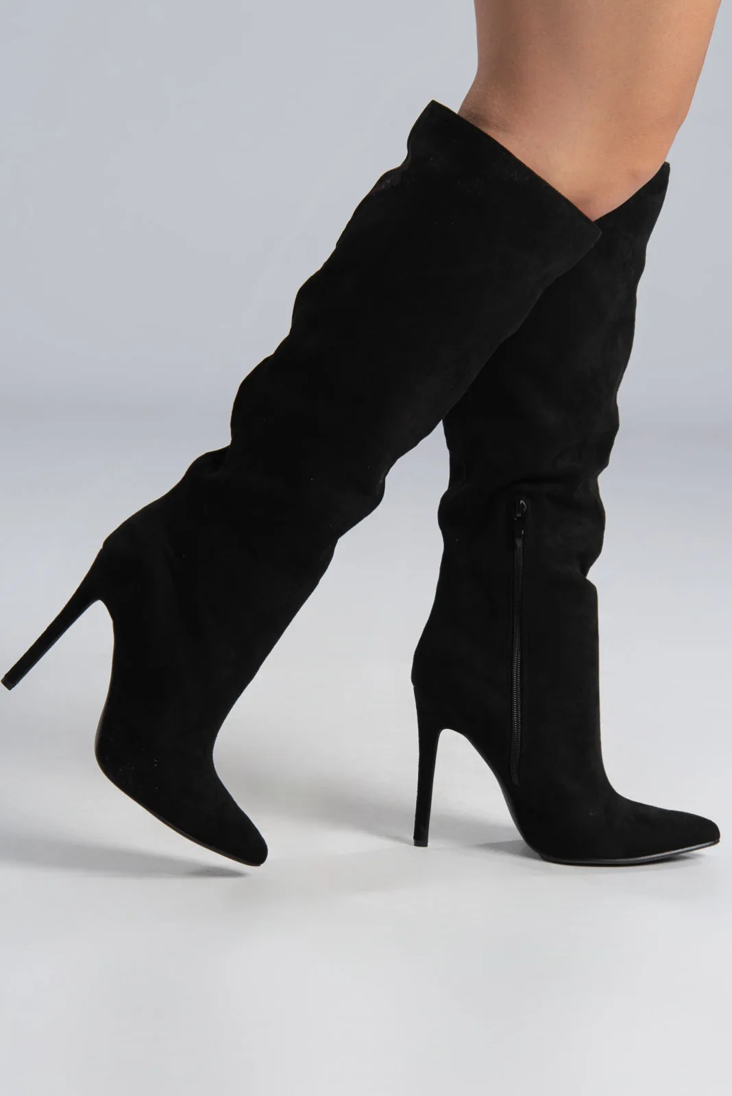 Suede texture boots. They are pointed. They are worn like socks and fasten with a zipper above the ankle. They have a high heel with a length of 12 cm.