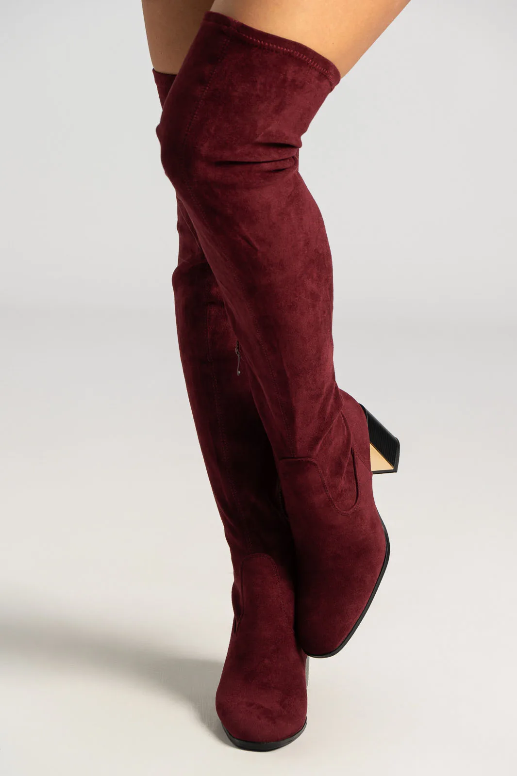Boots with suede texture. They are sock-style and rise above the knee. They have a zipper up to the ankle. The toe is rounded. The heel is thick, 7 cm high. They have metal detailing on the inside. The measurements in the table are taken around the calf, around the leg above the knee, and the length is measured from the ankle to the top.
