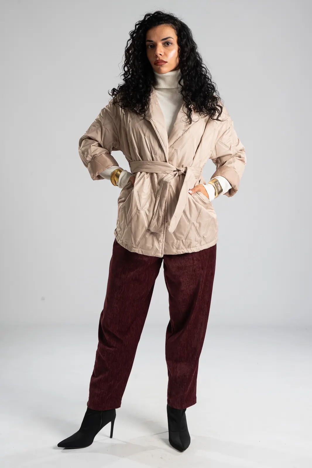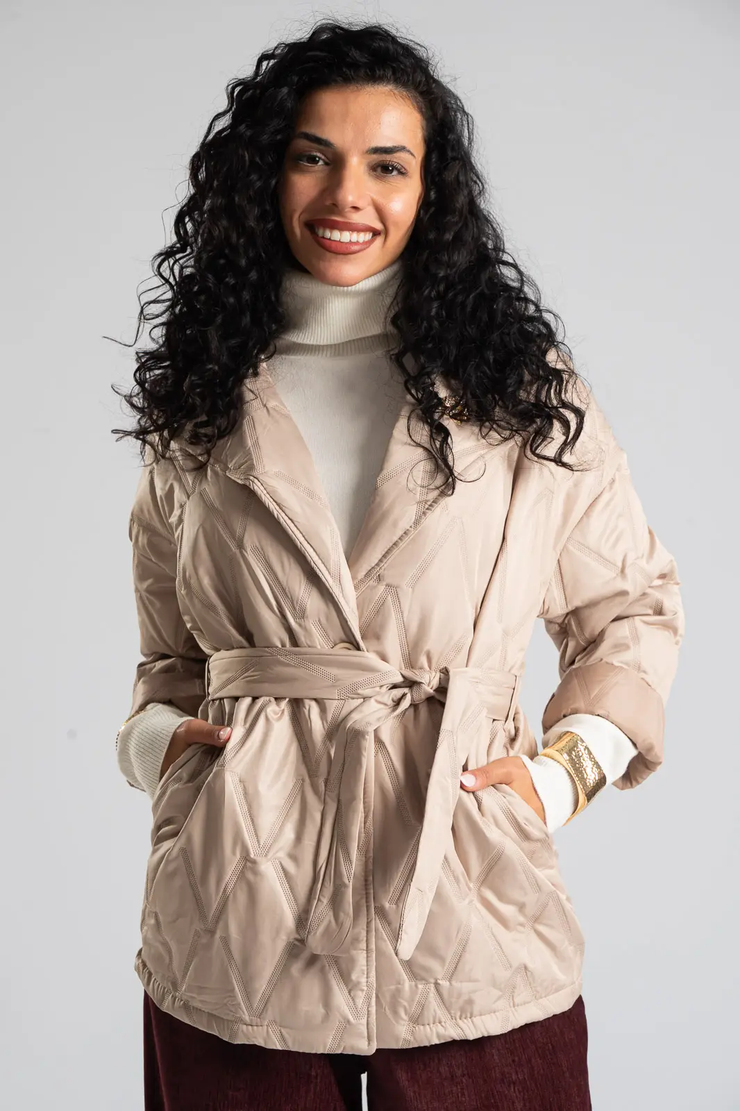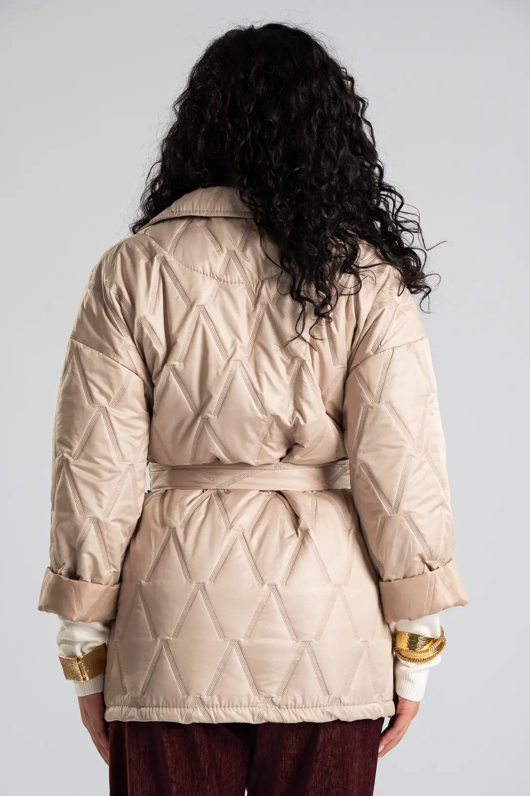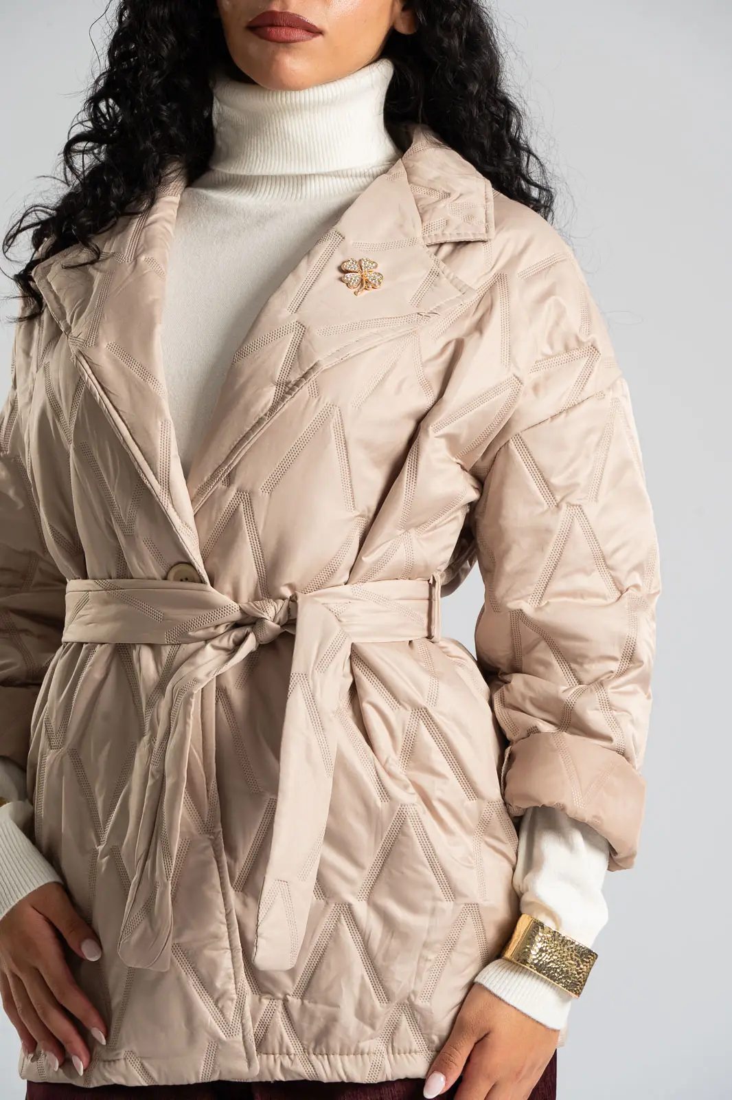 Μπουφάν καπιτονέ με γιακά και πέτο. Κλείνει με κουμπί κάτω από το στήθος και διαθέτει δική του ζώνη με το ίδιο ύφασμα. Τα μανίκια είναι μακριά και διαθέτει αποσπώμενη καρφίτσα. Στα πλαϊνά έχει τσέπες. Η μέτρηση έγινε με κλειστό κουμπί. Οι μετρήσεις του πίνακα είναι αντιπροσωπευτικές για κάθε κωδικό. 100% polyester.