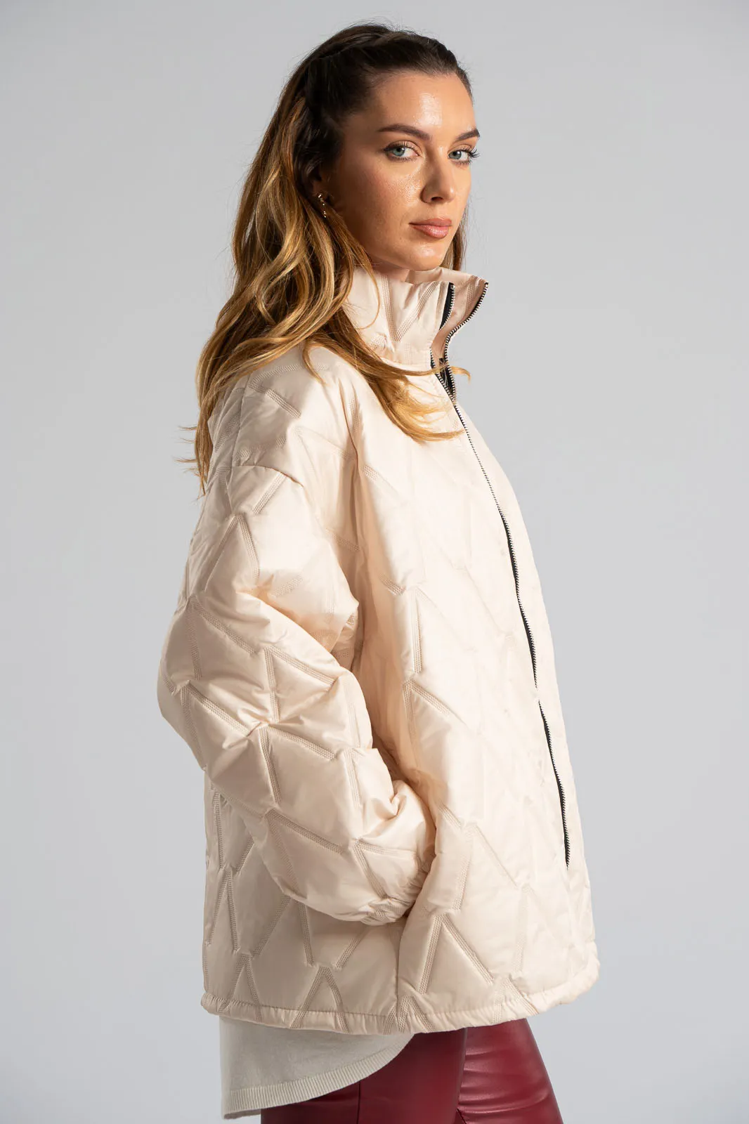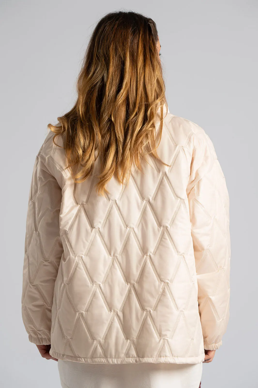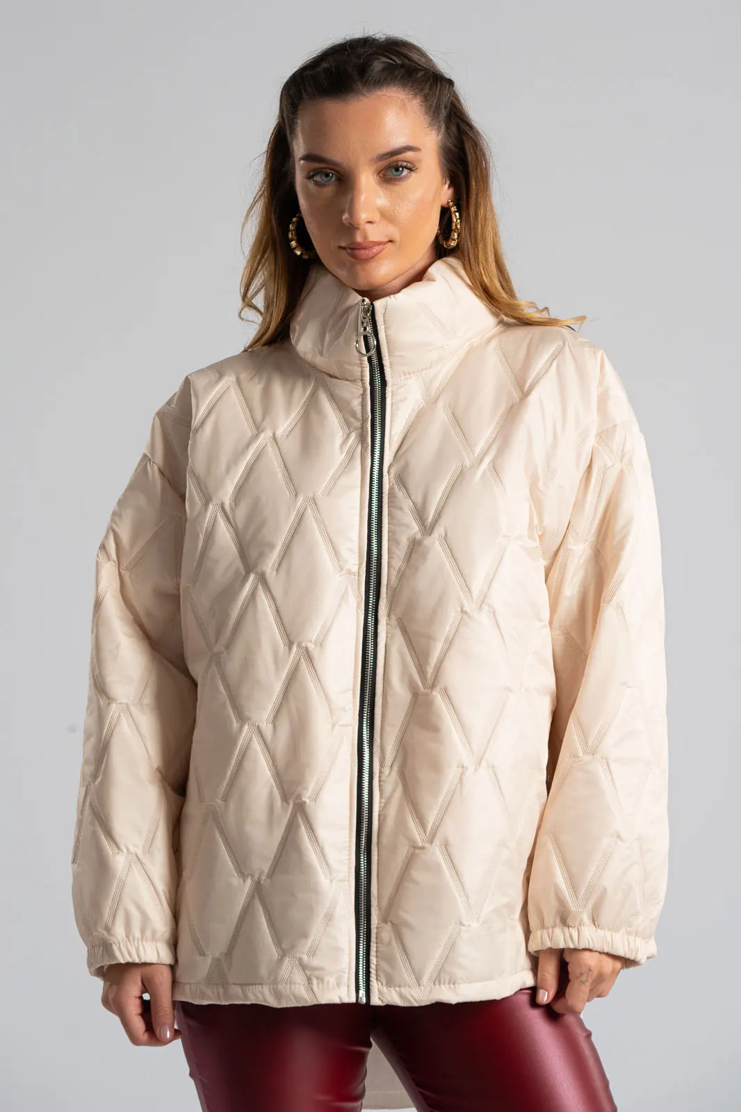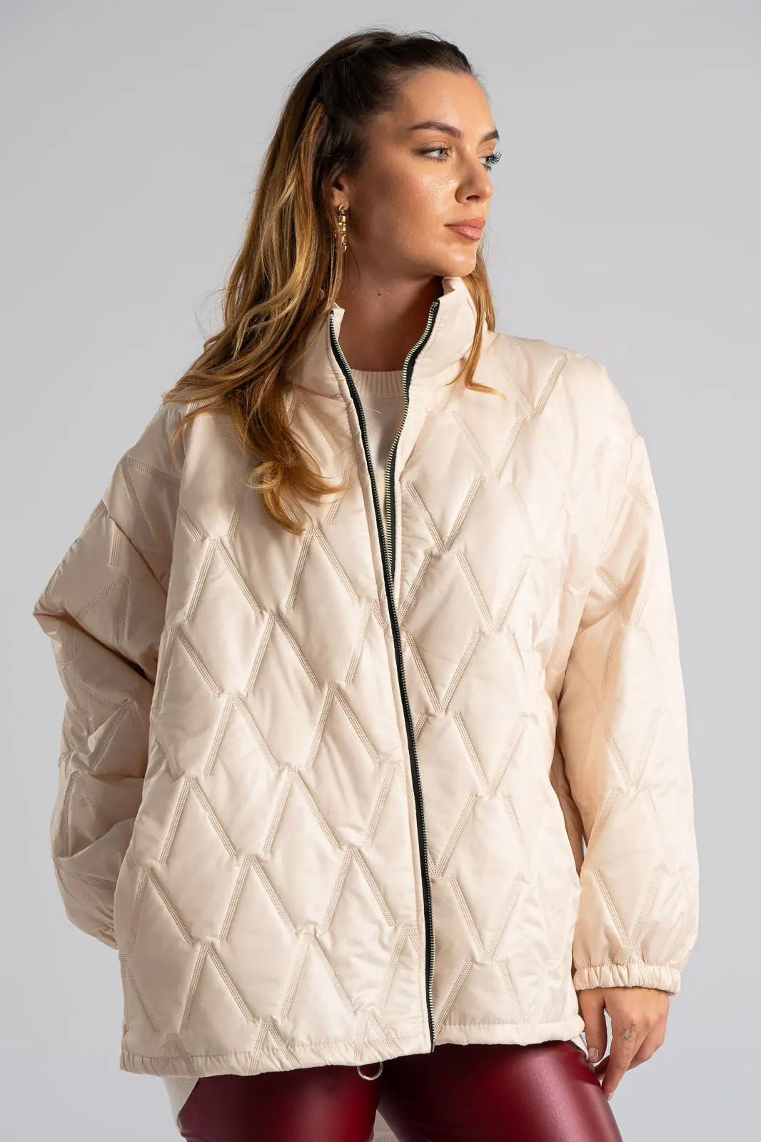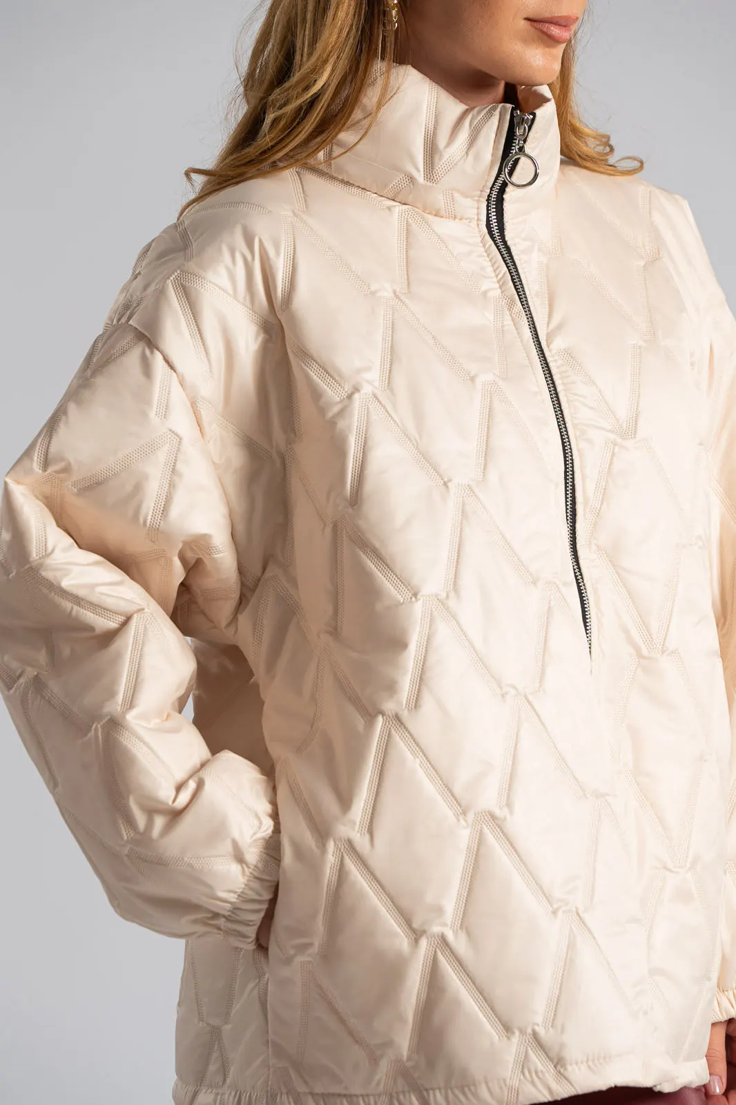 Μπουφάν καπιτονέ. Διαθέτει μακριά μανίκια που καταλήγουν σε λάστιχο. Κλείνει με φερμουάρ, δεν διαθέτει κουκούλα. Στα πλαινά έχει τσέπες. Οι μετρήσεις του πίνακα είναι αντιπροσωπευτικές για κάθε προϊόν. 95% viscose, 5% elastan.