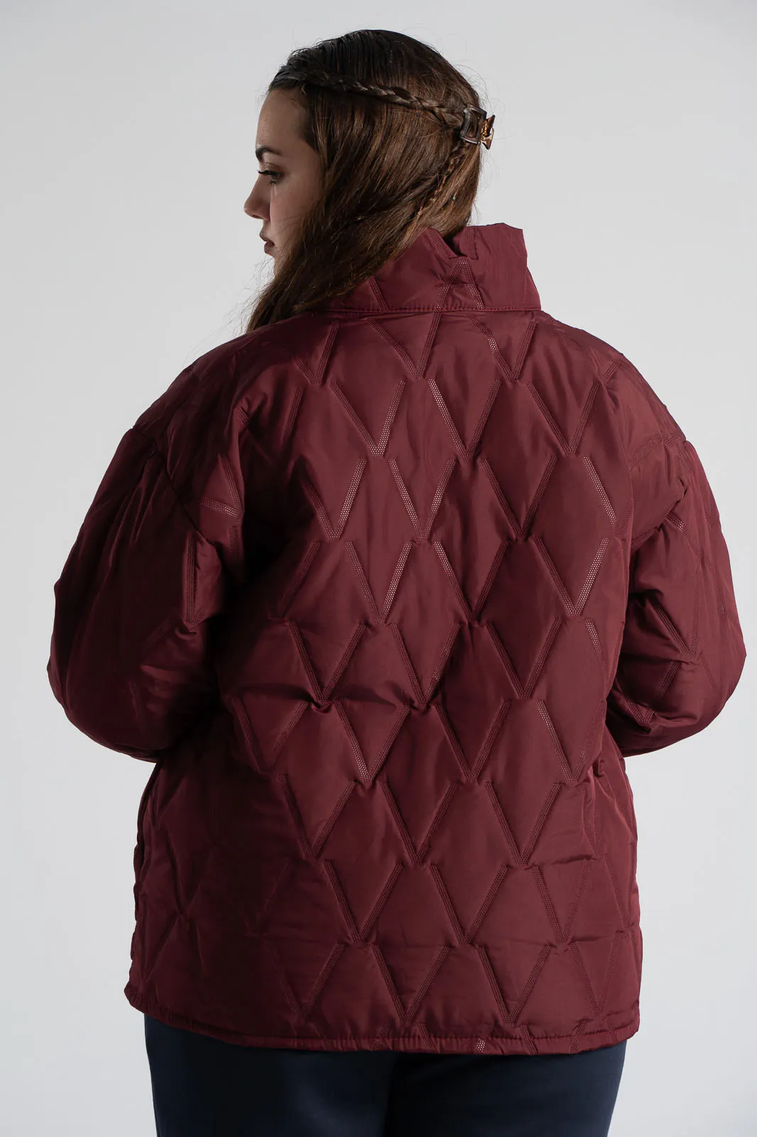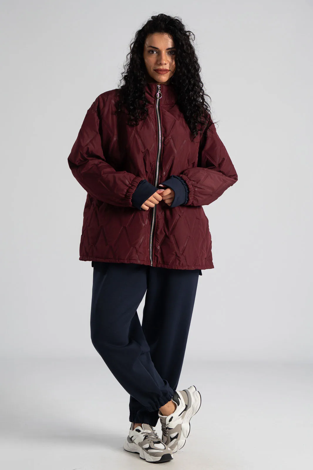Quilted jacket. It has long sleeves that end in elastic. It closes with a zipper and does not have a hood. It has pockets on the sides. The measurements in the table are representative for each product. 95% viscose, 5% elastane.