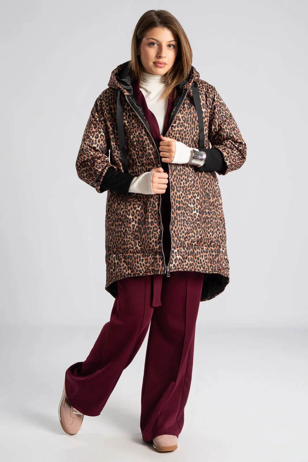 Μπουφάν τύπου καπιτονέ. Κλείνει με φερμουάρ και διαθέτει κουκούλα με κορδόνι. Έχει μακριά μανίκια που καταλήγουν σε τελείωμα φούτερ. Στο μπροστινό μέρος έχει τσέπες. Στο πίσω μέρος είναι πιο μακρύ και έχει στρογγυλό κόψιμο. Η μέτρηση έχει γίνει με κλειστό φερμουάρ. Σε όλη την επιφάνεια διαθέτει leopar pattern. Οι μετρήσεις του πίνακα είναι αντιπροσωπευτικές για κάθε κωδικό. 100% polyester.