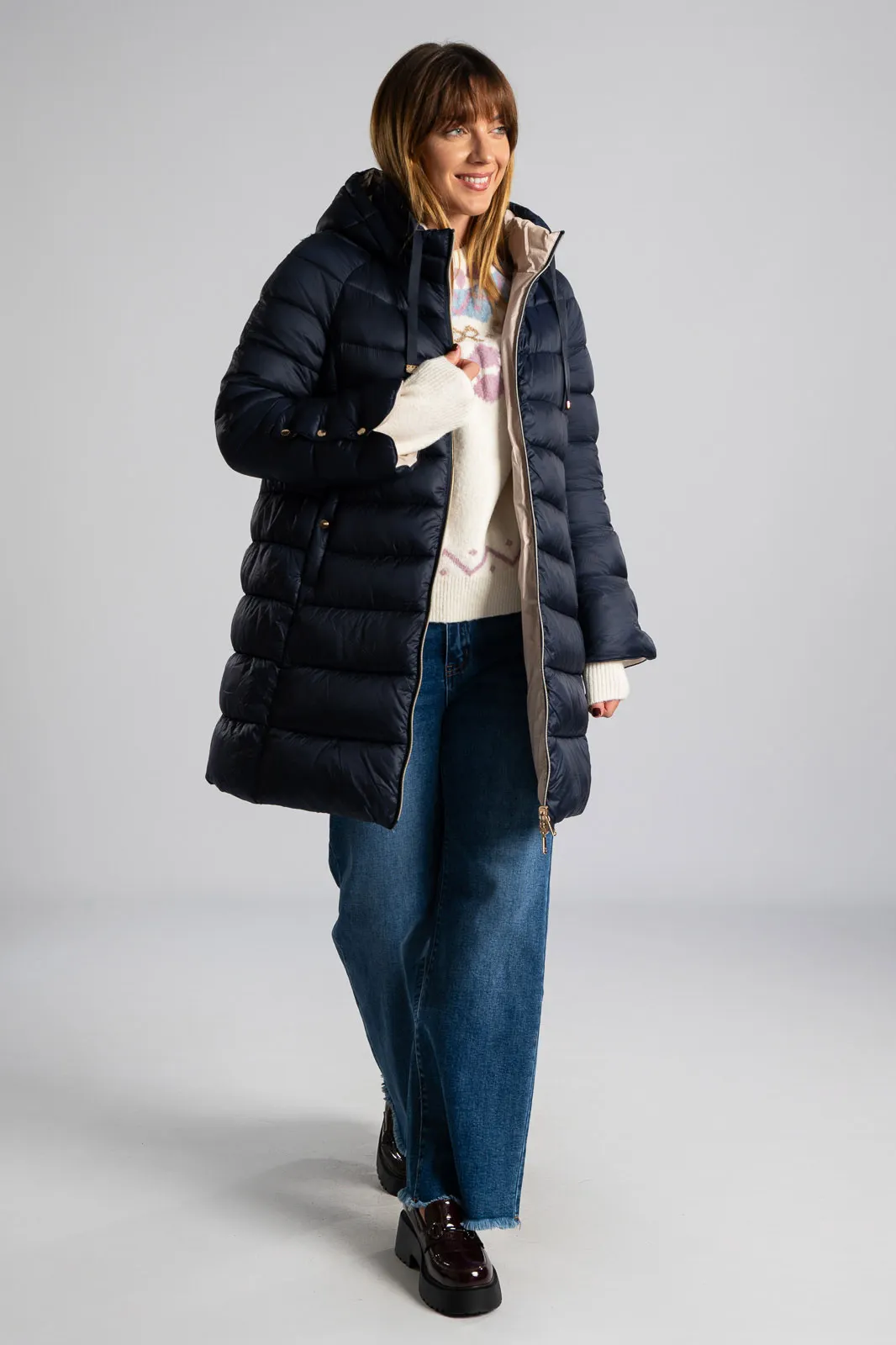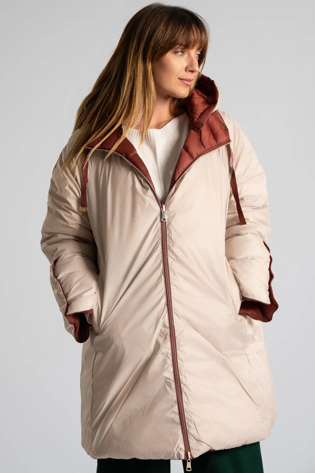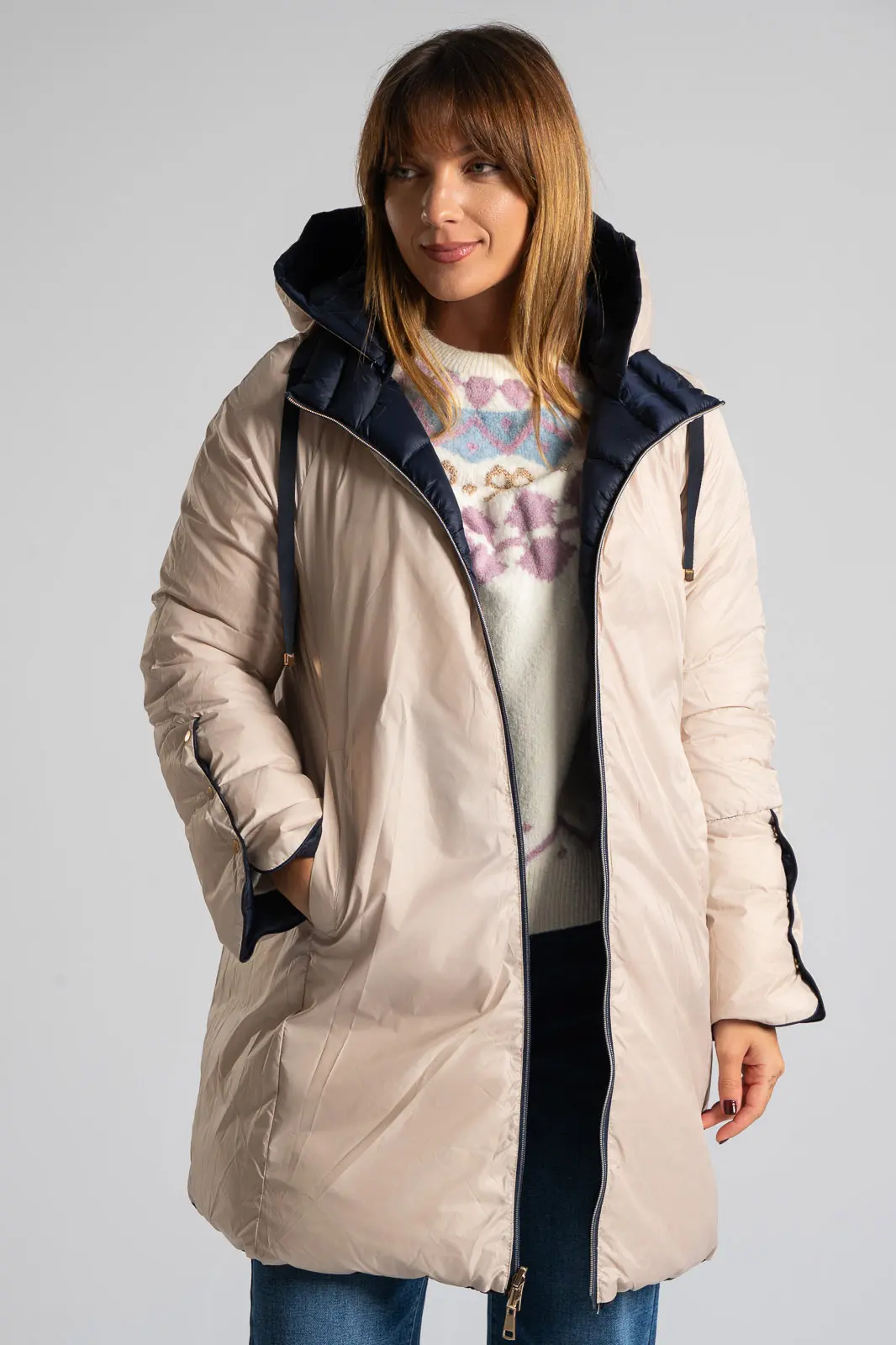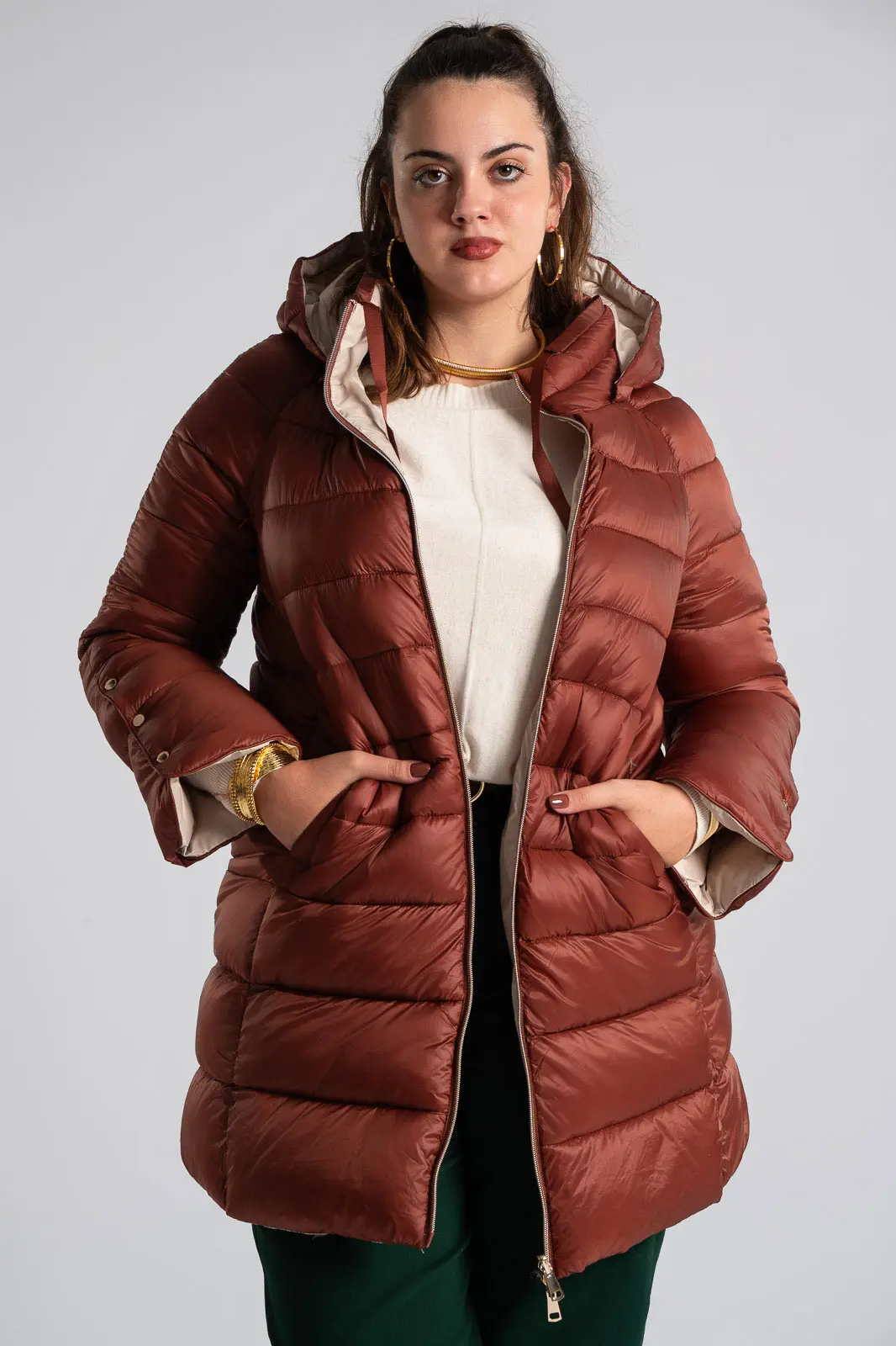 Double-sided puffer jacket. It has long sleeves that close with zippers. It has a double zipper and offers flexibility. It has a hood with a drawstring for a better fit. It has pockets on the sides that close with buttons. The measurements in the table are representative of each product. 100% polyester.