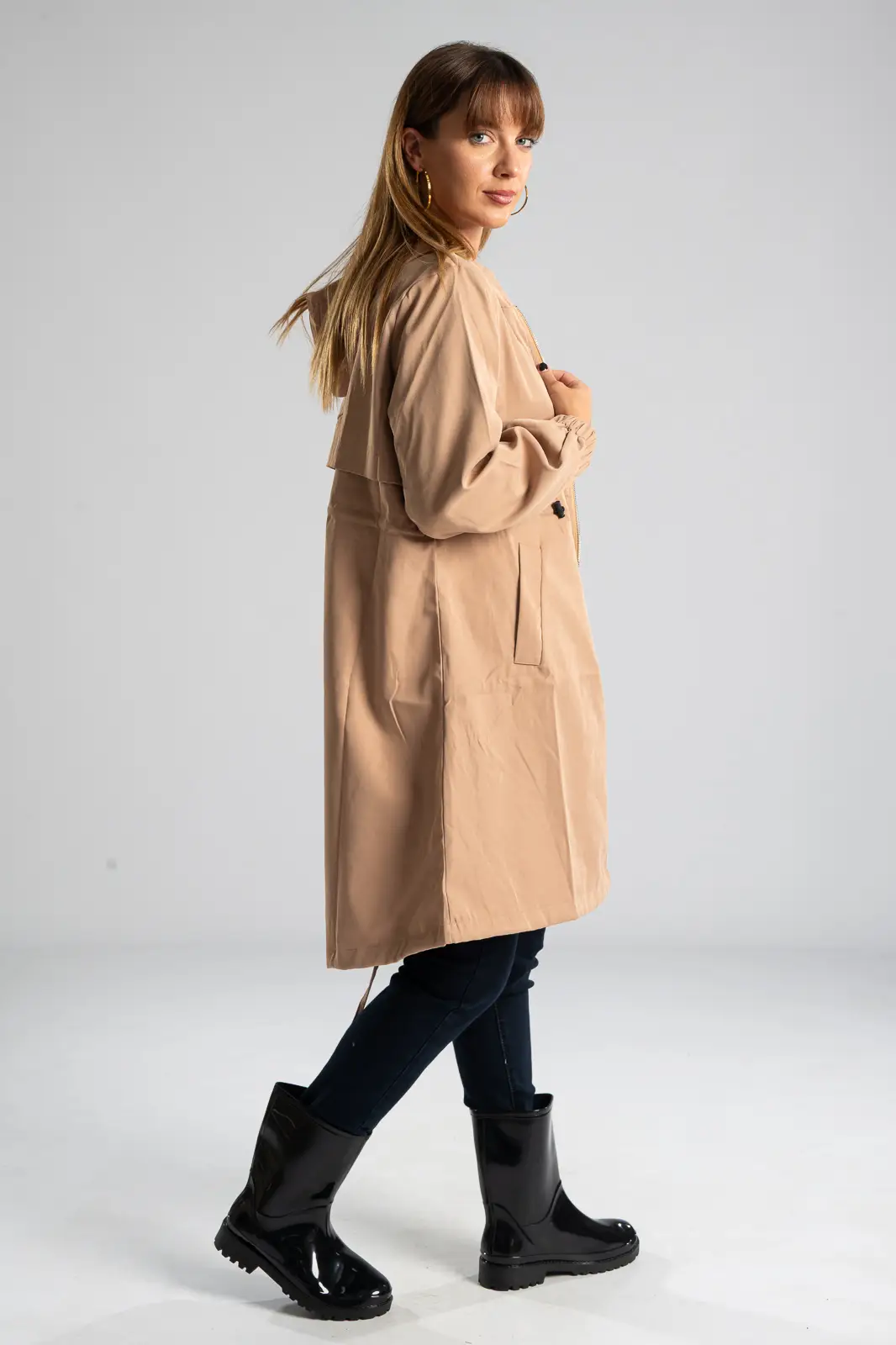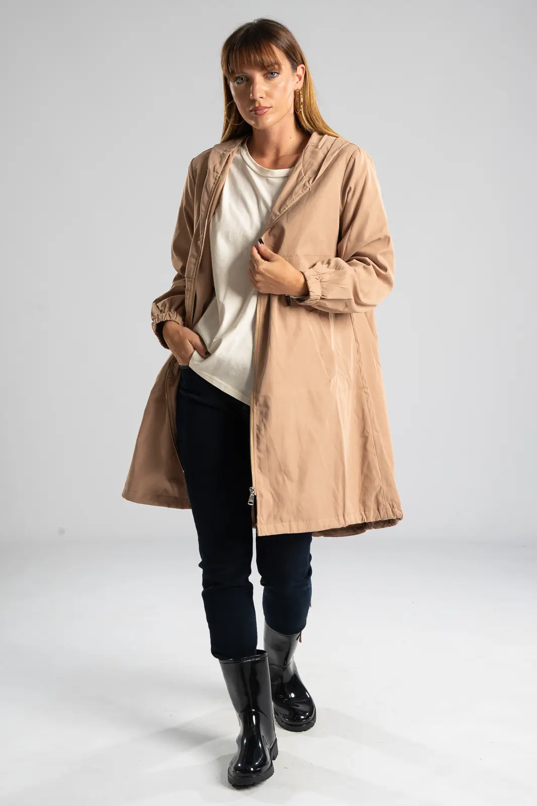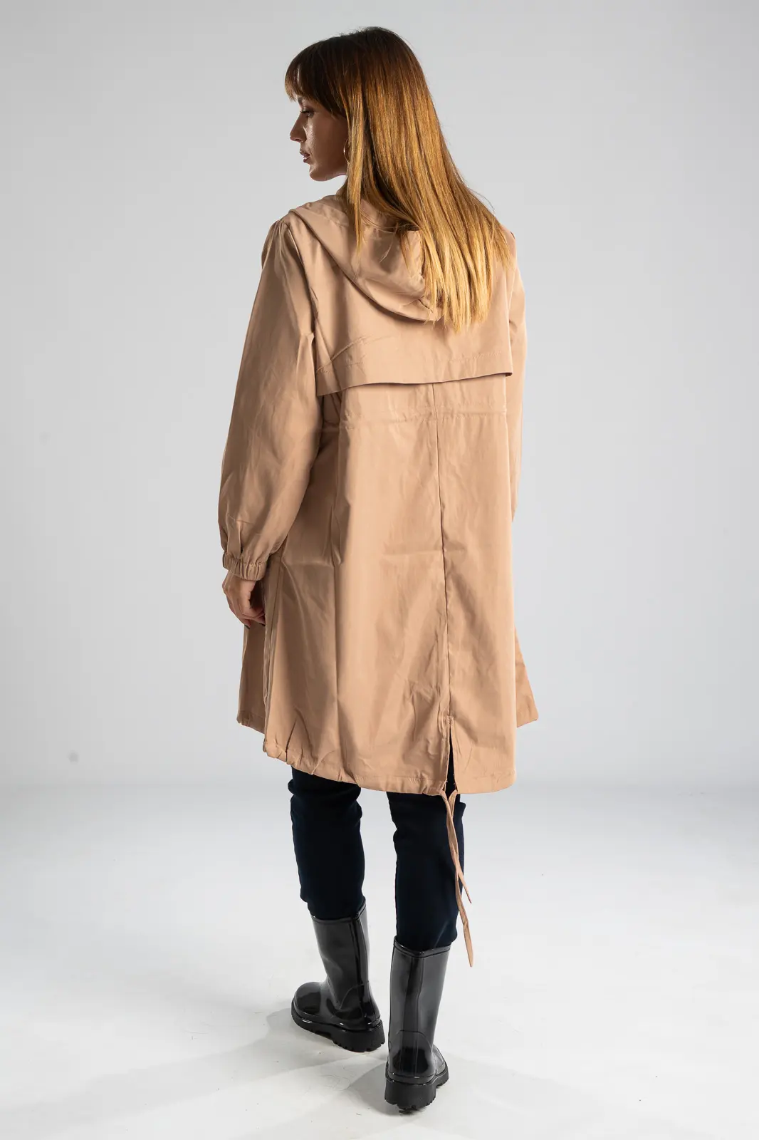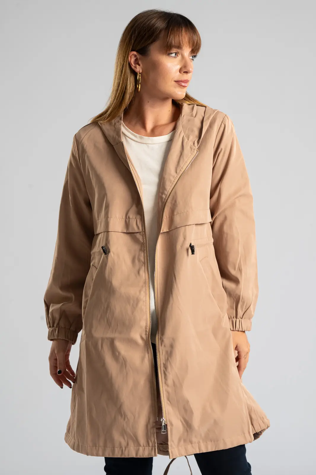 Cappuccino-style jacket It has a fixed hood. The sleeves are long and end in elastic. It has an internal drawstring at the waist for a better fit. It has pockets on the front. The back is longer and has an adjustable drawstring. It is lined on the inside. Measurements are taken with the zipper closed. The measurements in the table are representative for each code. 65% cotton, 35% polyester.