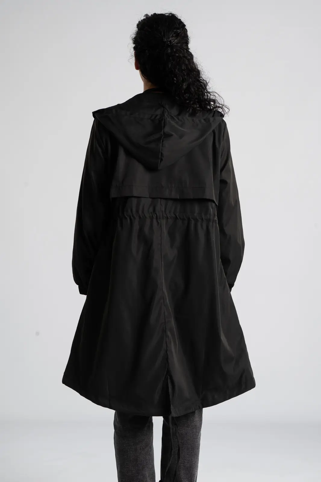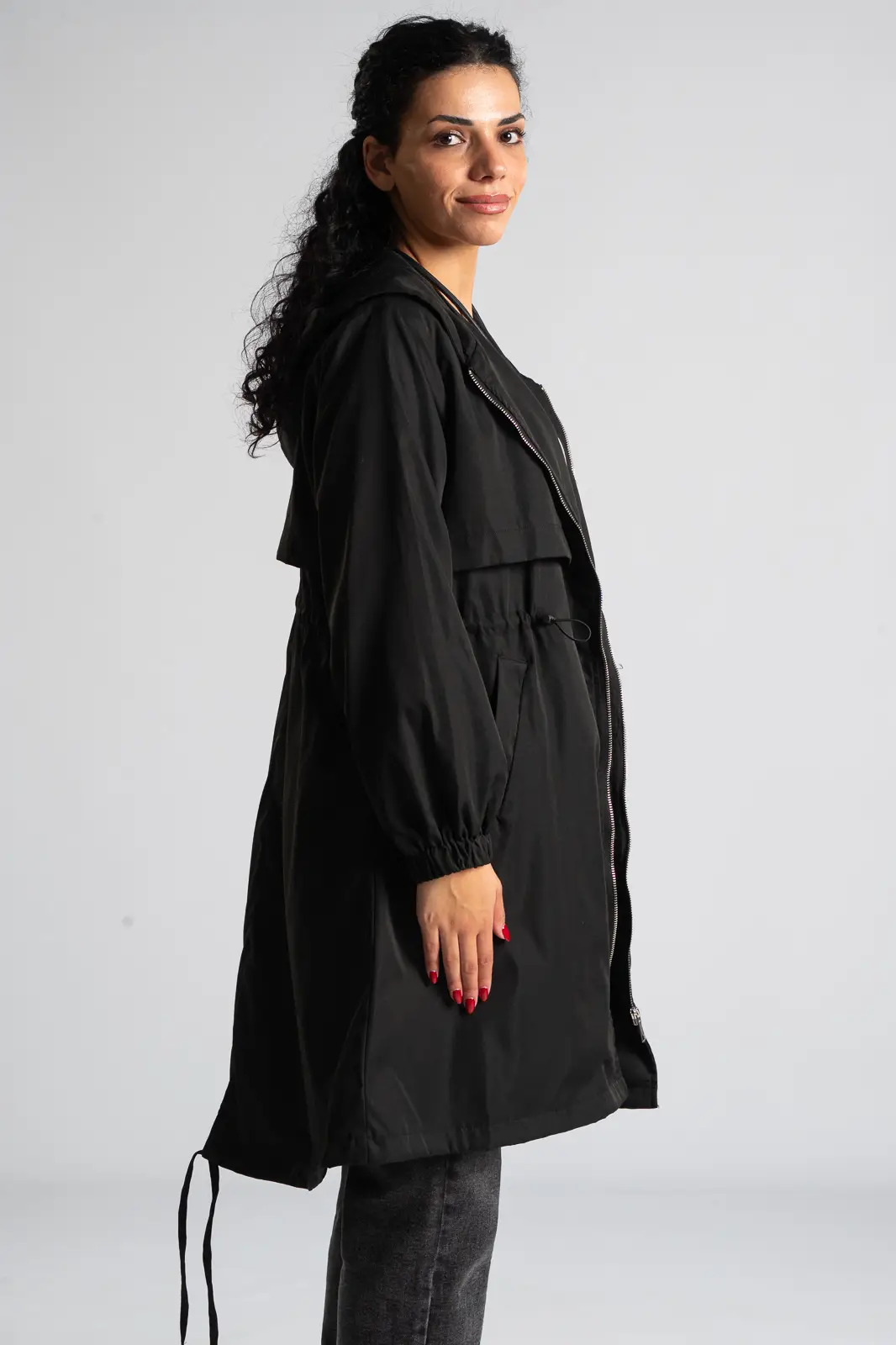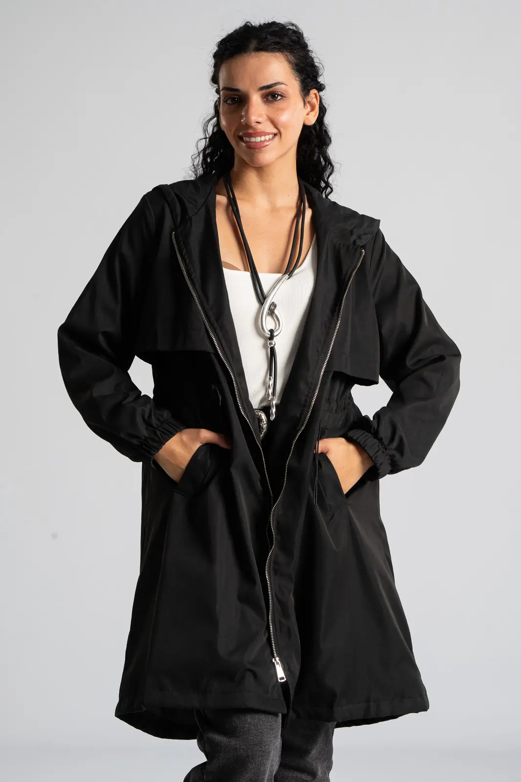 Cappuccino-style jacket It has a fixed hood. The sleeves are long and end in elastic. It has an internal drawstring at the waist for a better fit. It has pockets on the front. The back is longer and has an adjustable drawstring. It is lined on the inside. Measurements are taken with the zipper closed. The measurements in the table are representative for each code. 65% cotton, 35% polyester.