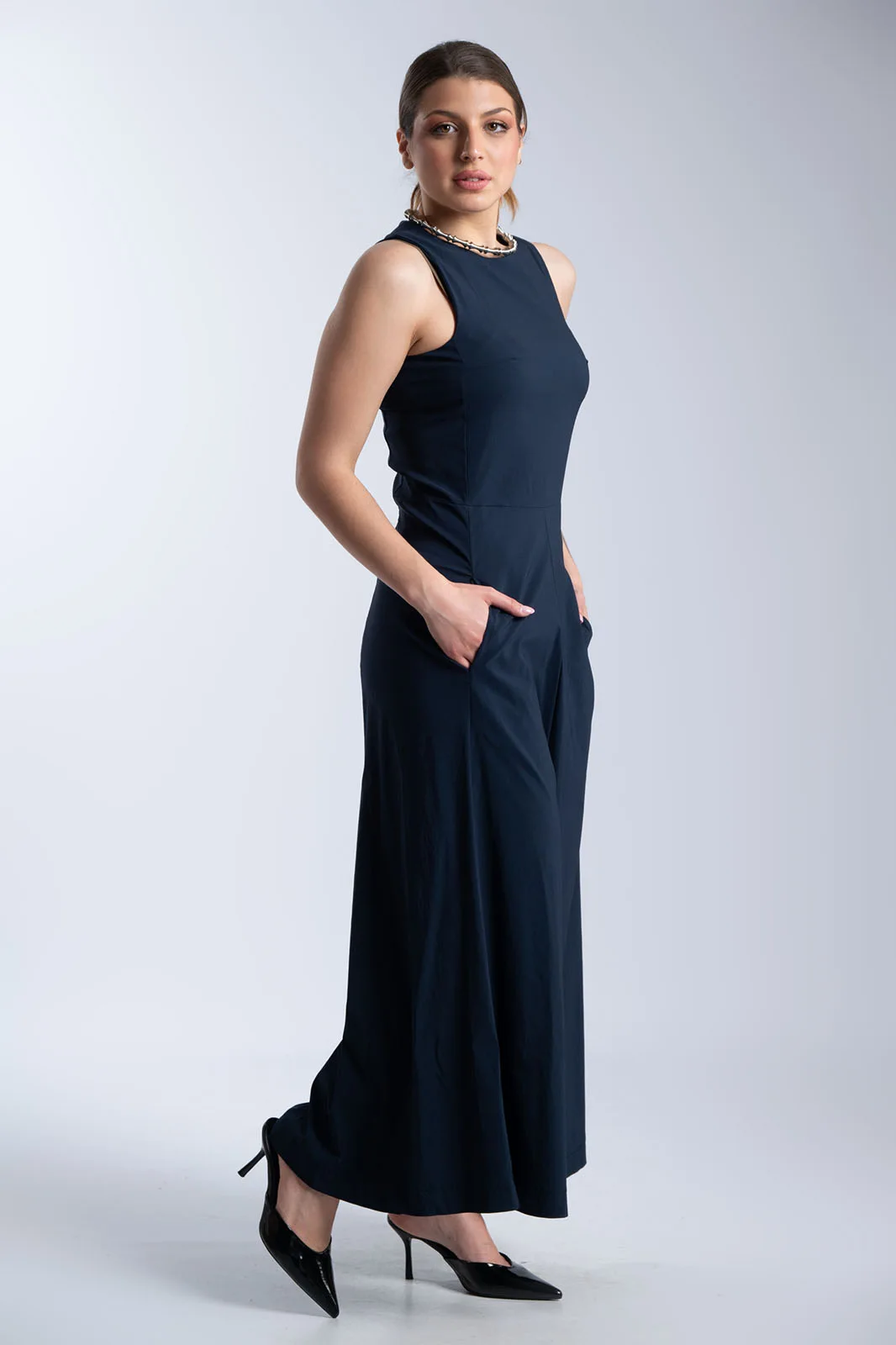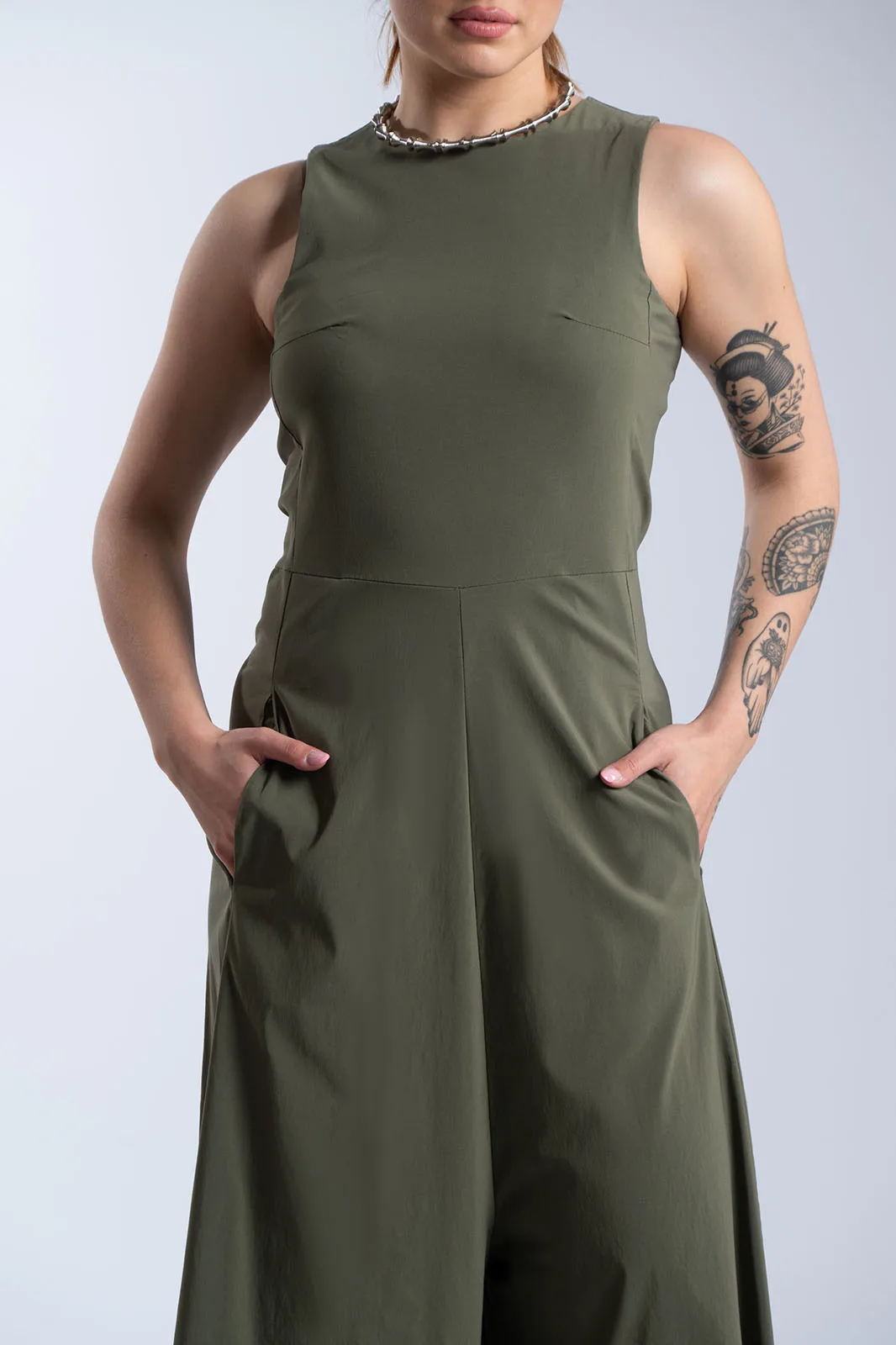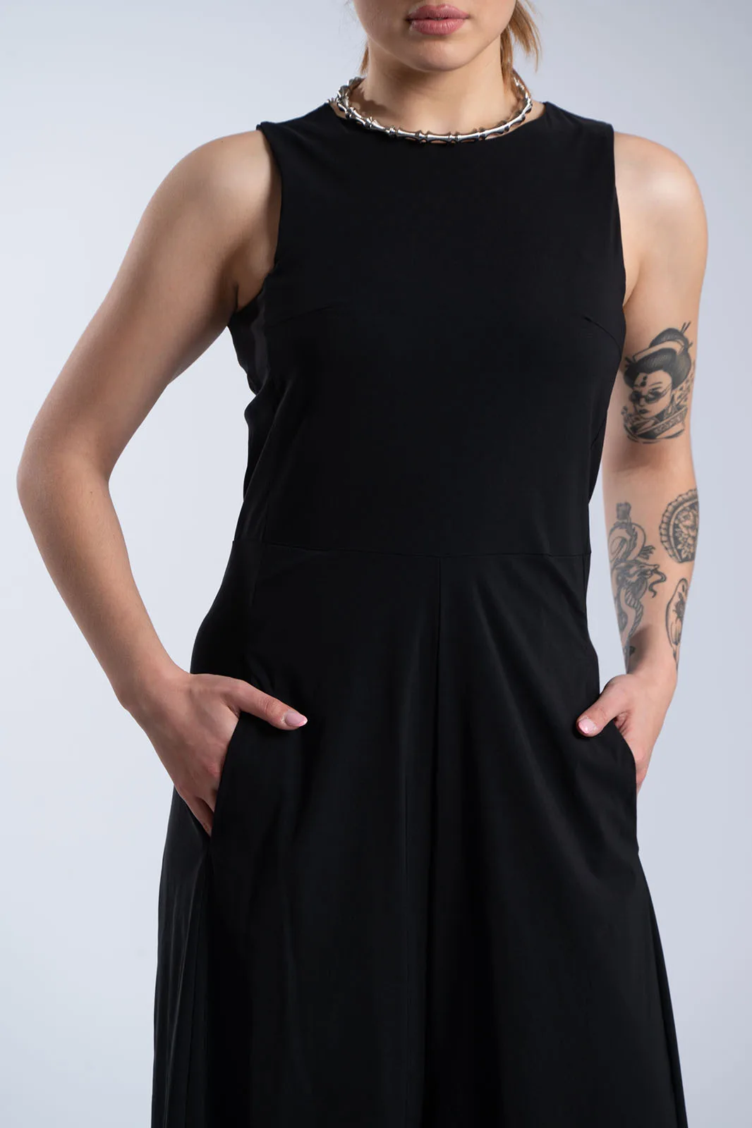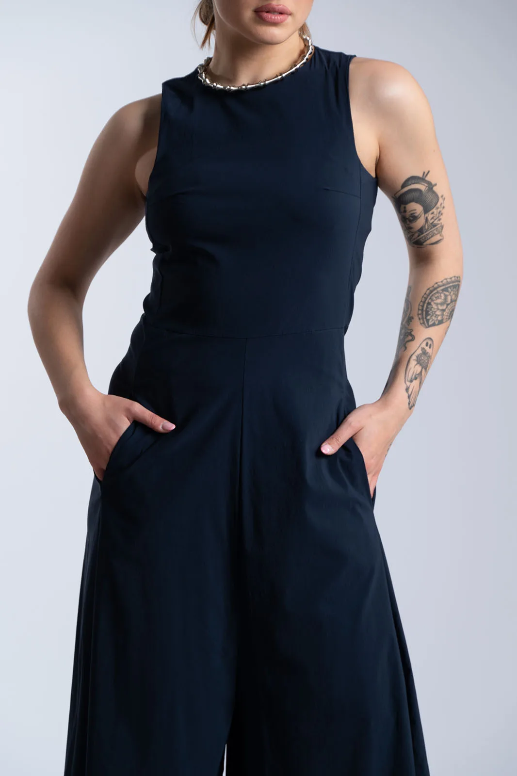 Κομψή ολόσωμη φόρμα με minimal αισθητική και άνετη γραμμή. Διαθέτει στρογγυλή λαιμόκοψη και αμάνικο σχέδιο, ενώ η καθαρή γραμμή στο επάνω μέρος δίνει ένα διαχρονικό και sophisticated αποτέλεσμα. Το παντελόνι είναι σε φαρδιά γραμμή, προσφέροντας άνεση και κίνηση, ενώ οι πλαϊνές τσέπες προσθέτουν πρακτικότητα. Κλείνει στο πίσω μέρος με φερμουάρ για εύκολη εφαρμογή και καλύτερη εφαρμογή στο σώμα. Ιδανική επιλογή για όλες τις ώρες, από πρωινές εμφανίσεις έως πιο βραδινά looks.