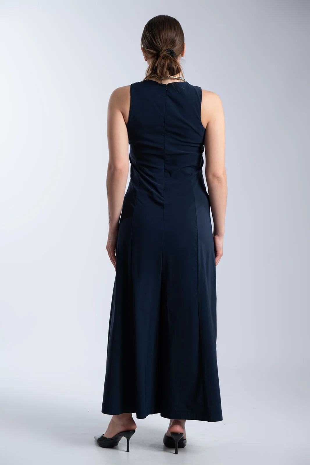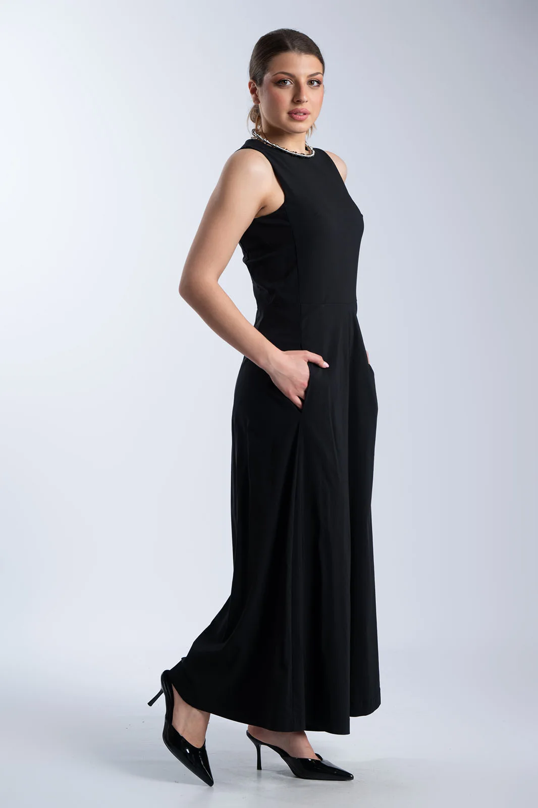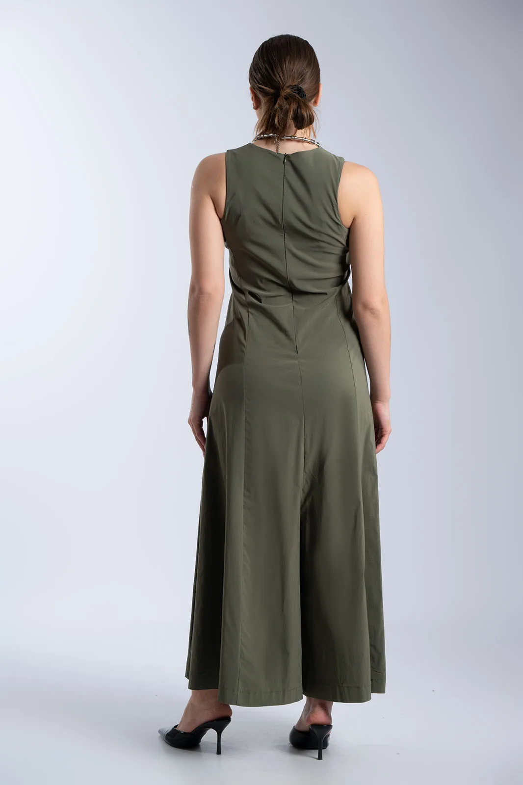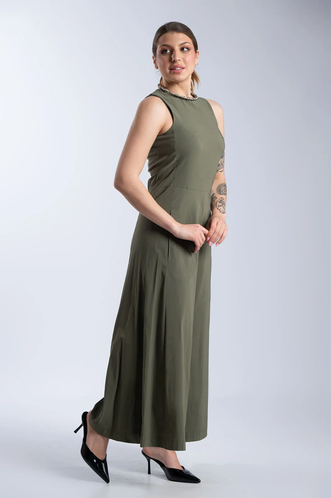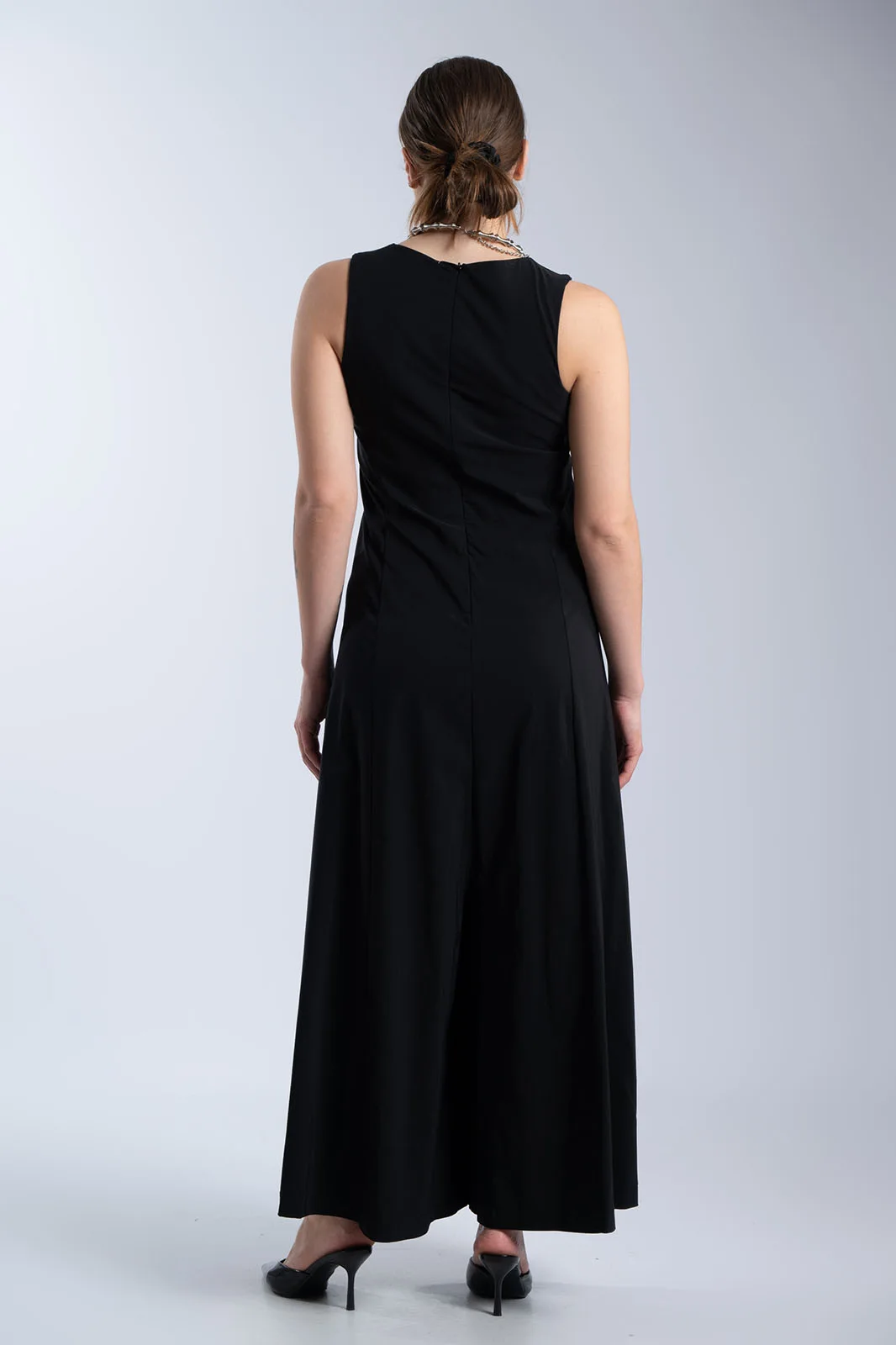 Κομψή ολόσωμη φόρμα με minimal αισθητική και άνετη γραμμή. Διαθέτει στρογγυλή λαιμόκοψη και αμάνικο σχέδιο, ενώ η καθαρή γραμμή στο επάνω μέρος δίνει ένα διαχρονικό και sophisticated αποτέλεσμα. Το παντελόνι είναι σε φαρδιά γραμμή, προσφέροντας άνεση και κίνηση, ενώ οι πλαϊνές τσέπες προσθέτουν πρακτικότητα. Κλείνει στο πίσω μέρος με φερμουάρ για εύκολη εφαρμογή και καλύτερη εφαρμογή στο σώμα. Ιδανική επιλογή για όλες τις ώρες, από πρωινές εμφανίσεις έως πιο βραδινά looks.