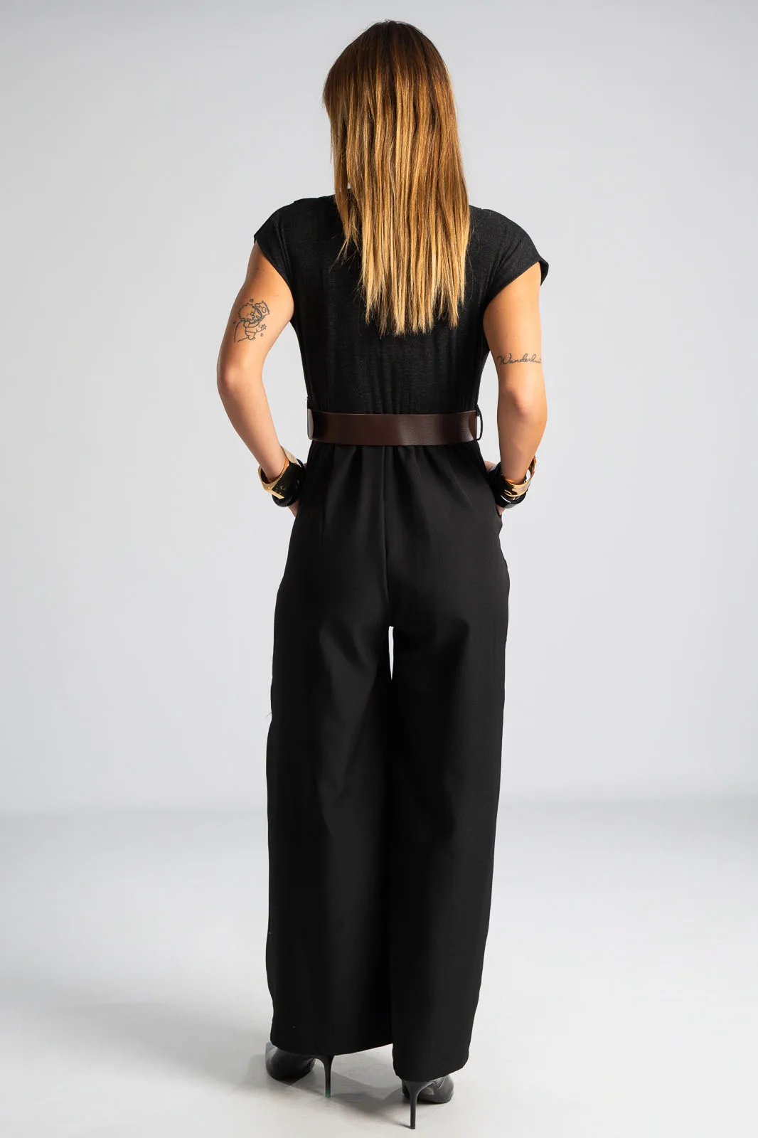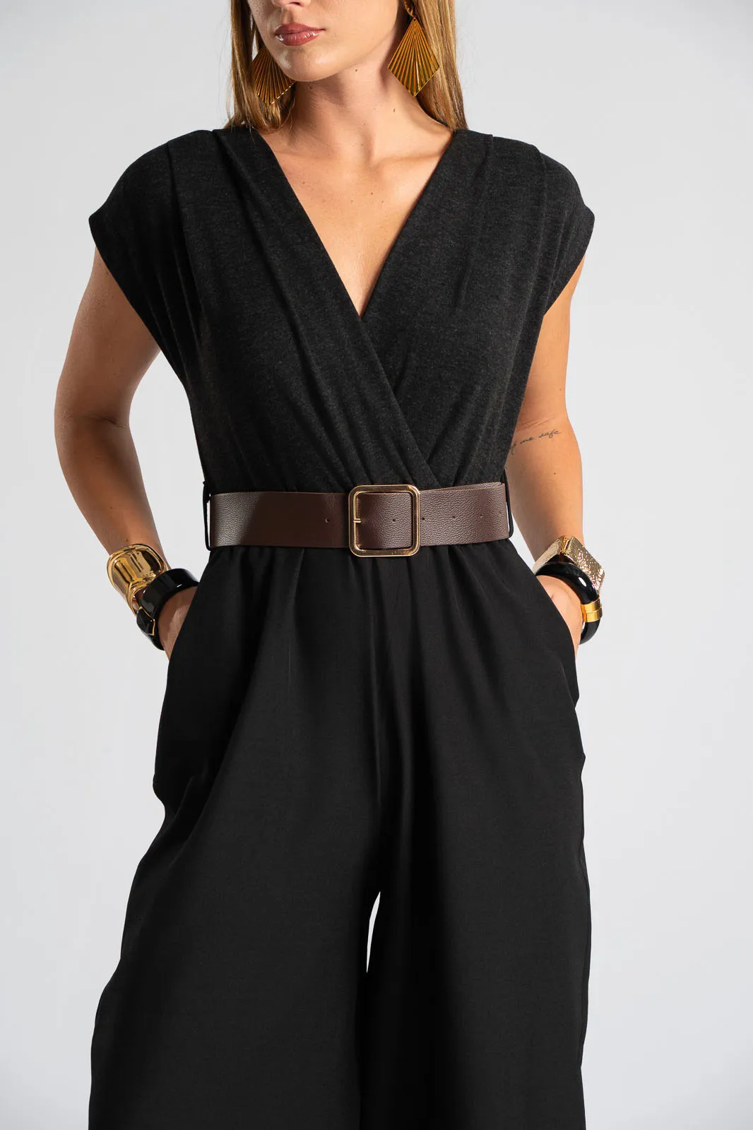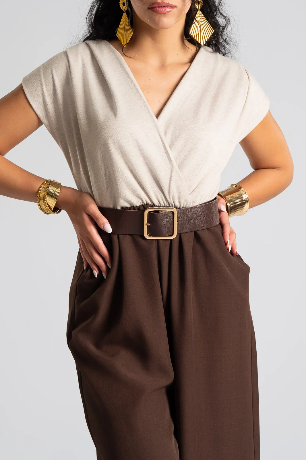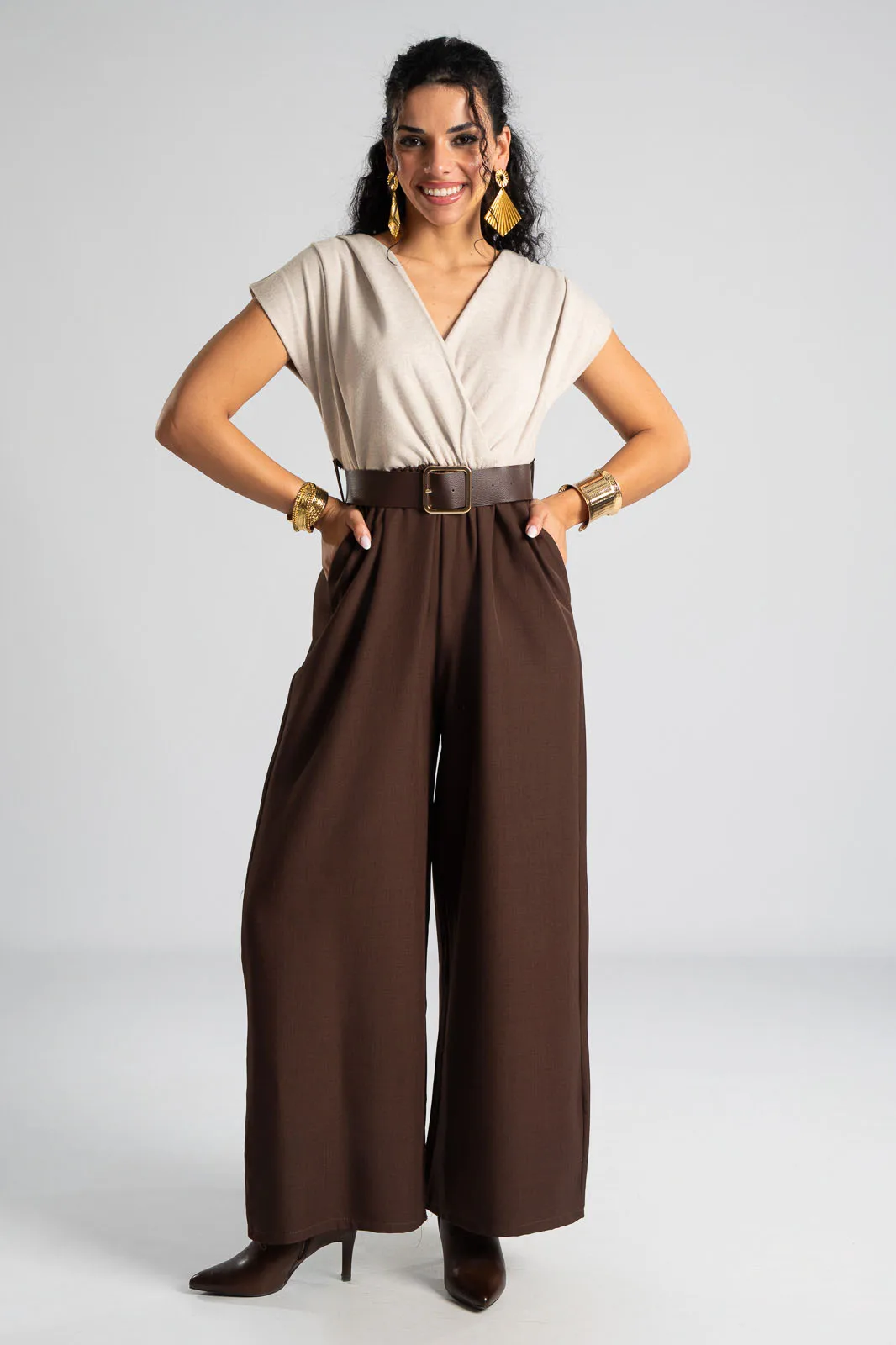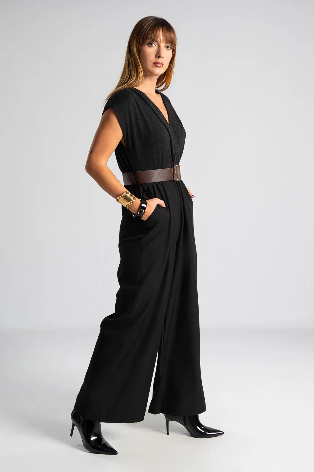 Ολόσωμη φόρμα αμάνικη. Στο πάνω μέρος είναι κρουαζέ. Στη μέση διαθέτει λάστιχο για καλύτερη εφαρμογή και δική της ζώνη δερματίνη. Το παντελόνι έχει ίσια γραμμή και στα πλαϊνά διαθέτει τσέπες. Είναι μια ιδανική επιλογή για κάθε περίσταση. Οι μετρήσεις του πίνακα είναι αντιπροσωπευτικές για κάθε προϊόν. Πάνω μέρος: 69% polyester, 28% viscose, 3% elastan. Κάτω μέρος: 100% polyester.