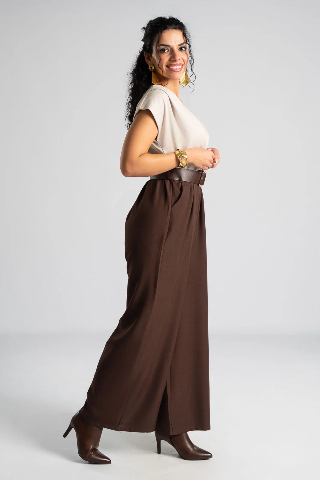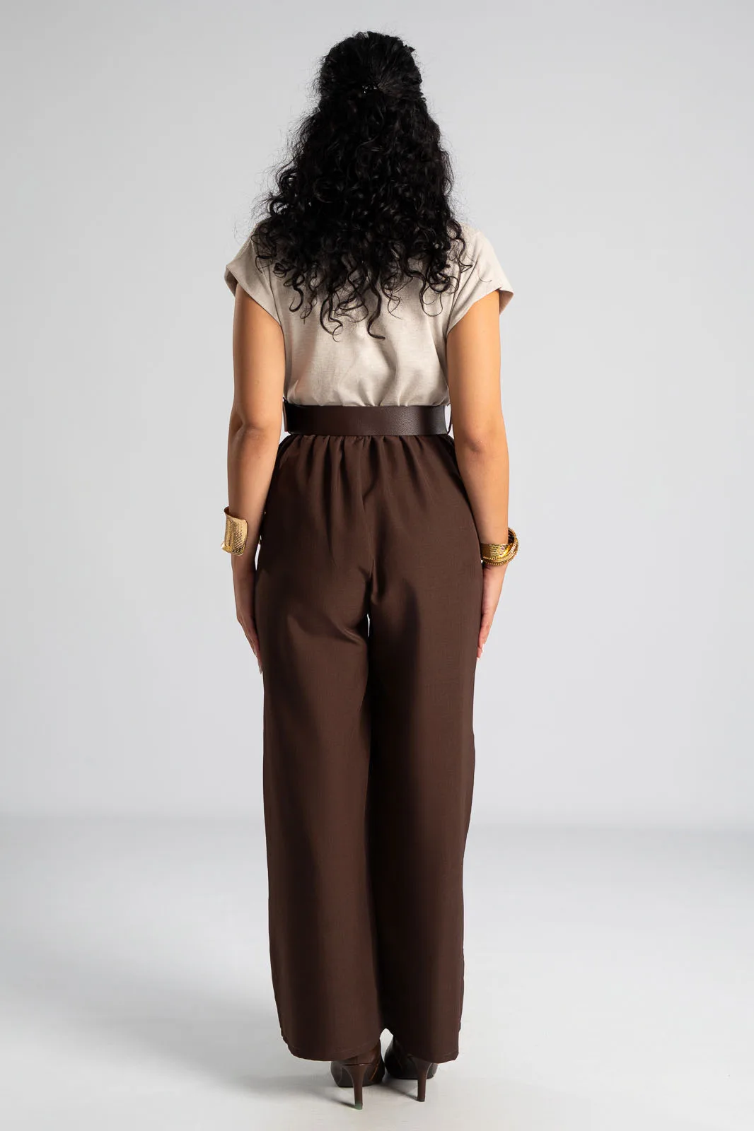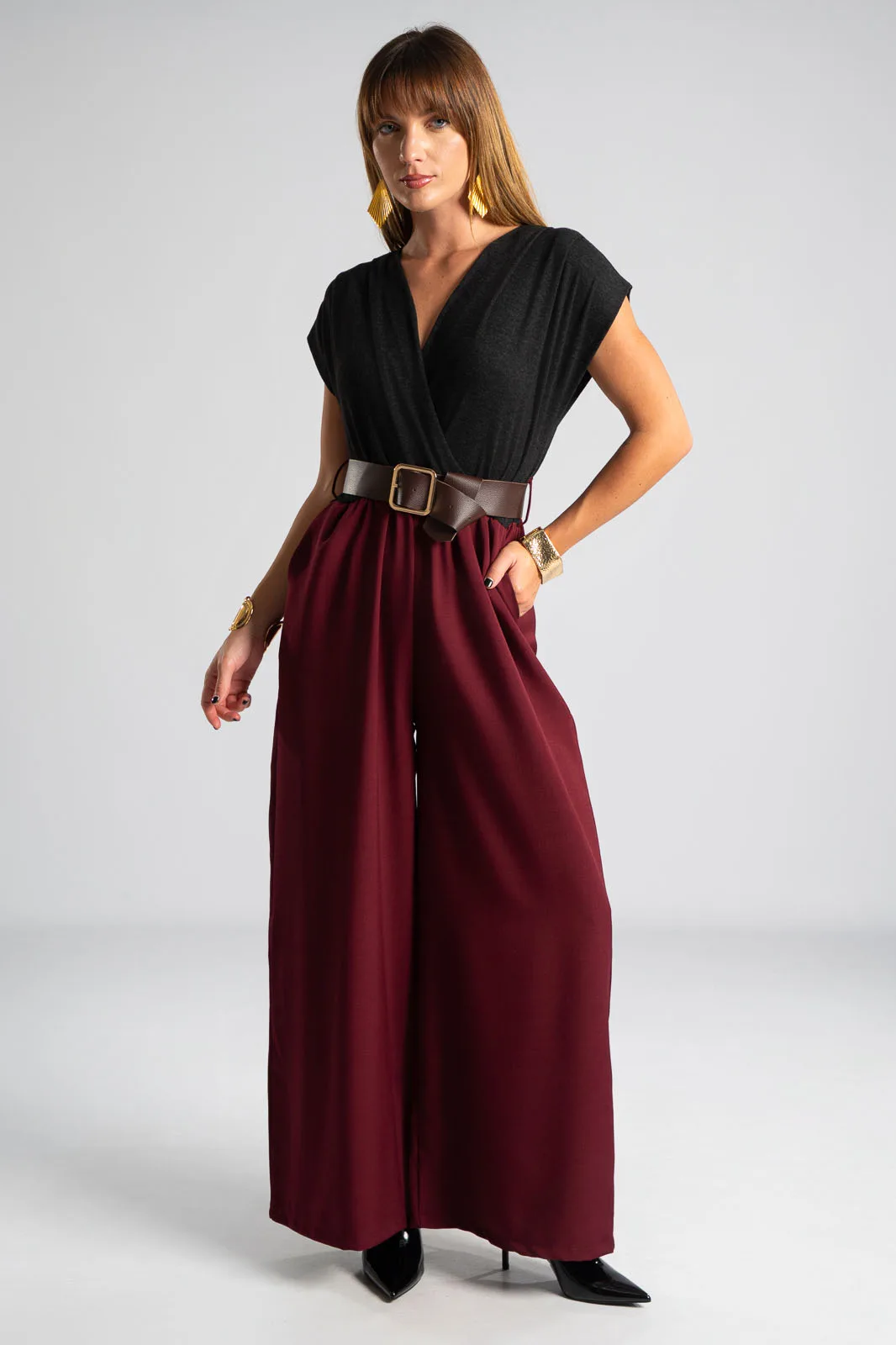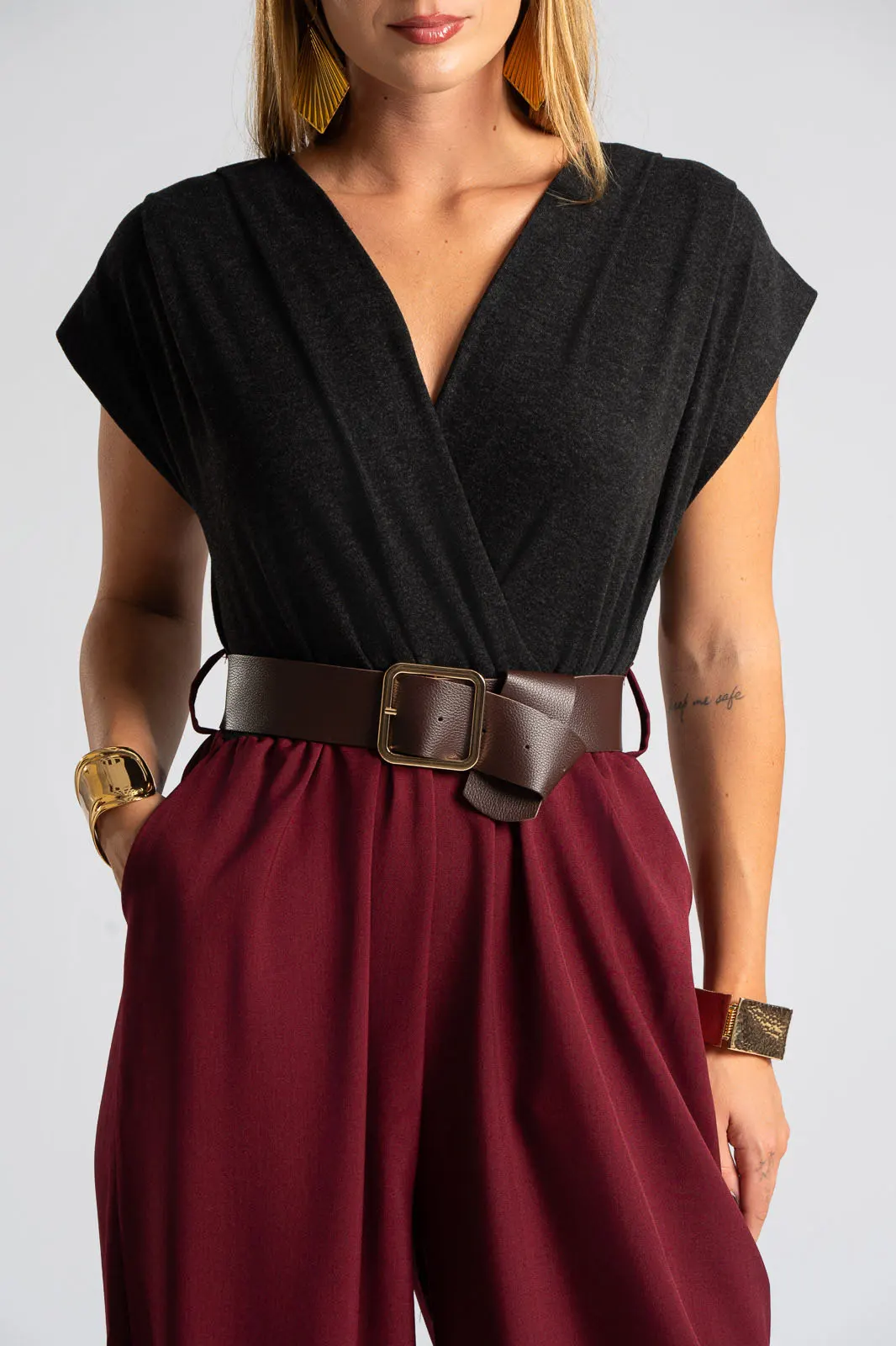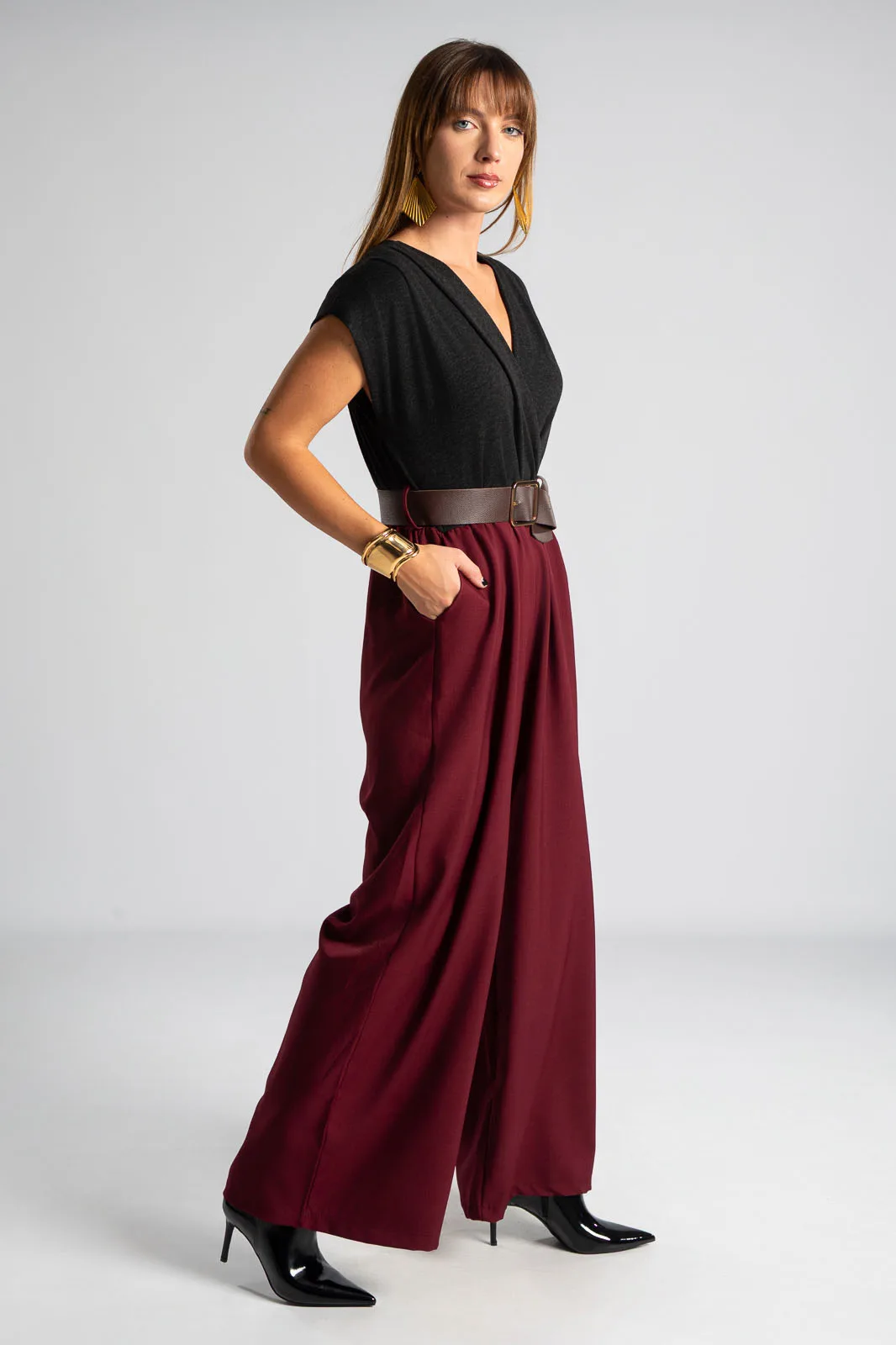 Ολόσωμη φόρμα αμάνικη. Στο πάνω μέρος είναι κρουαζέ. Στη μέση διαθέτει λάστιχο για καλύτερη εφαρμογή και δική της ζώνη δερματίνη. Το παντελόνι έχει ίσια γραμμή και στα πλαϊνά διαθέτει τσέπες. Είναι μια ιδανική επιλογή για κάθε περίσταση. Οι μετρήσεις του πίνακα είναι αντιπροσωπευτικές για κάθε προϊόν. Πάνω μέρος: 69% polyester, 28% viscose, 3% elastan. Κάτω μέρος: 100% polyester.