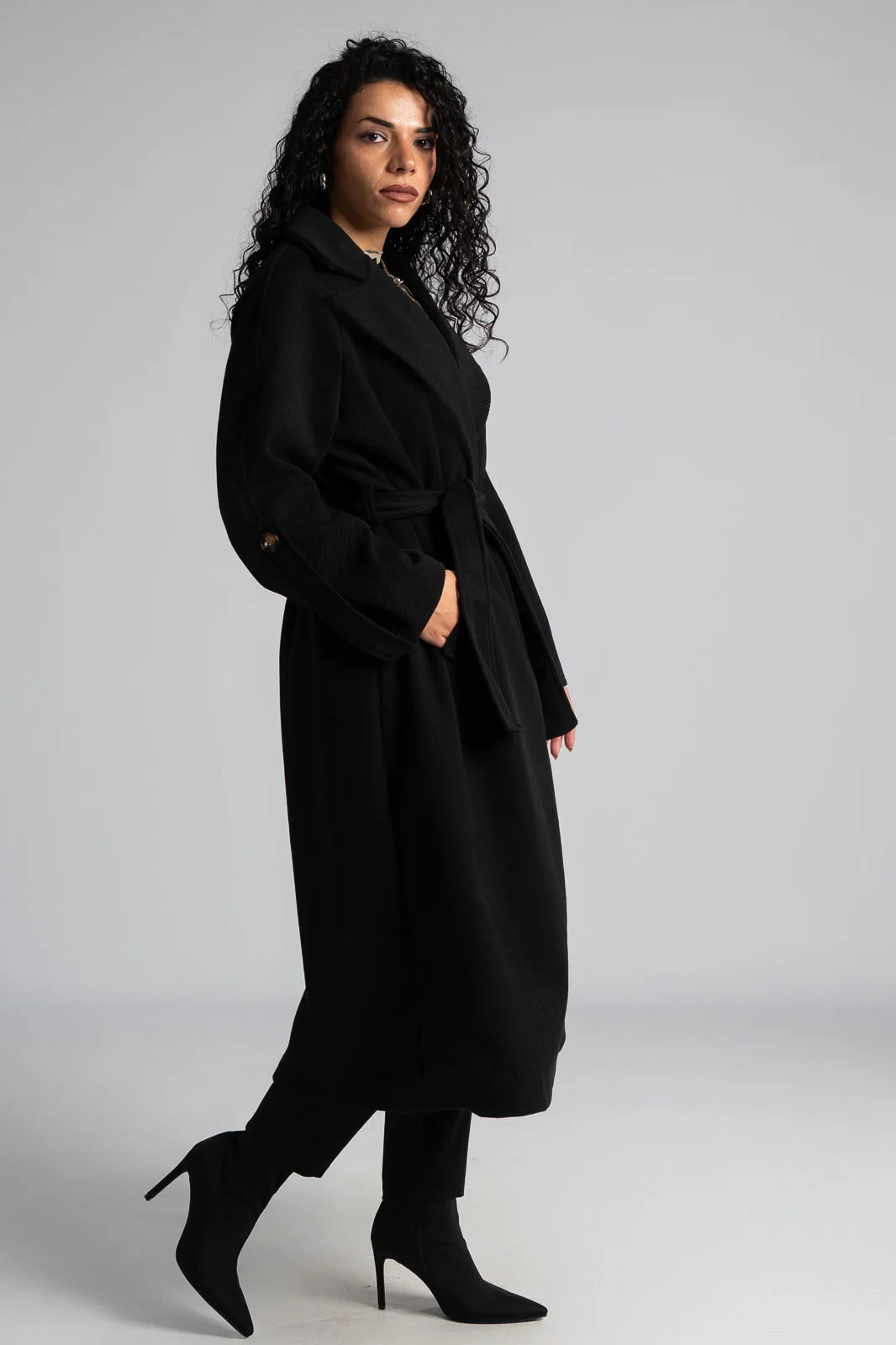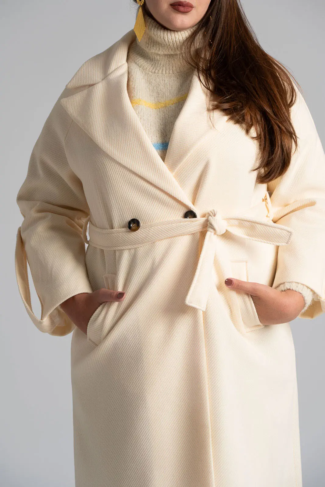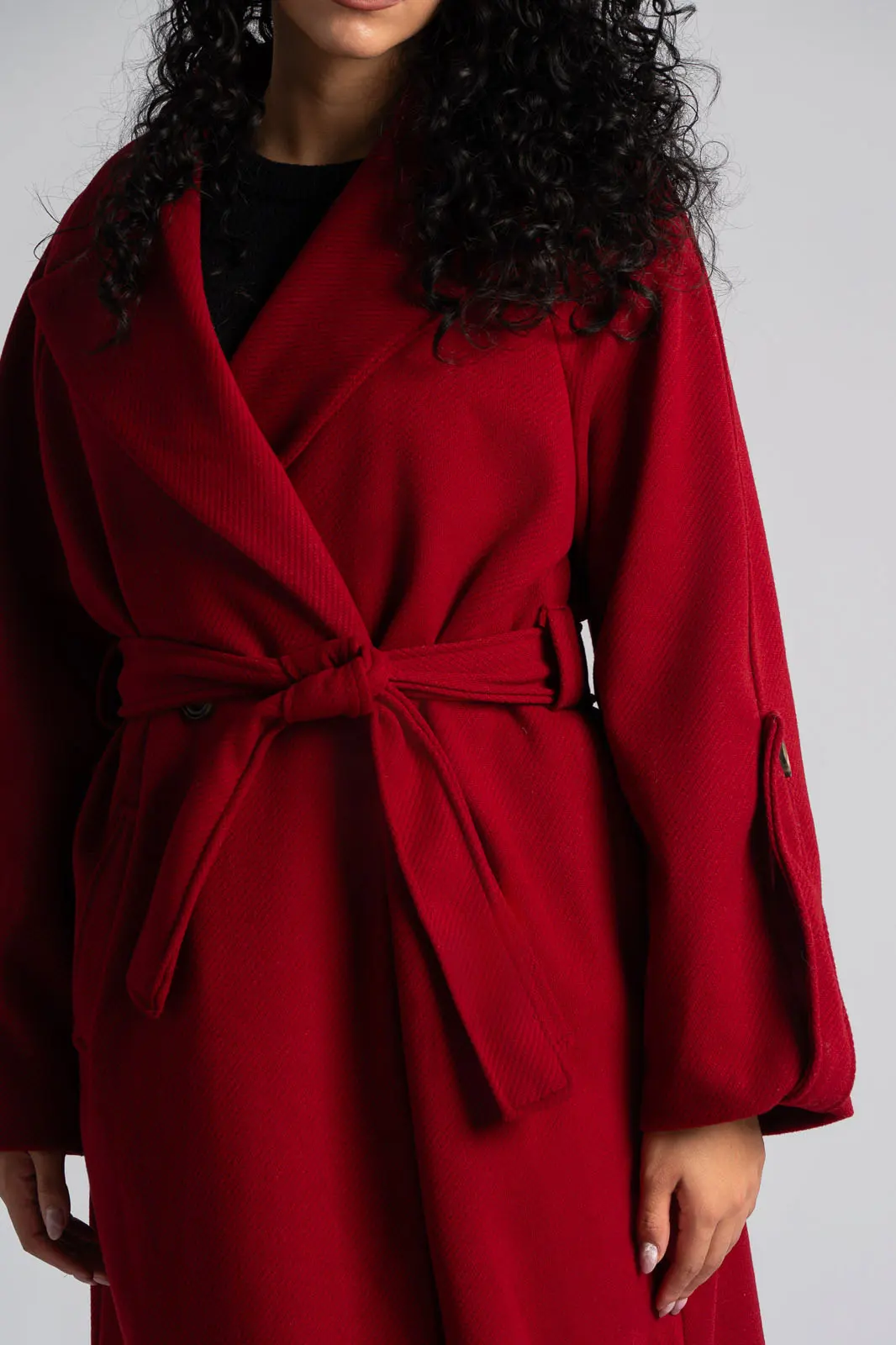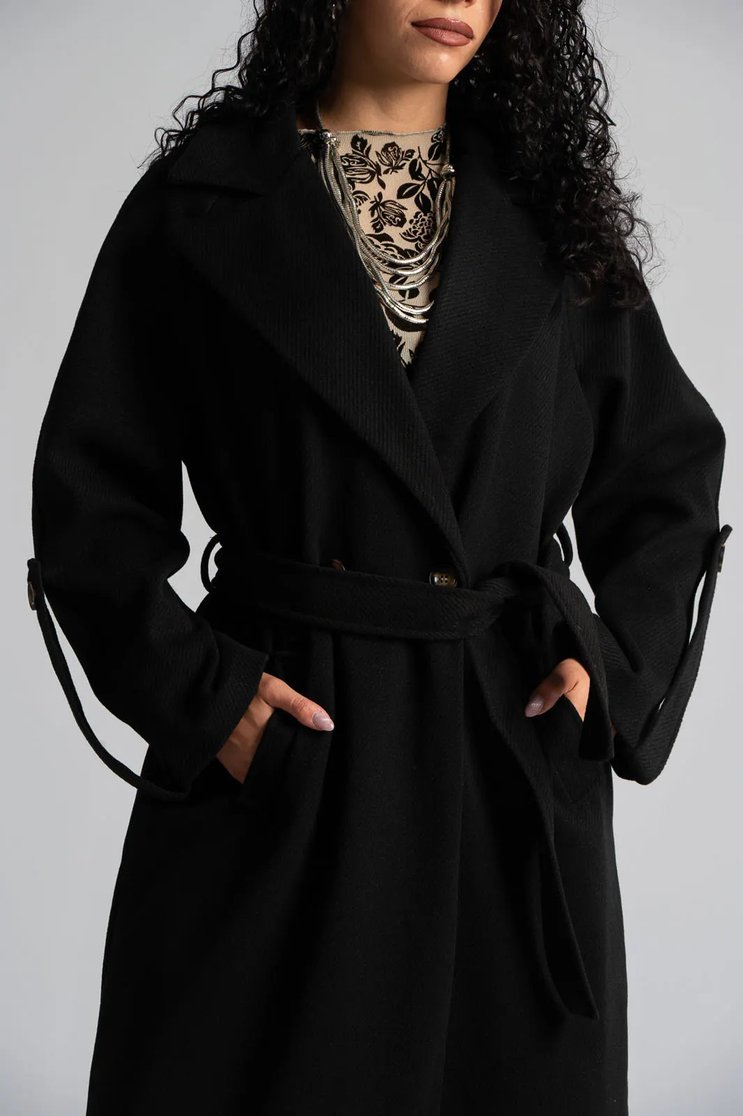 Παλτό που διαθέτει γιακά και πέτο. Έχει μακριά μανίκια και στο επάνω μέρος έχει διακοσμητική λωρίδα υφάσματος με κουμπί. Διαθέτει δική του ζώνη στην ίδια απόχρωση και υφή. Κλείνει με ένα κουμπί και έχει και ένα διακοσμητικό. Εσωτερικά είναι φοδραρισμένο. Στα πλαινά έχει τσέπες. Η μέτρηση έχει γίνει κλειστά τα κουμπιά. Οι μετρήσεις του πίνακα είναι αντιπροσωπευτικές για κάθε προϊόν. 100% polyester.
