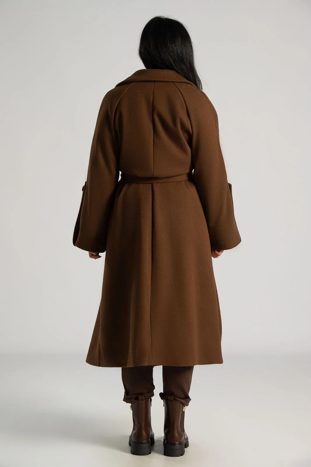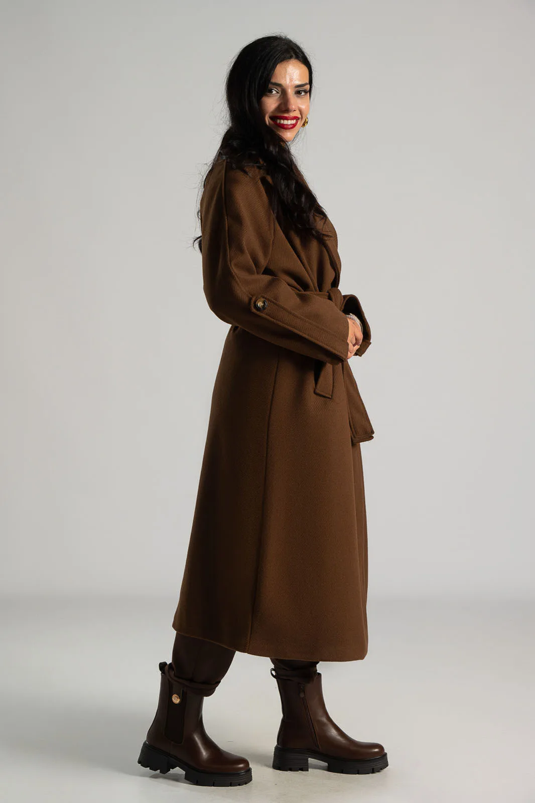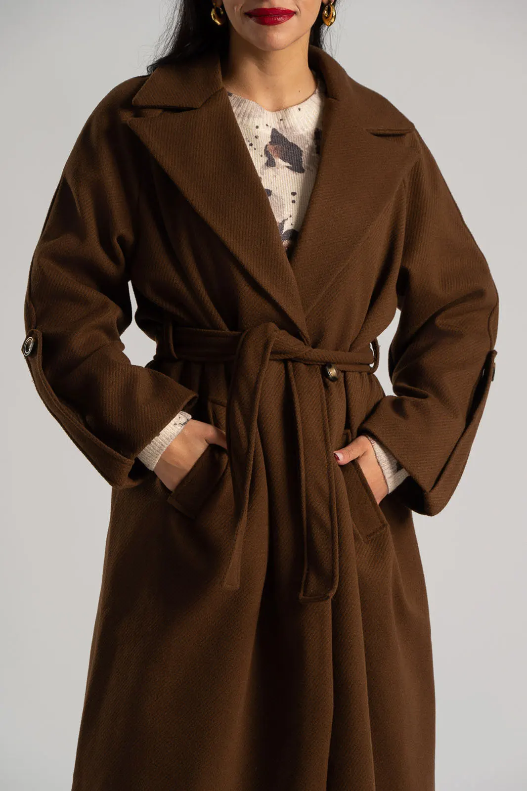 Παλτό που διαθέτει γιακά και πέτο. Έχει μακριά μανίκια και στο επάνω μέρος έχει διακοσμητική λωρίδα υφάσματος με κουμπί. Διαθέτει δική του ζώνη στην ίδια απόχρωση και υφή. Κλείνει με ένα κουμπί και έχει και ένα διακοσμητικό. Εσωτερικά είναι φοδραρισμένο. Στα πλαινά έχει τσέπες. Η μέτρηση έχει γίνει κλειστά τα κουμπιά. Οι μετρήσεις του πίνακα είναι αντιπροσωπευτικές για κάθε προϊόν. 100% polyester.