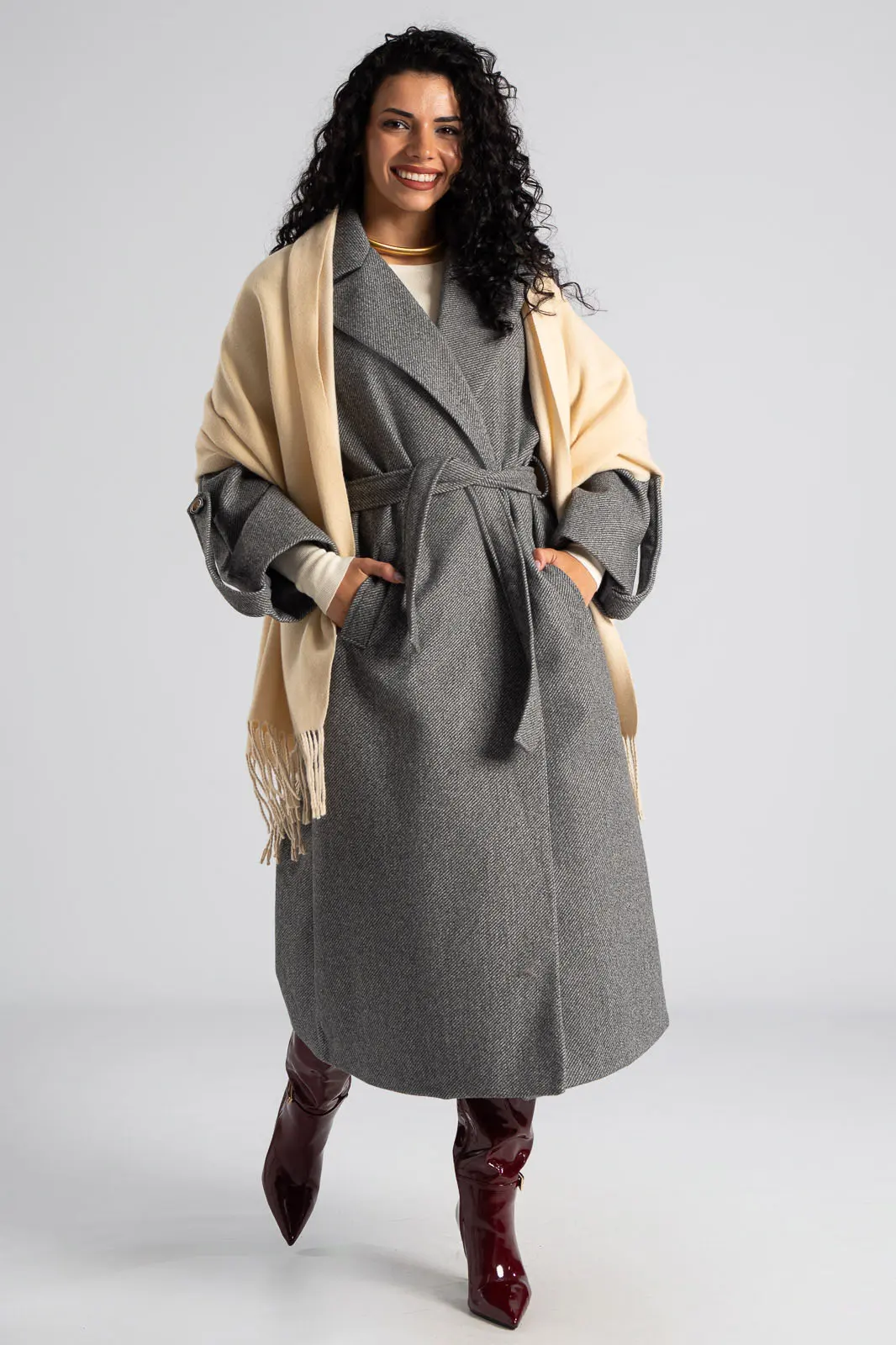 Coat with collar and lapels. It has long sleeves and a decorative fabric strip with a button at the top. It has its own belt in the same color and texture. It closes with a button and has a decorative detail. It is lined on the inside. It has pockets on the sides. The measurements were taken with the buttons closed. The measurements in the table are representative of each product. 100% polyester.