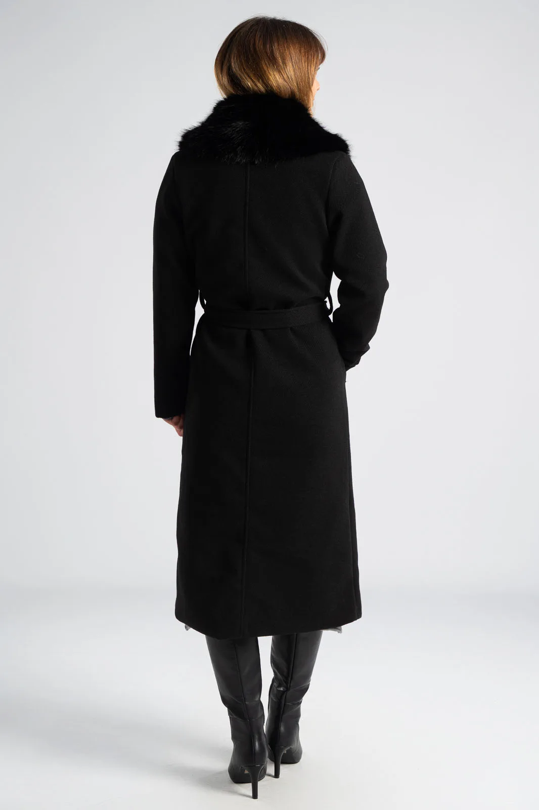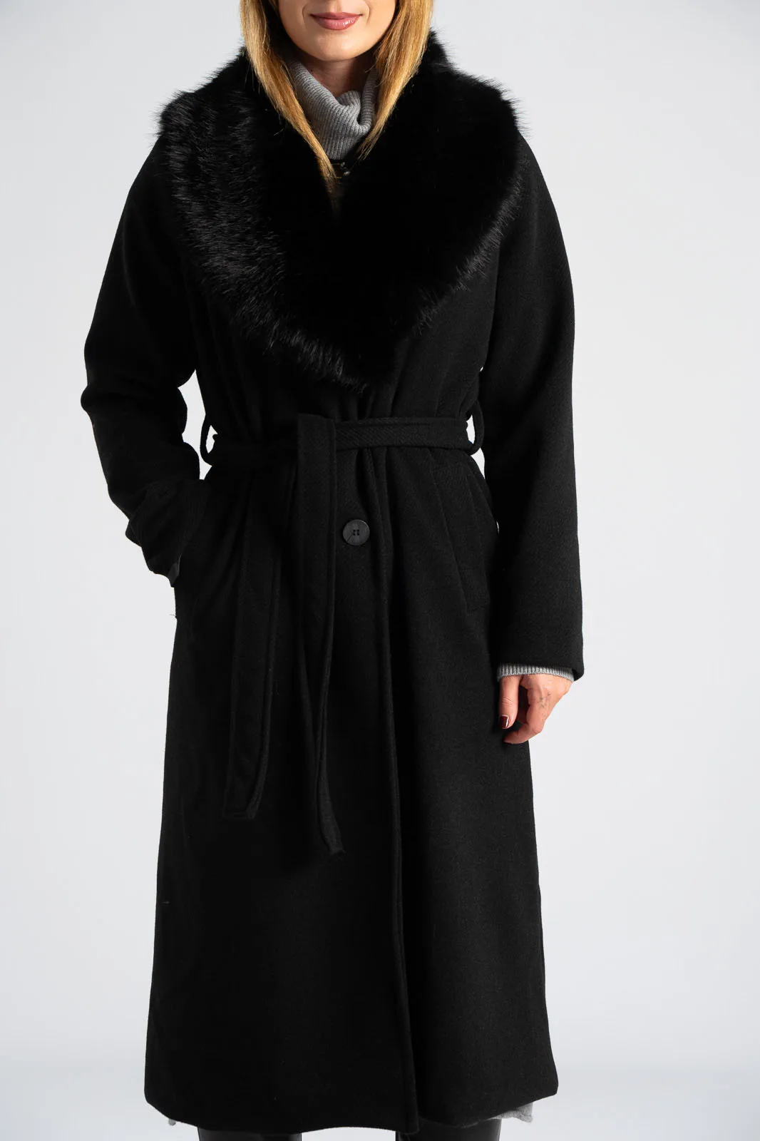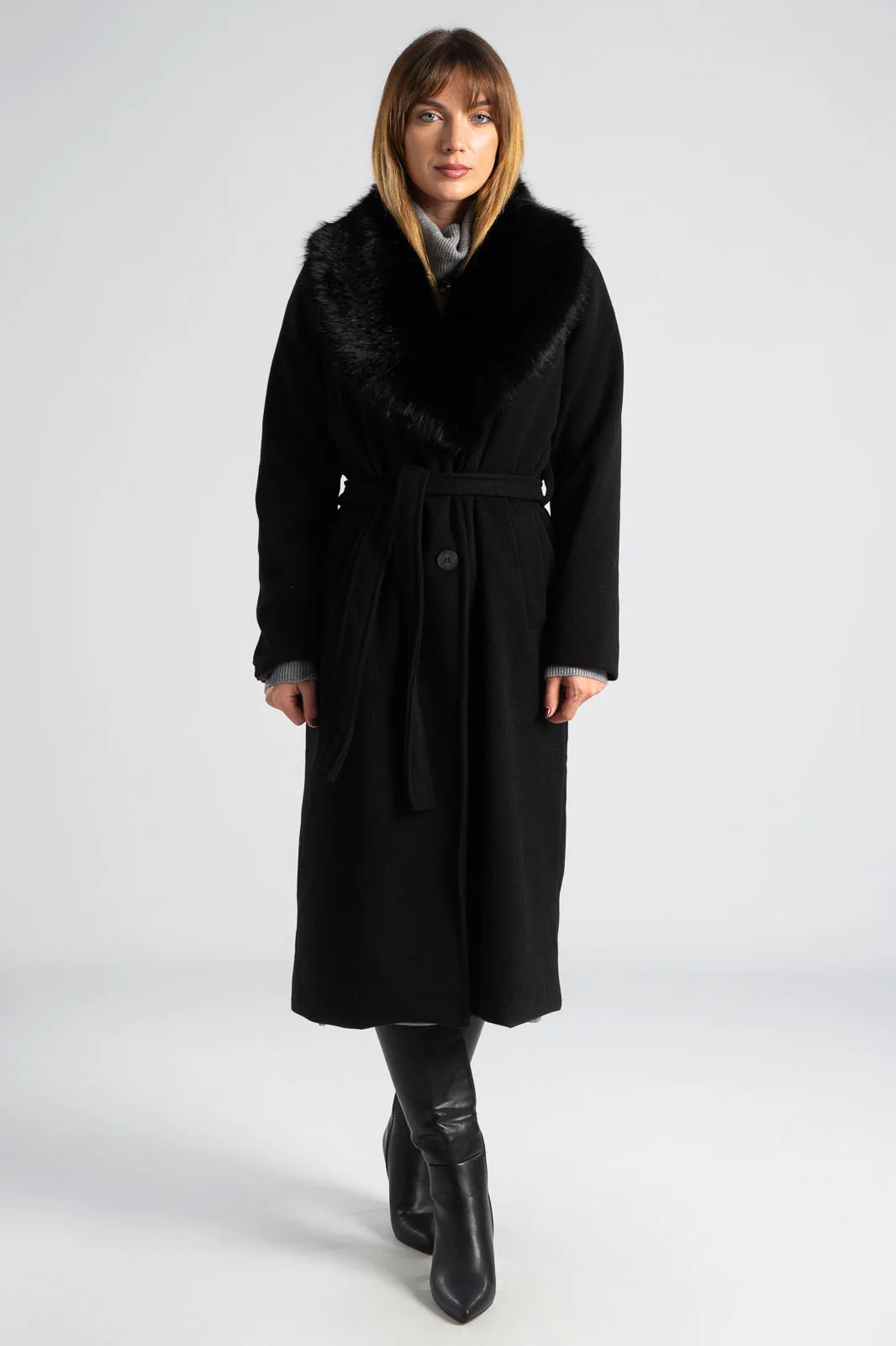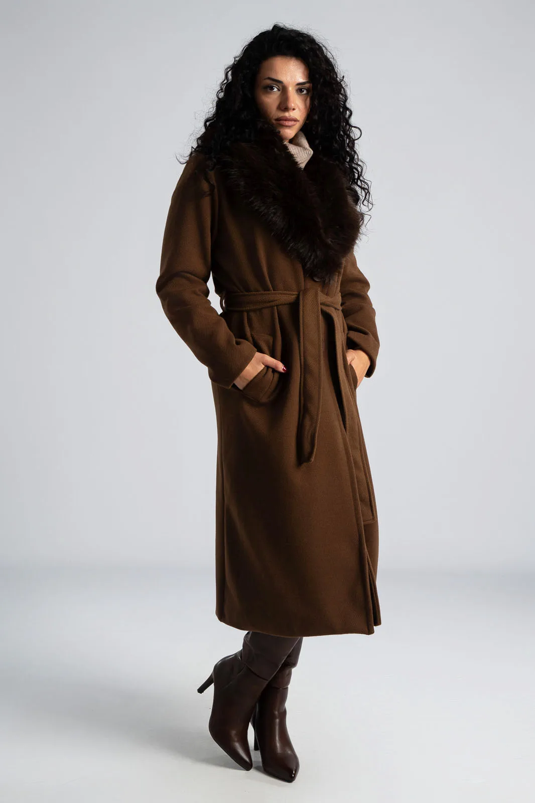 Παλτό μακρύ με συνθετικό γούνινο γιακά. Το ύφασμα του είναι ανάγλυφο. Έχει μακριά μανίκια και στα πλαϊνά διαθέτει τσέπες. Κλείνει με ένα κουμπιά και έχει δική της ζώνη. Εσωτερικά είναι φοδραρισμένο. Η μέτρηση έχει γίνει με κλειστά τα κουμπιά. Οι μετρήσεις του πίνακα είναι αντιπροσωπευτικές για κάθε προϊόν. 25% wool, 75% polyester, φόδρα: 100% polyester.