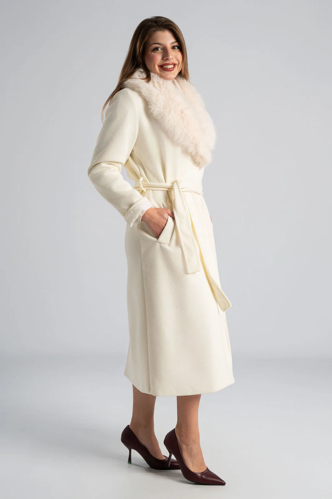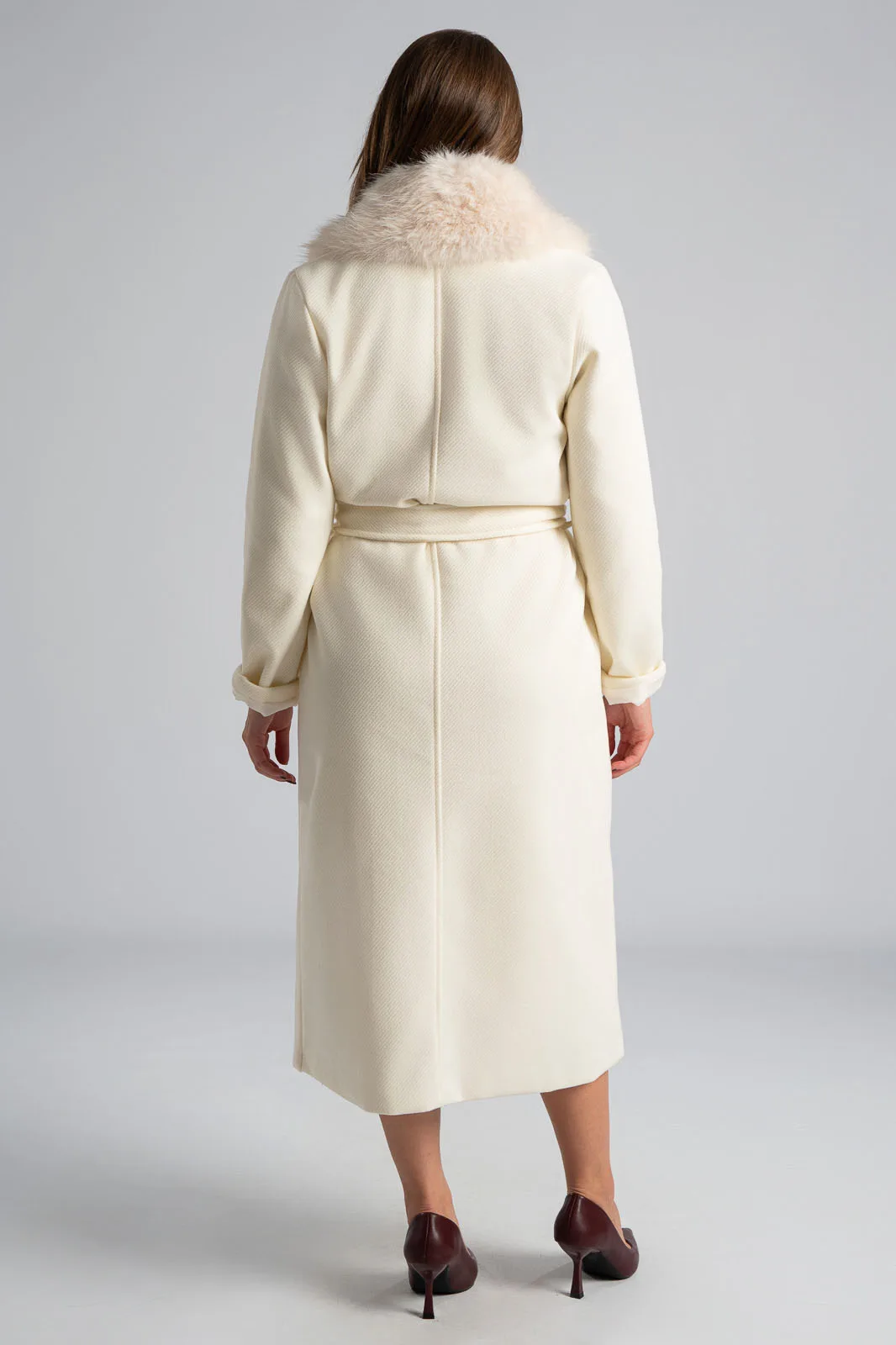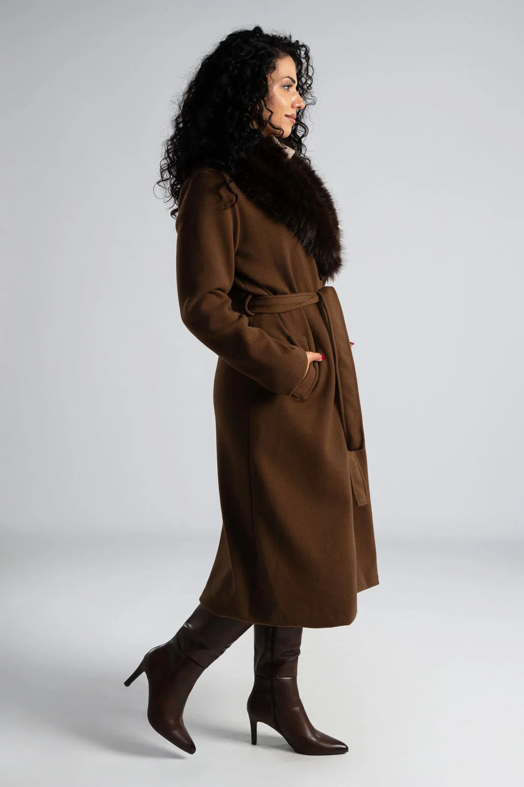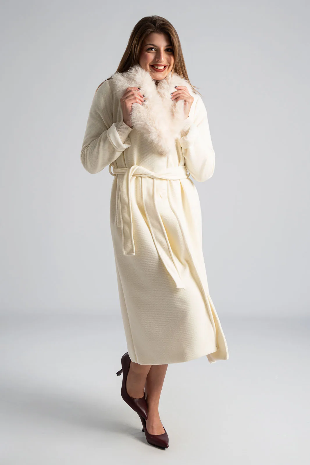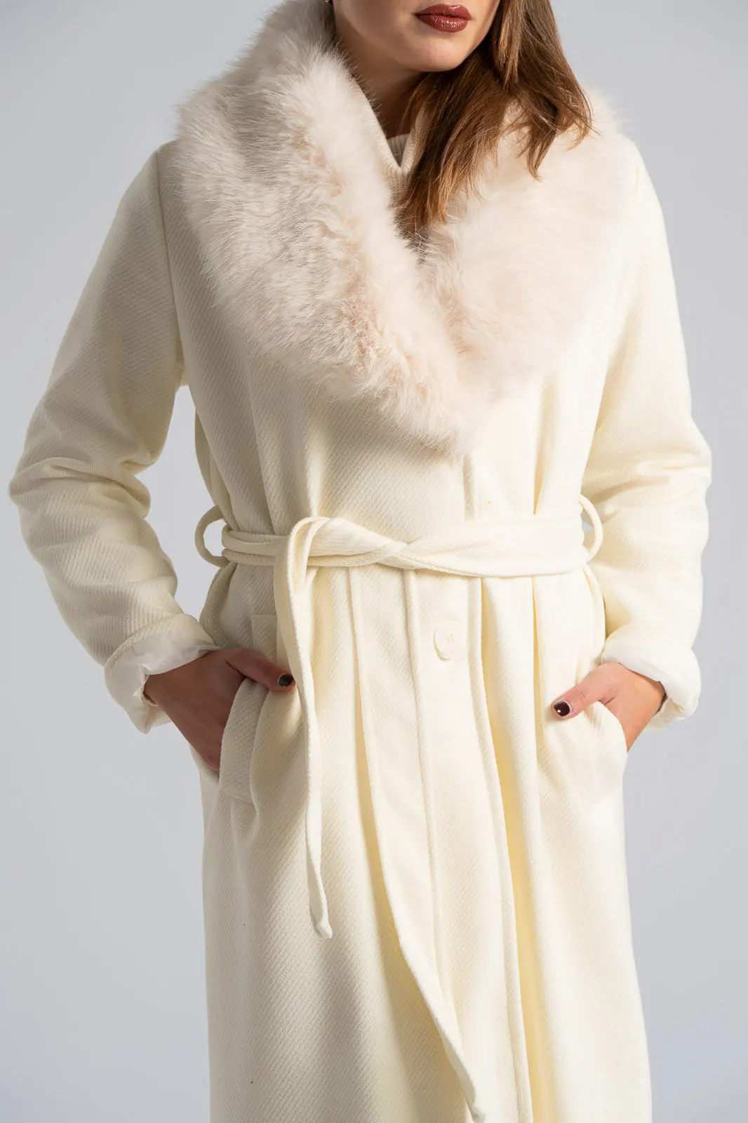 Παλτό μακρύ με συνθετικό γούνινο γιακά. Το ύφασμα του είναι ανάγλυφο. Έχει μακριά μανίκια και στα πλαϊνά διαθέτει τσέπες. Κλείνει με ένα κουμπιά και έχει δική της ζώνη. Εσωτερικά είναι φοδραρισμένο. Η μέτρηση έχει γίνει με κλειστά τα κουμπιά. Οι μετρήσεις του πίνακα είναι αντιπροσωπευτικές για κάθε προϊόν. 25% wool, 75% polyester, φόδρα: 100% polyester.