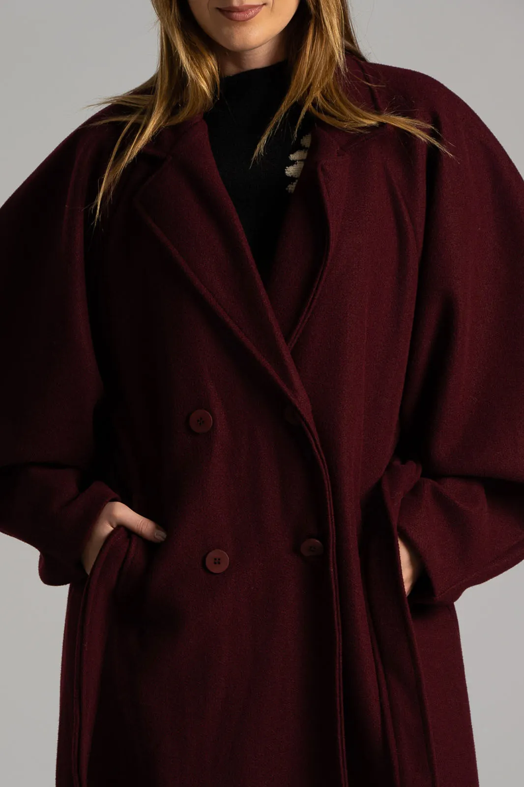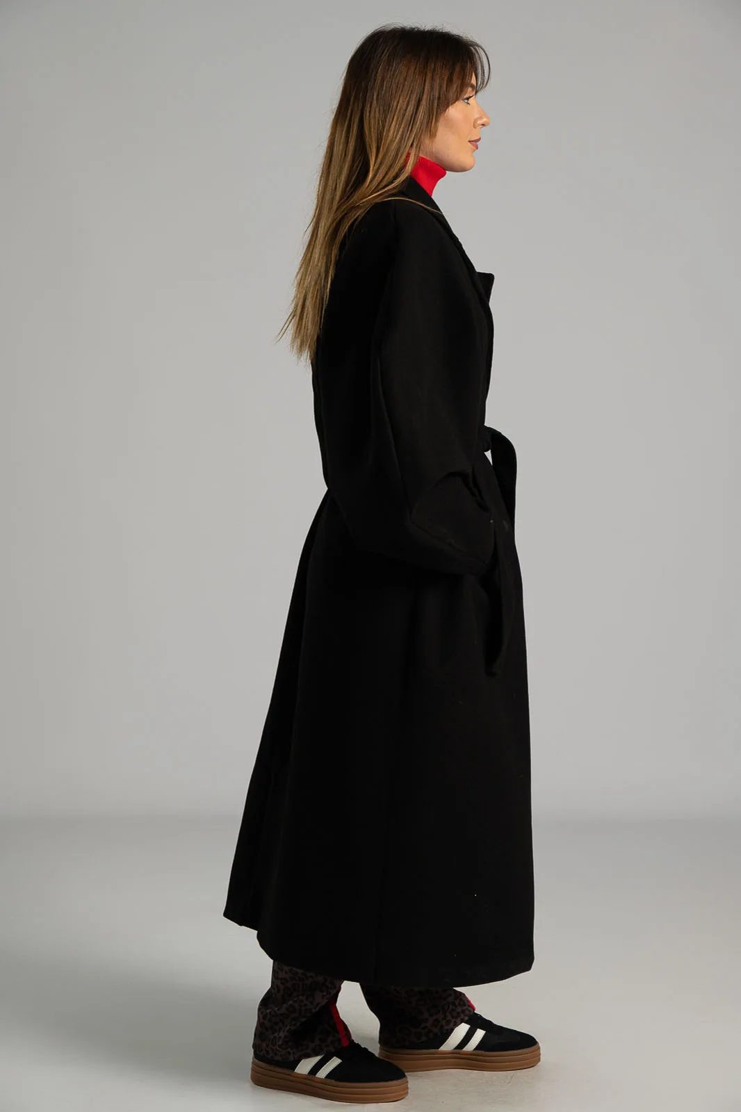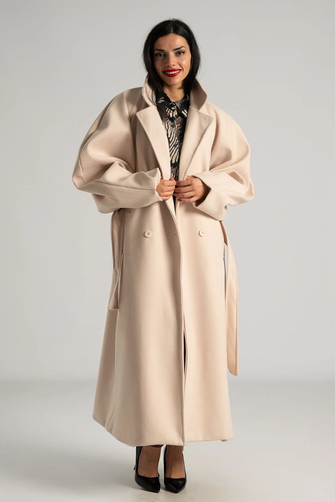 Coat with collar and lapels. Fastens with two buttons and two decorative buttons. It has side pockets and its own belt. It has a lining on the inside. Measurements taken with buttons fastened. The measurements in the table are representative of each product. 100% polyester.