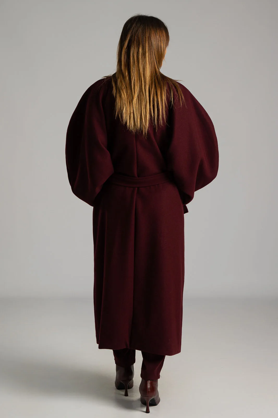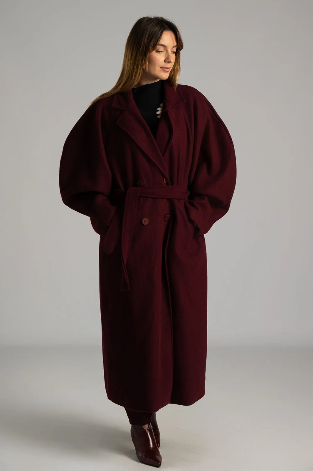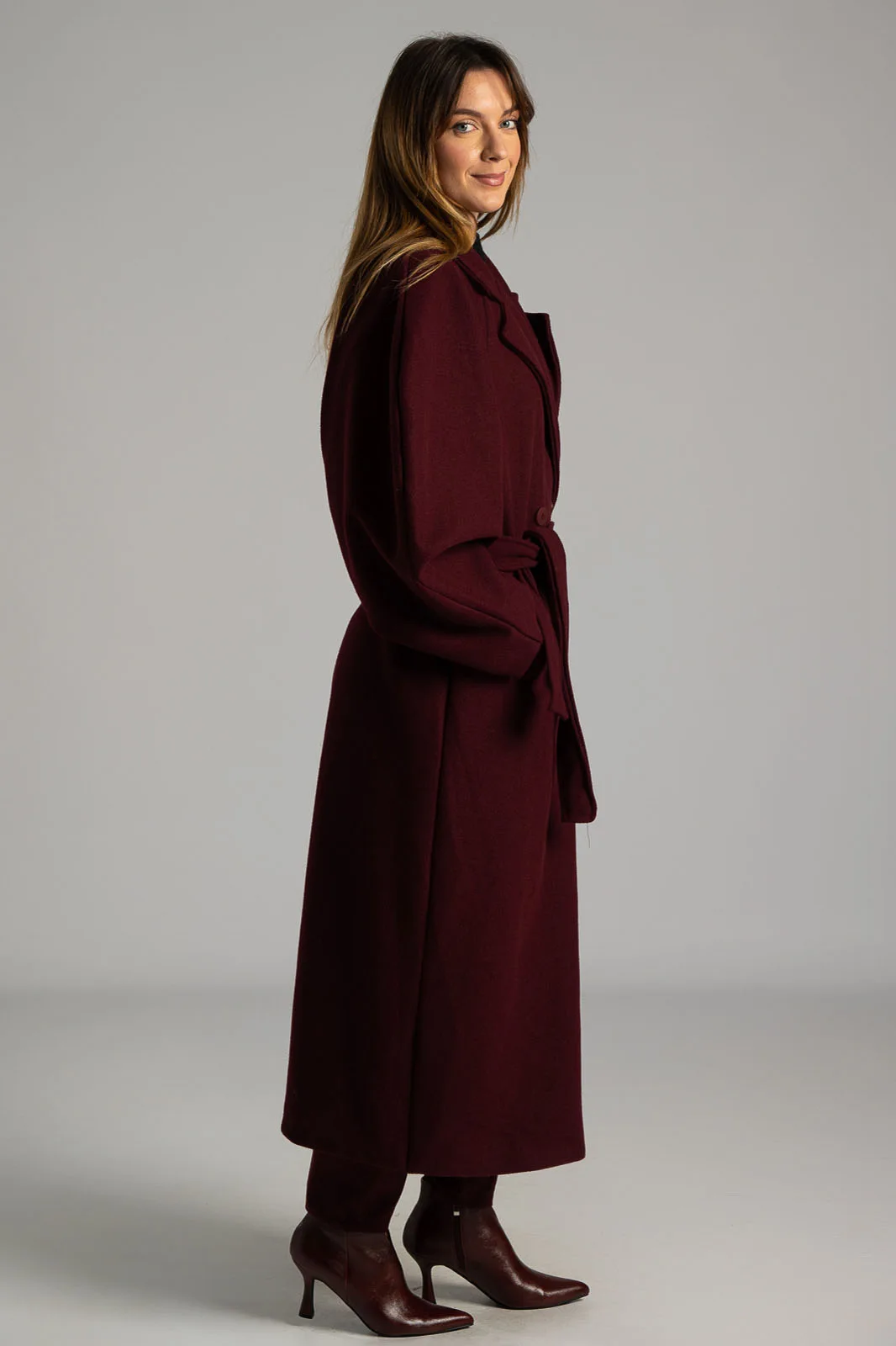 Coat with collar and lapels. Fastens with two buttons and two decorative buttons. It has side pockets and its own belt. It has a lining on the inside. Measurements taken with buttons fastened. The measurements in the table are representative of each product. 100% polyester.