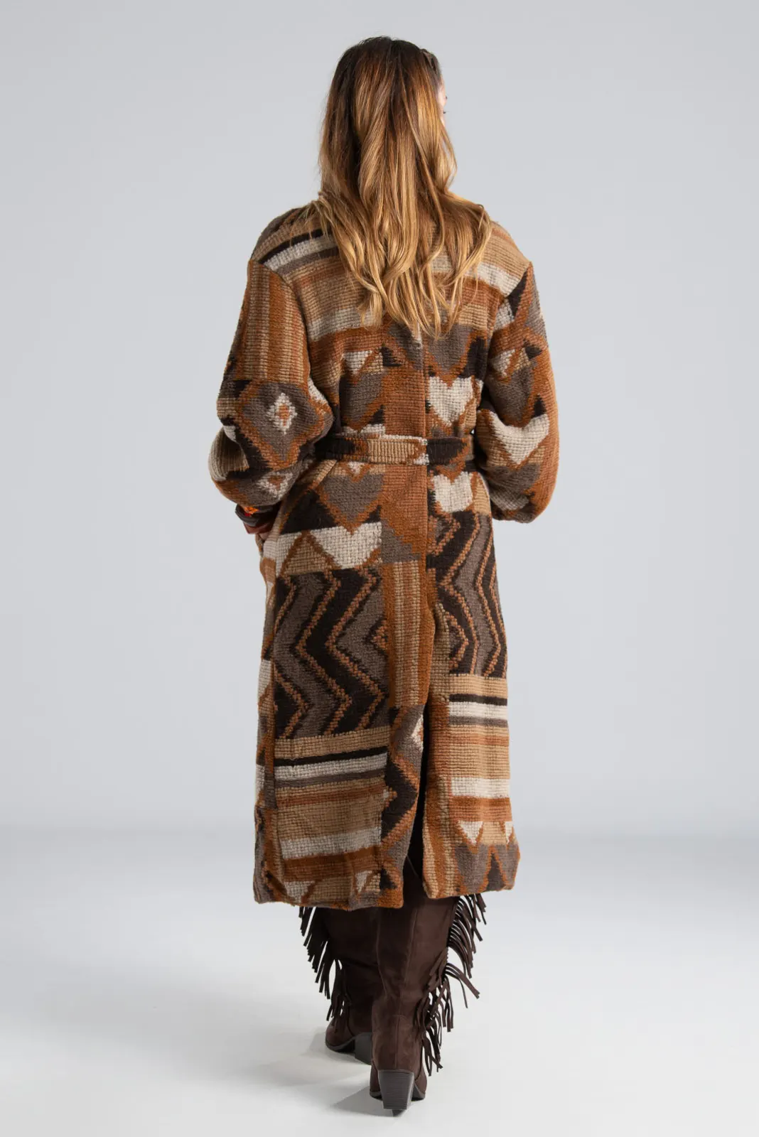 Παλτό με στρογγυλή λαιμόκοψη και μακριά μανίκια που καταλήγουν σε λάστιχο. Είναι midi και σε όλη την επιφάνεια διαθέτει ethnic μοτίβο που συνδυάζει αρμονικά διάφορες αποχρώσεις. Κλείνει με clutch. Έχει πλαϊνές τσέπες και εσωτερικά διαθέτει φόδρα. Έχει δική της ζώνη με το ίδιο print. Η μέτρηση έχει γίνει με κλειστά κουμπιά. Οι μετρήσεις του πίνακα είναι αντιπροσωπευτικές για κάθε προϊόν. 100% polyester.