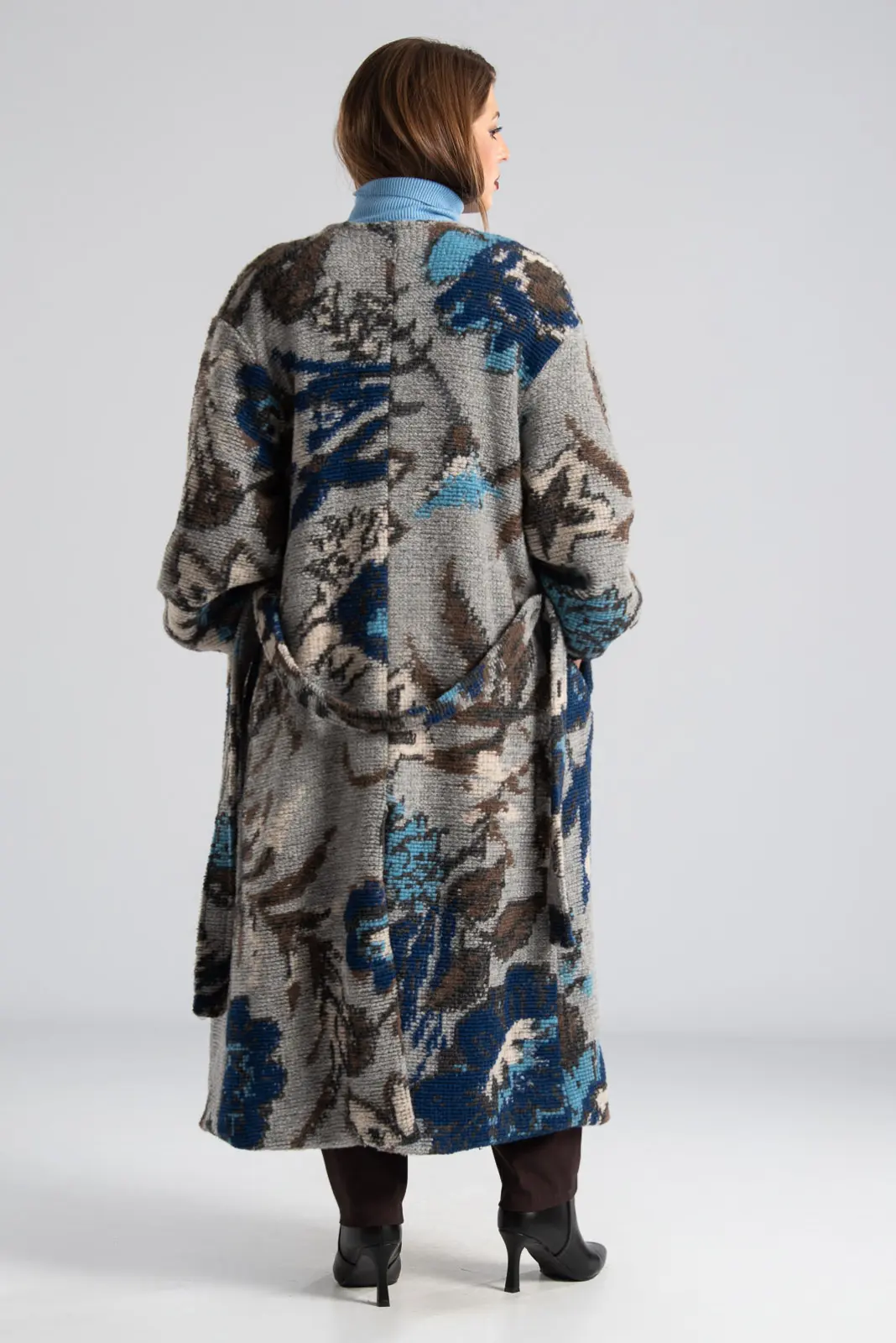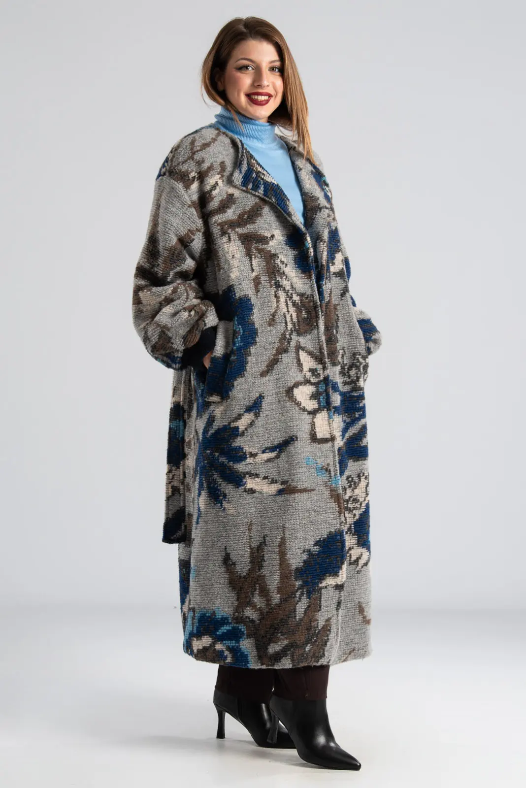 Coat with a round neckline and long sleeves that end in elastic. It is midi length and has an ethnic pattern across the entire surface that harmoniously combines different shades. It closes with a clutch. It has side pockets and is lined on the inside. It has its own belt with the same print. The measurements were taken with the buttons closed. The measurements in the table are representative of each product. 100% polyester.