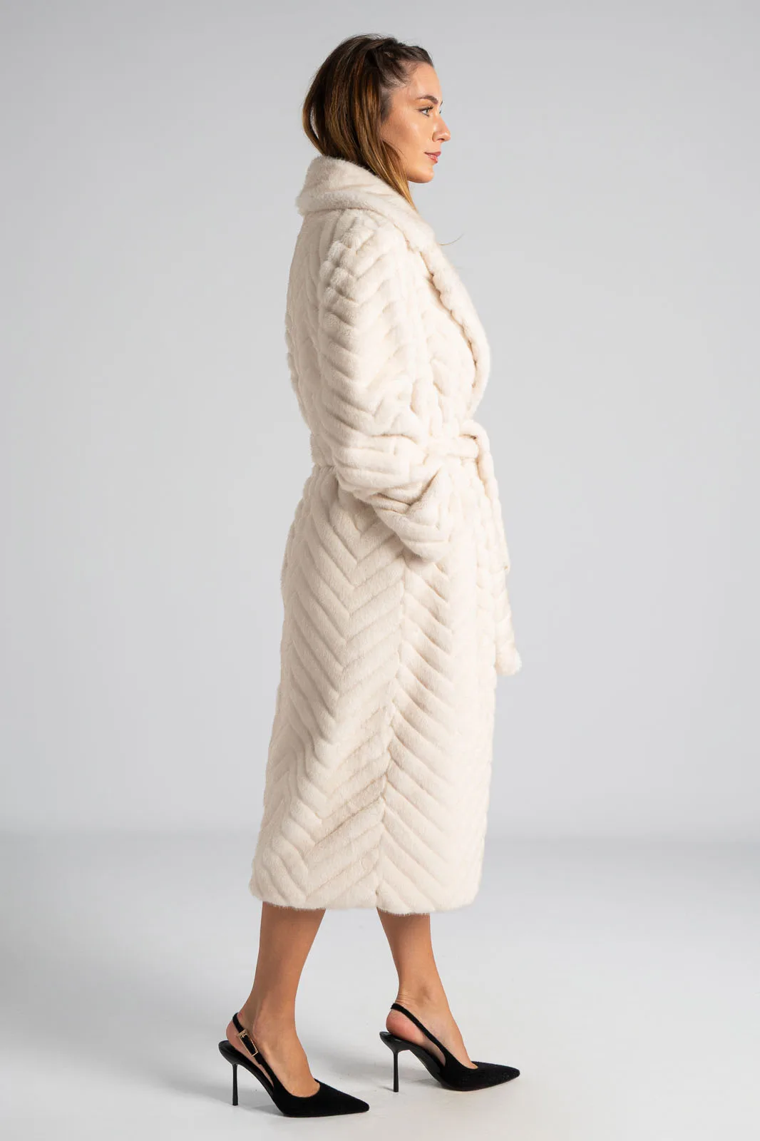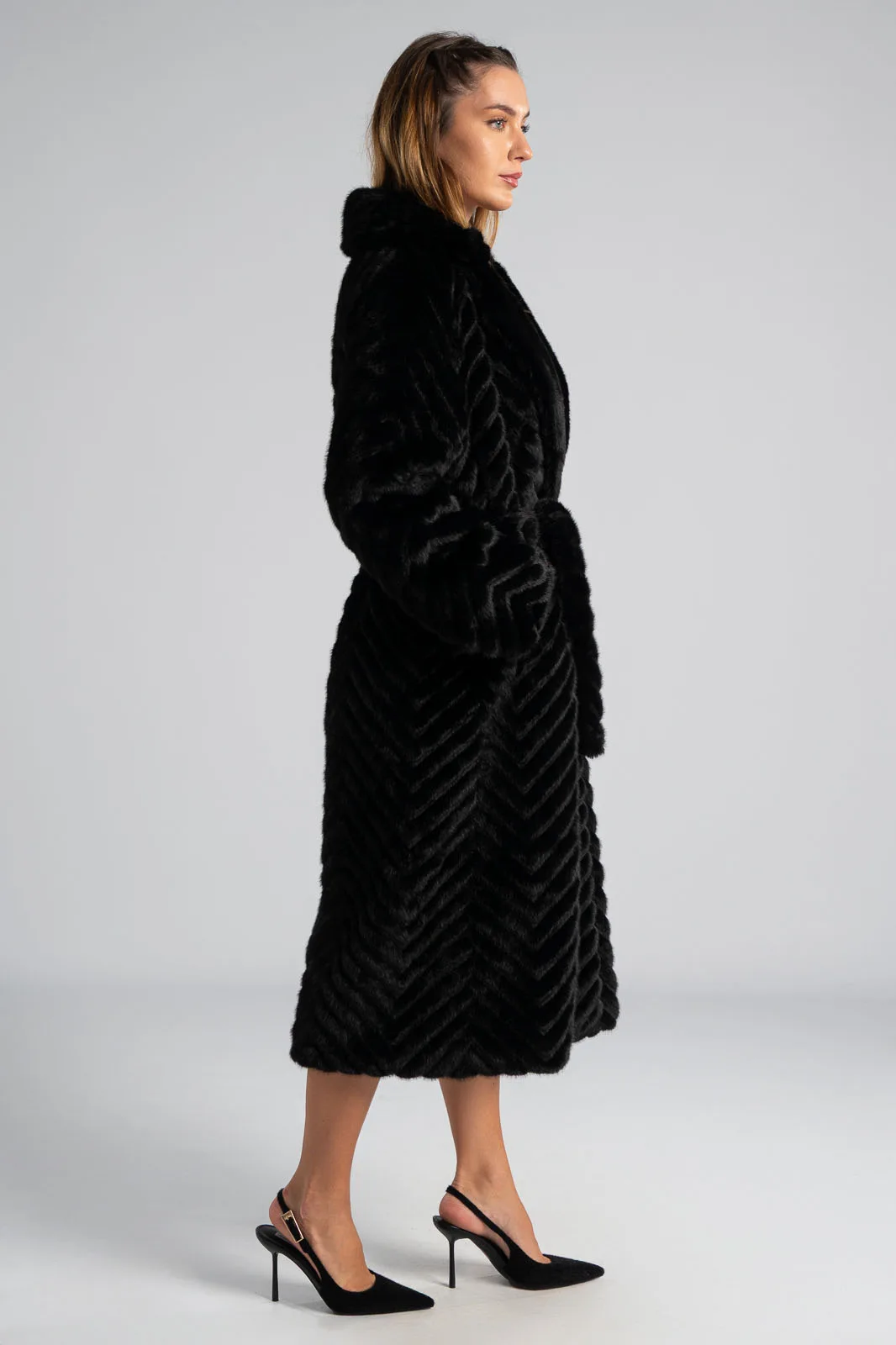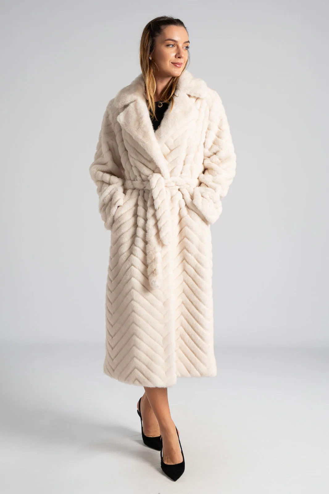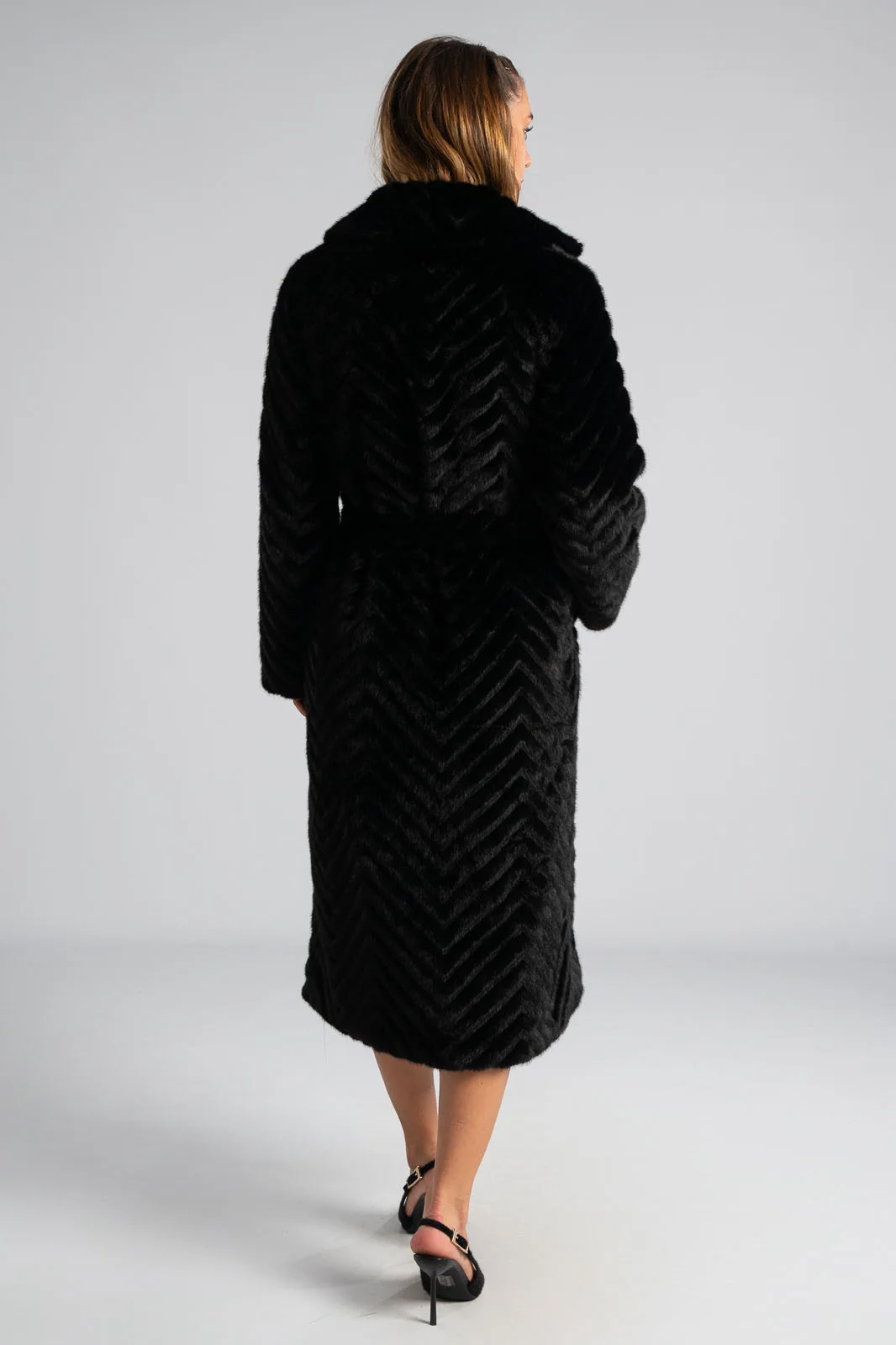 Coat with synthetic fur. It has long sleeves, a collar, and a lapel. It has a straight cut and fastens with buttons. It has side pockets and its own belt. It is lined on the inside. The measurements were taken with the buttons closed. The measurements in the table are representative for each code. 100% polyester.