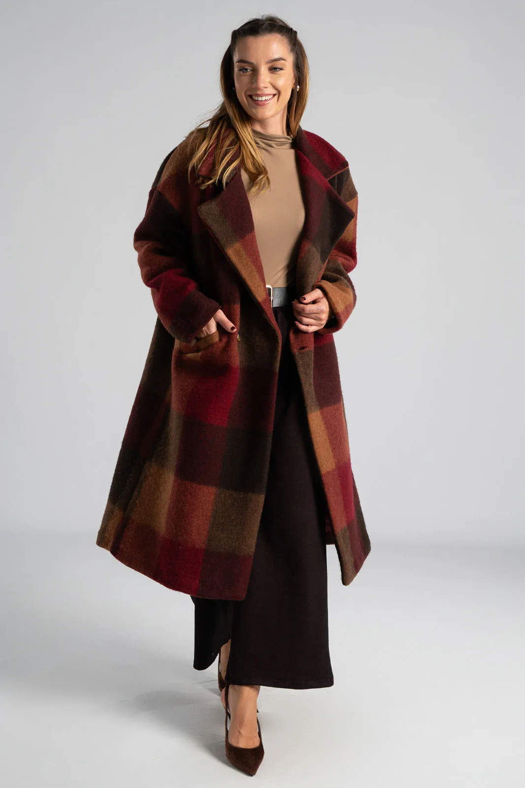Checkered coat in beautiful color combinations. It has a collar and lapels. It closes with a button and a decorative fastener. It has side pockets. It is lined on the inside. The entire exterior has a woolen texture. Measurements are taken with the buttons closed. The measurements in the table are representative of each product. 30% wool, 70% polyester.