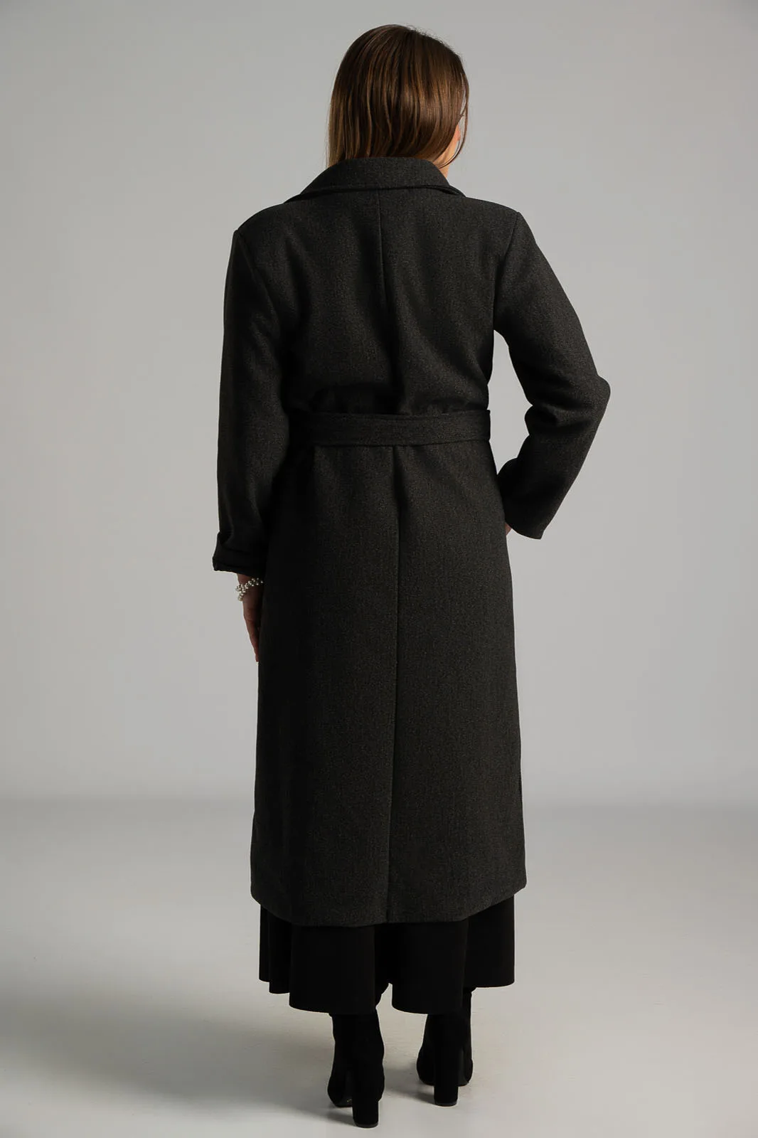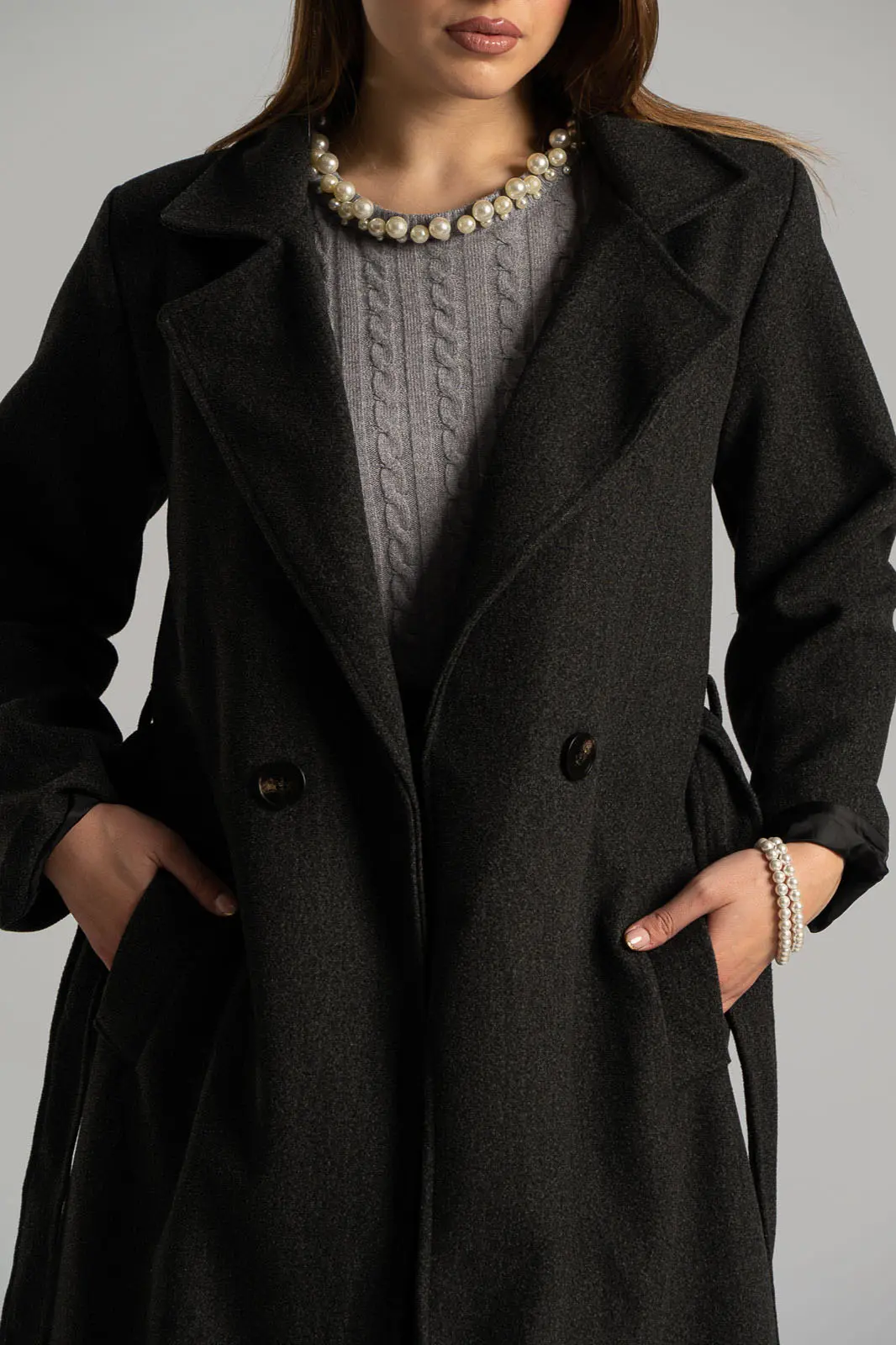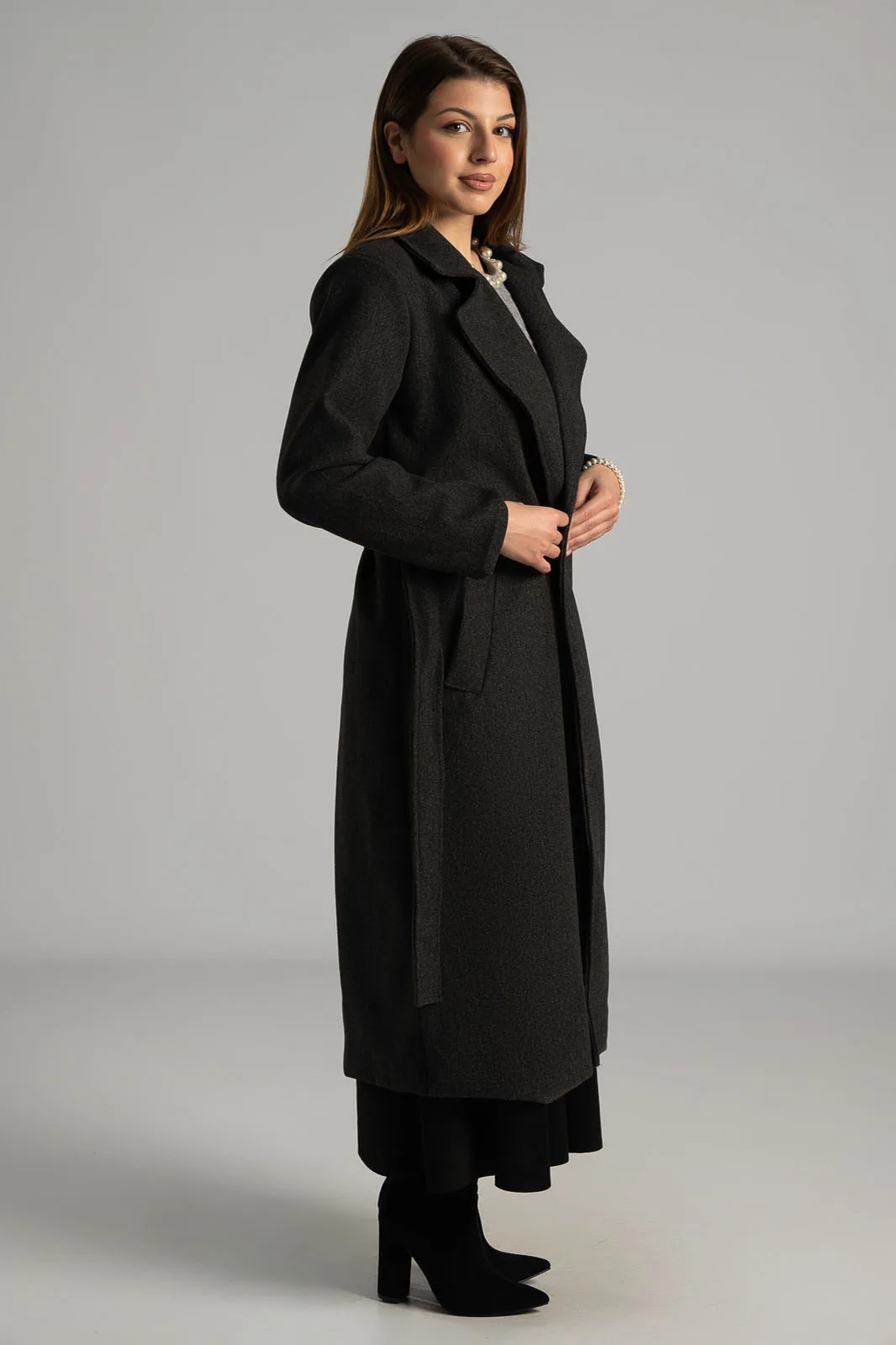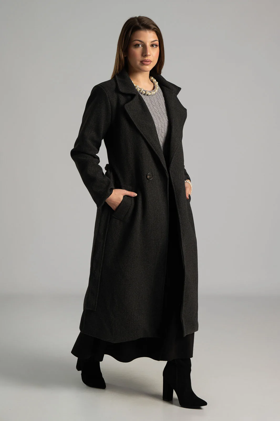 Παλτό μακρύ με γιακά και πέτο. Έχει μακριά μανίκια. Στα πλαινά διαθέτει τσέπες. Κλείνει με ένα κουμπί και έχει και ένα διακοσμητικό. Εσωτερικά είναι φοδραρισμένο. Έχει δική του ζώνη στην ίδια απόχρωση και υφή. Η μέτρηση έχει γίνει κλειστά τα κουμπιά. Οι μετρήσεις του πίνακα είναι αντιπροσωπευτικές για κάθε προϊόν. 90% polyester, 10% viscose.