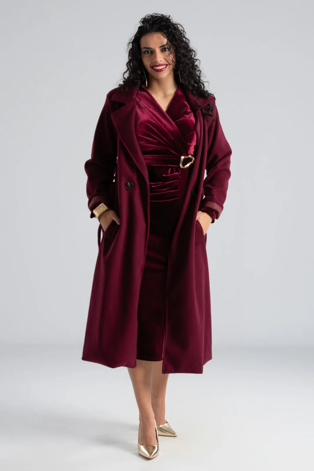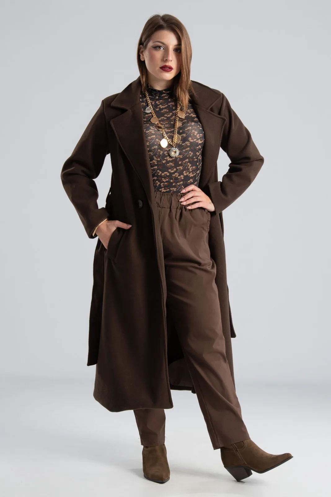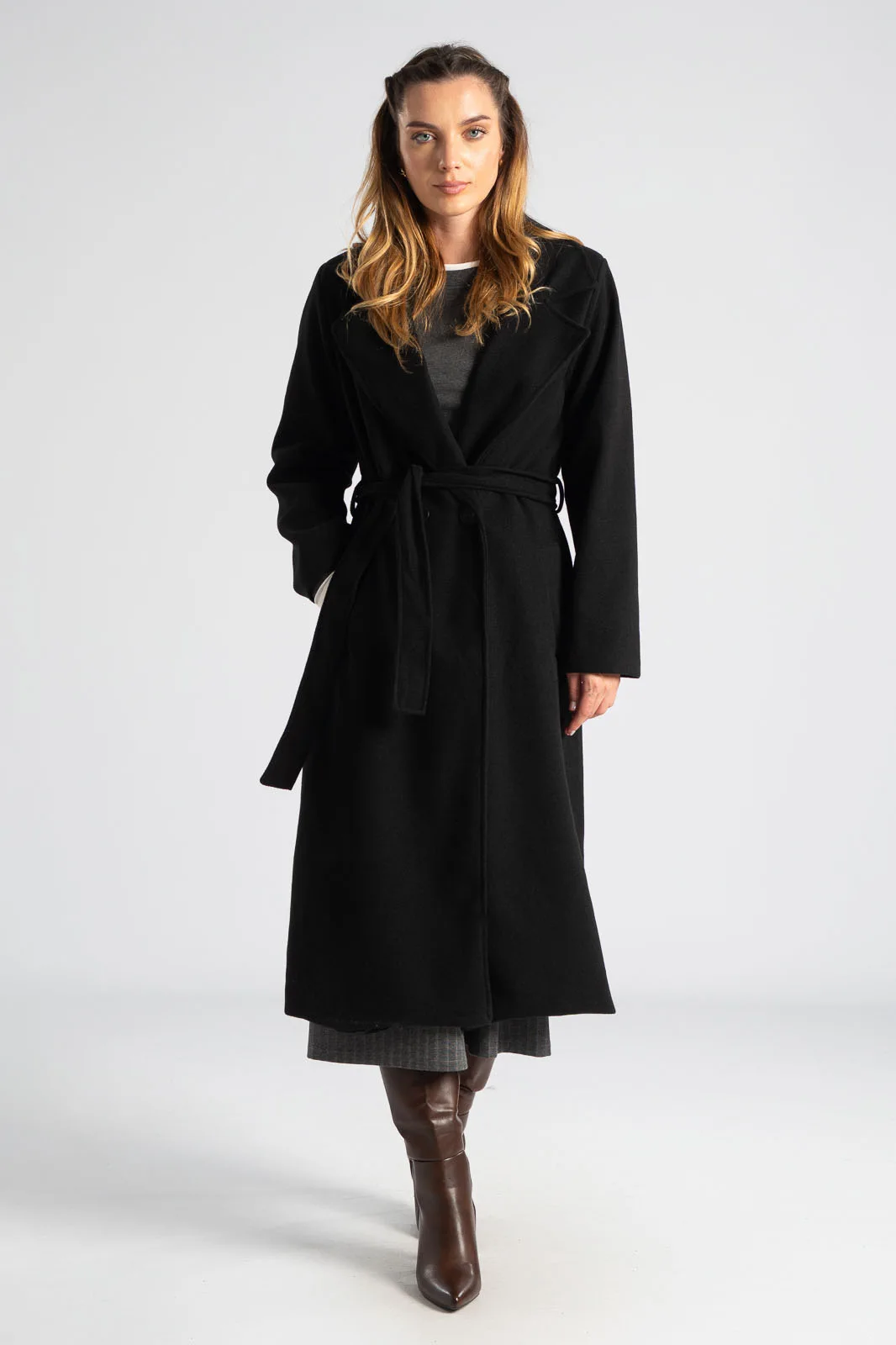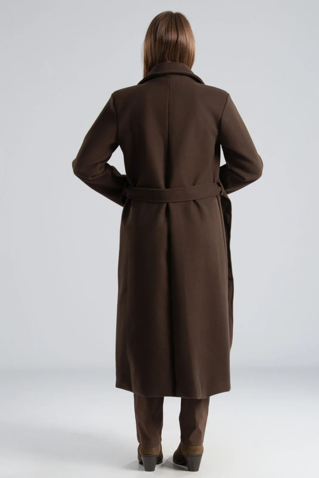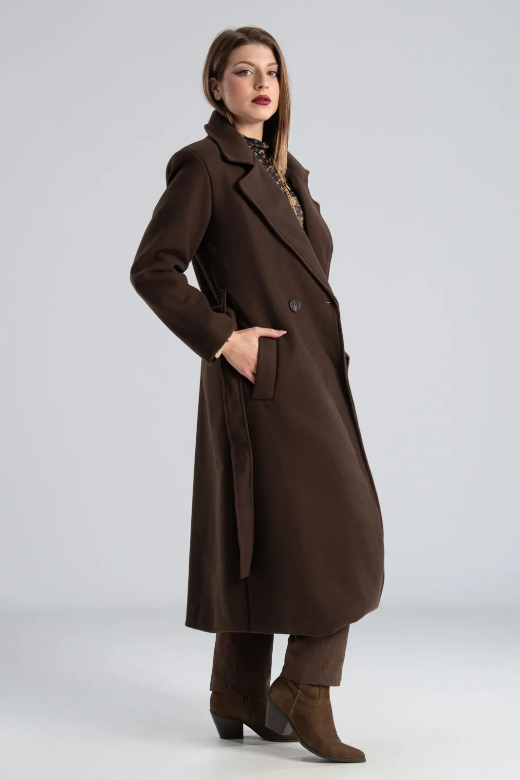 Long coat with collar and lapels. It has long sleeves. It has pockets on the sides. It fastens with a button and has a decorative detail. It is lined on the inside. It has its own belt in the same color and texture. The measurements were taken with the buttons closed. The measurements in the table are representative of each product. 90% polyester, 10% viscose.