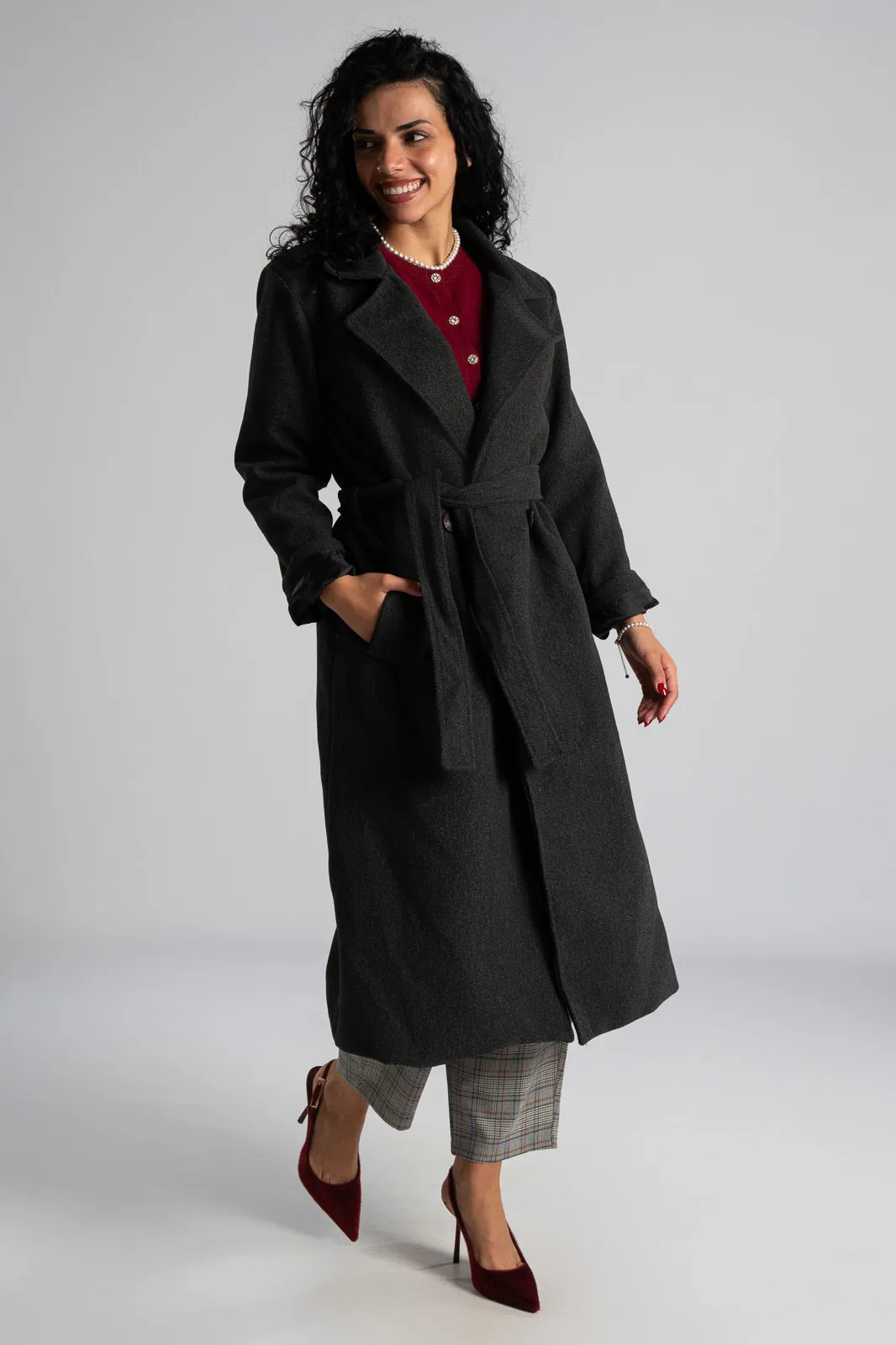 Long coat with collar and lapels. It has long sleeves. It has pockets on the sides. It fastens with a button and has a decorative detail. It is lined on the inside. It has its own belt in the same color and texture. The measurements were taken with the buttons closed. The measurements in the table are representative of each product. 90% polyester, 10% viscose.