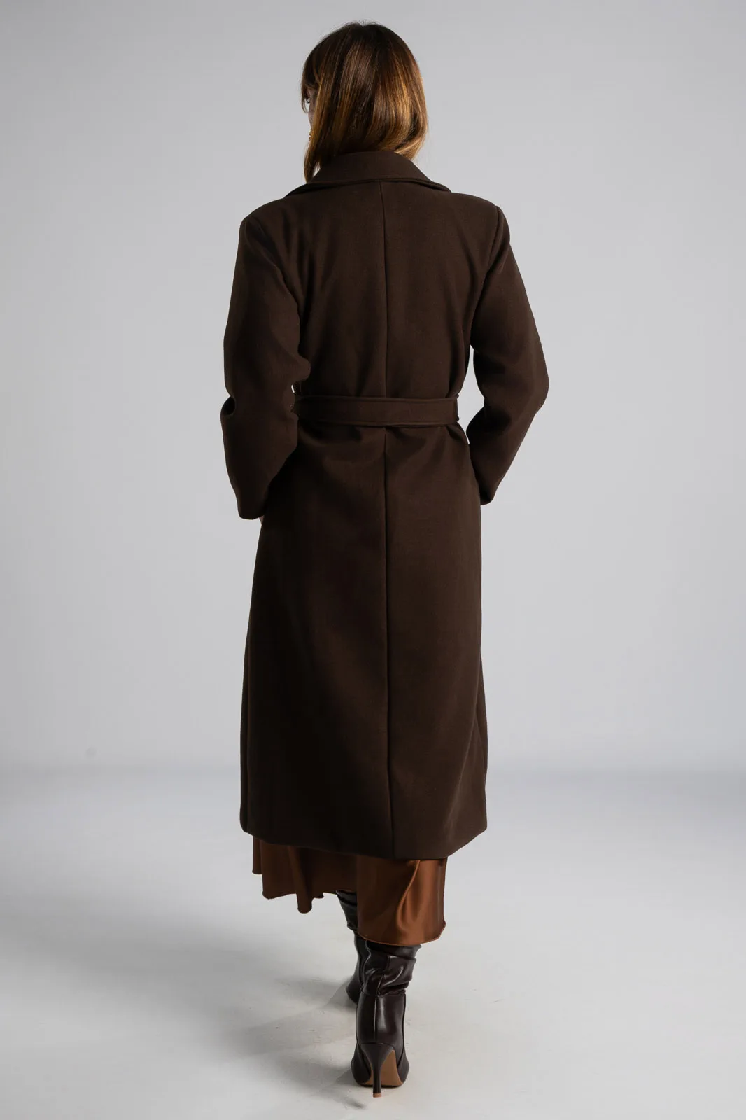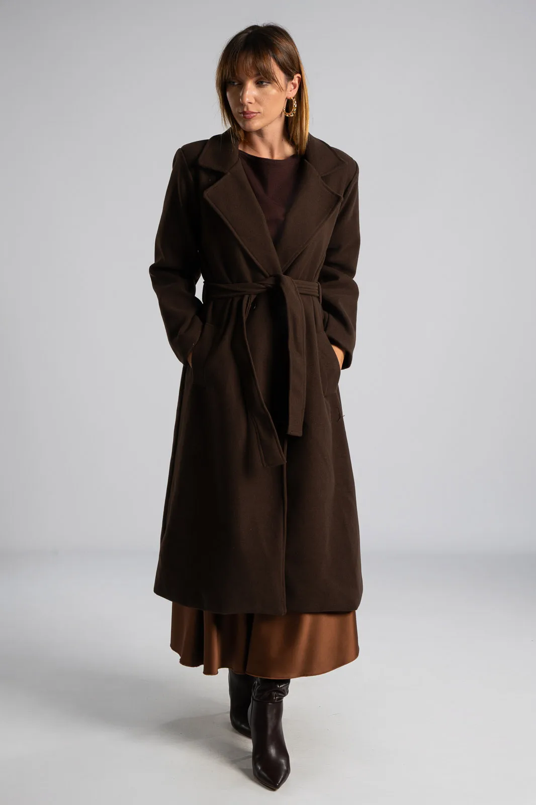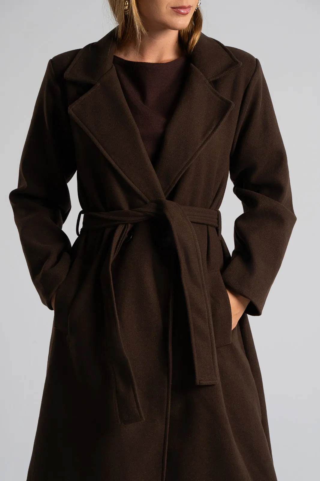 Long coat with collar and lapels. It has long sleeves. It has pockets on the sides. It fastens with a button and has a decorative detail. It is lined on the inside. It has its own belt in the same color and texture. The measurements were taken with the buttons closed. The measurements in the table are representative of each product. 90% polyester, 10% viscose.