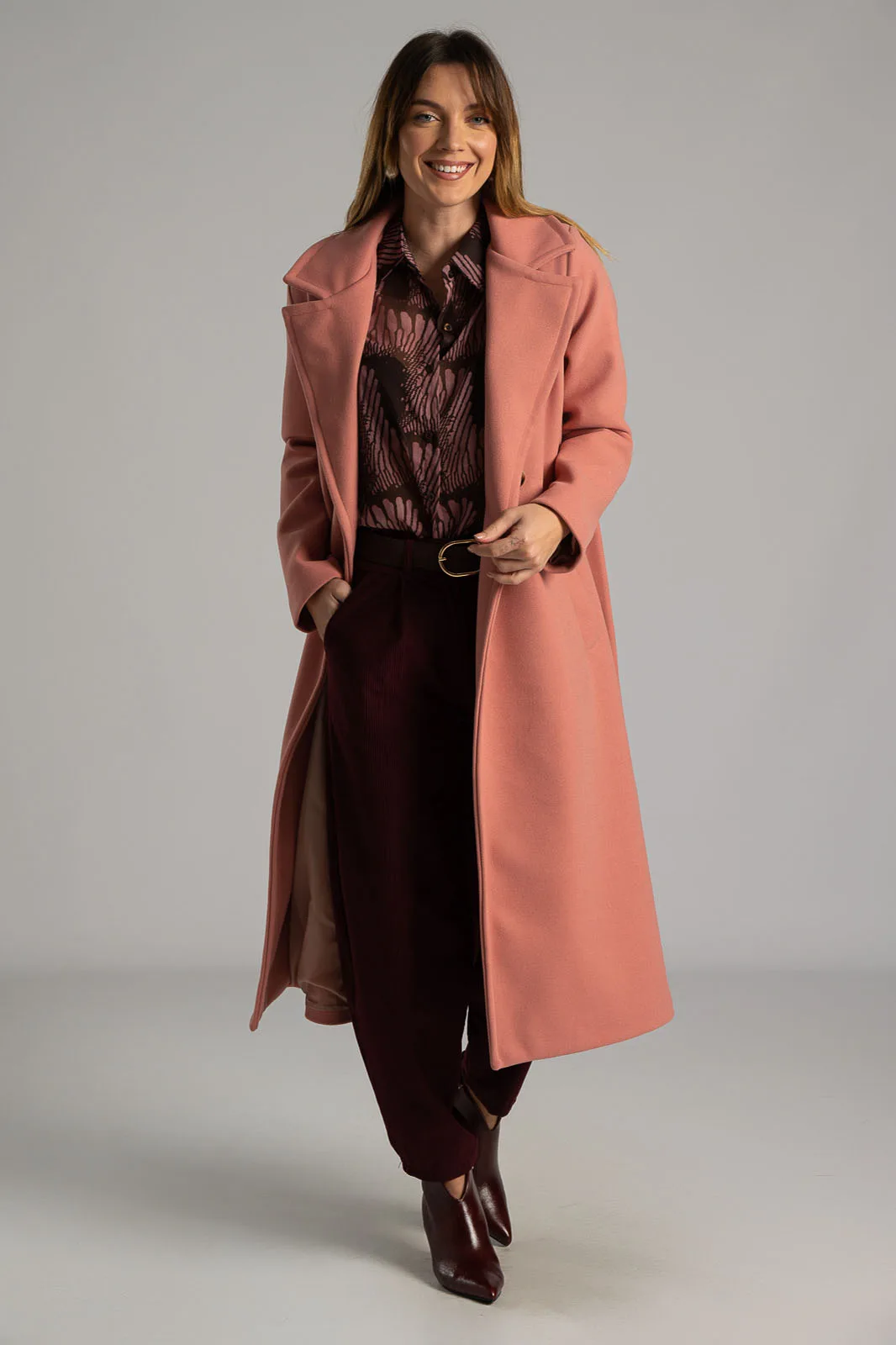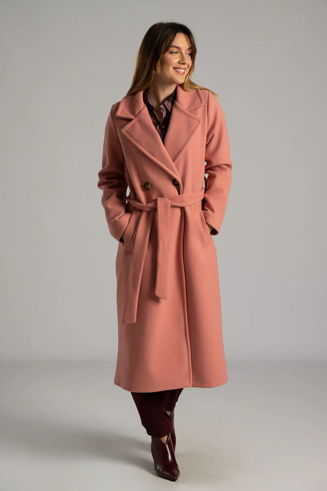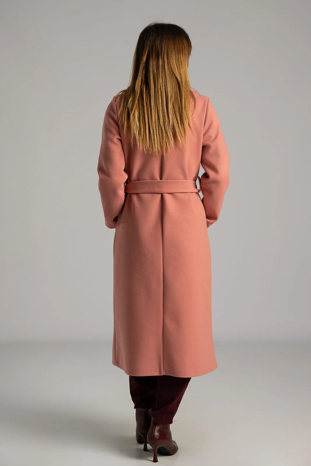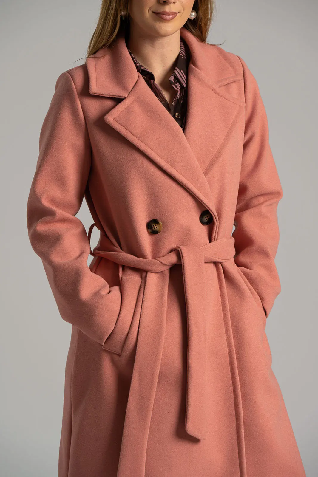 Παλτό οπου διαθέτει γιακά και πέτο. Έχει μακριά μανίκια και πλαινές τσέπες. Κλείνει με δύο κουμπιά και δύο διακοσμητικά. Έχει δική του ζώνη στην ίδια απόχρωση και υφή. Είναι midi. Εσωτερικά είναι φοδραρισμένο. Η μέτρηση έχει γίνει με κλειστά κουμπιά. Οι μετρήσεις του πίνακα είναι αντιπροσωπευτικές για κάθε προϊόν. 95% polyester, 5% elastan.