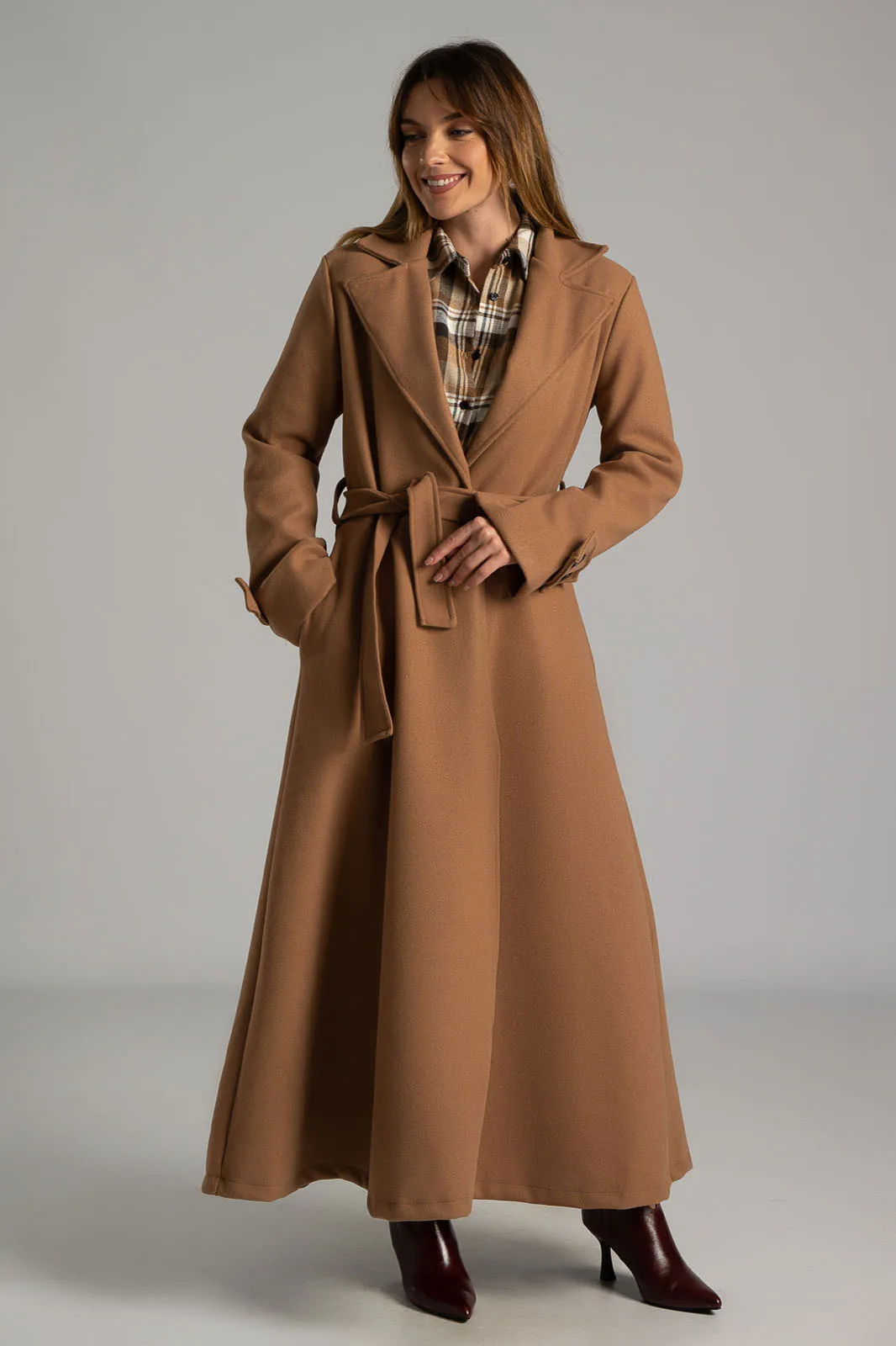 Παλτό με γιακά και πέτο. Διαθέτει μακριά μανίκια, στο επάνω μέρος έχει διακοσμητικά κουμπιά. Εσωτερικά είναι φοδραρισμένο και κλείνει με ένα κουμπί. Έχει δική του ζώνη στην ίδια απόχρωση και υφή για καλύτερη εφαρμογή. Έχει πλαινές τσέπες. Είναι maxi. Η μέτρηση έχει γίνει με κλειστό κουμπί. Οι μετρήσεις του πίνακα είναι αντιπροσωπευτικές για κάθε κωδικό. 100% polyester.