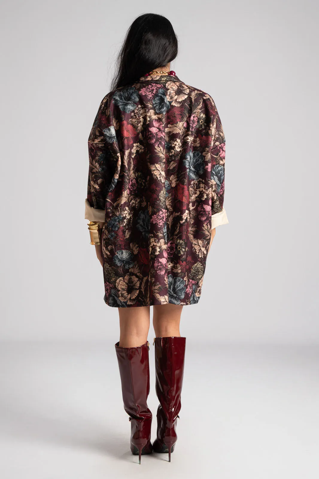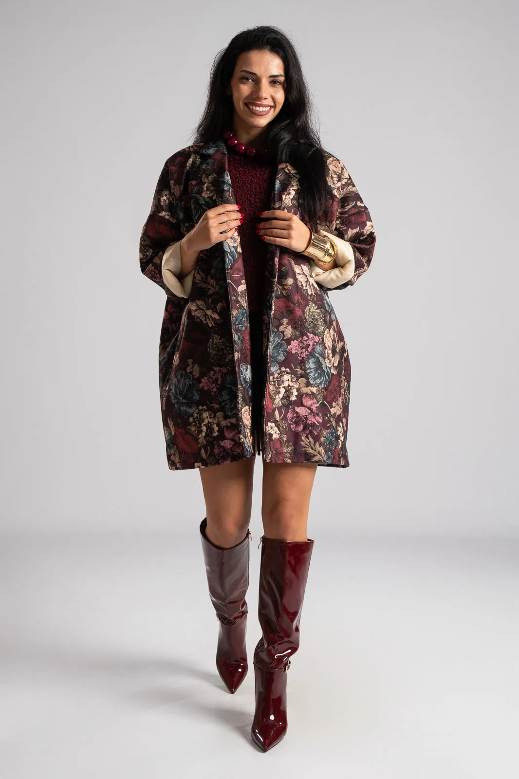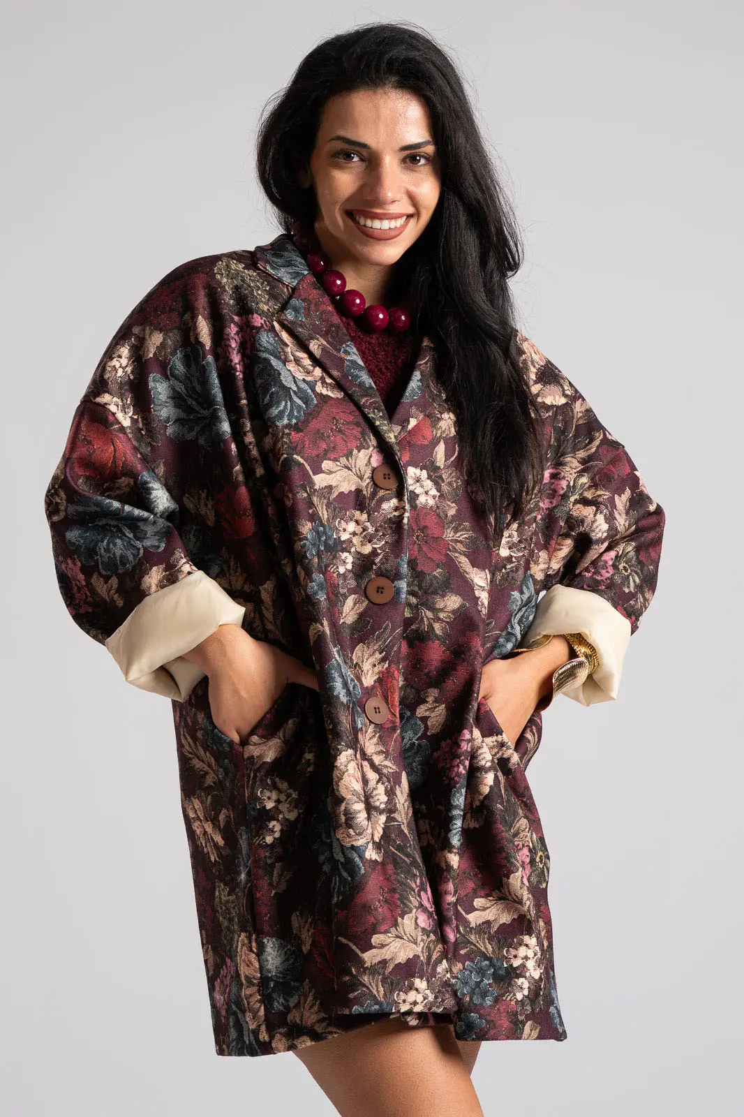 Παλτό midi με γιακά και πέτο. Έχει μακριά μανίκια. Στο μπροστινό μέρος κλείνει με κουμπιά. Σε όλη την επιφάνεια έχει έντονο floral print. Εσωτερικά είναι φοδραρισμένο. Στα πλαινά διαθέτει τσέπες. Η μέτρηση έχει γίνει με κλειστα κουμπιά. Οι μετρήσεις του πίνακα είναι αντιπροσωπευτικές για κάθε κωδικό. 100% polyester.