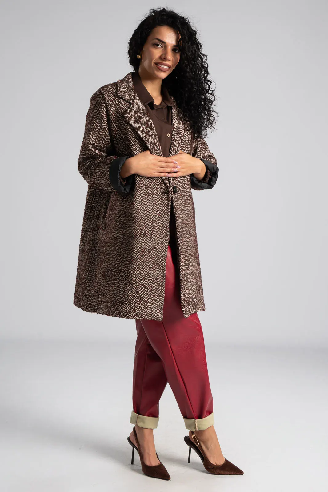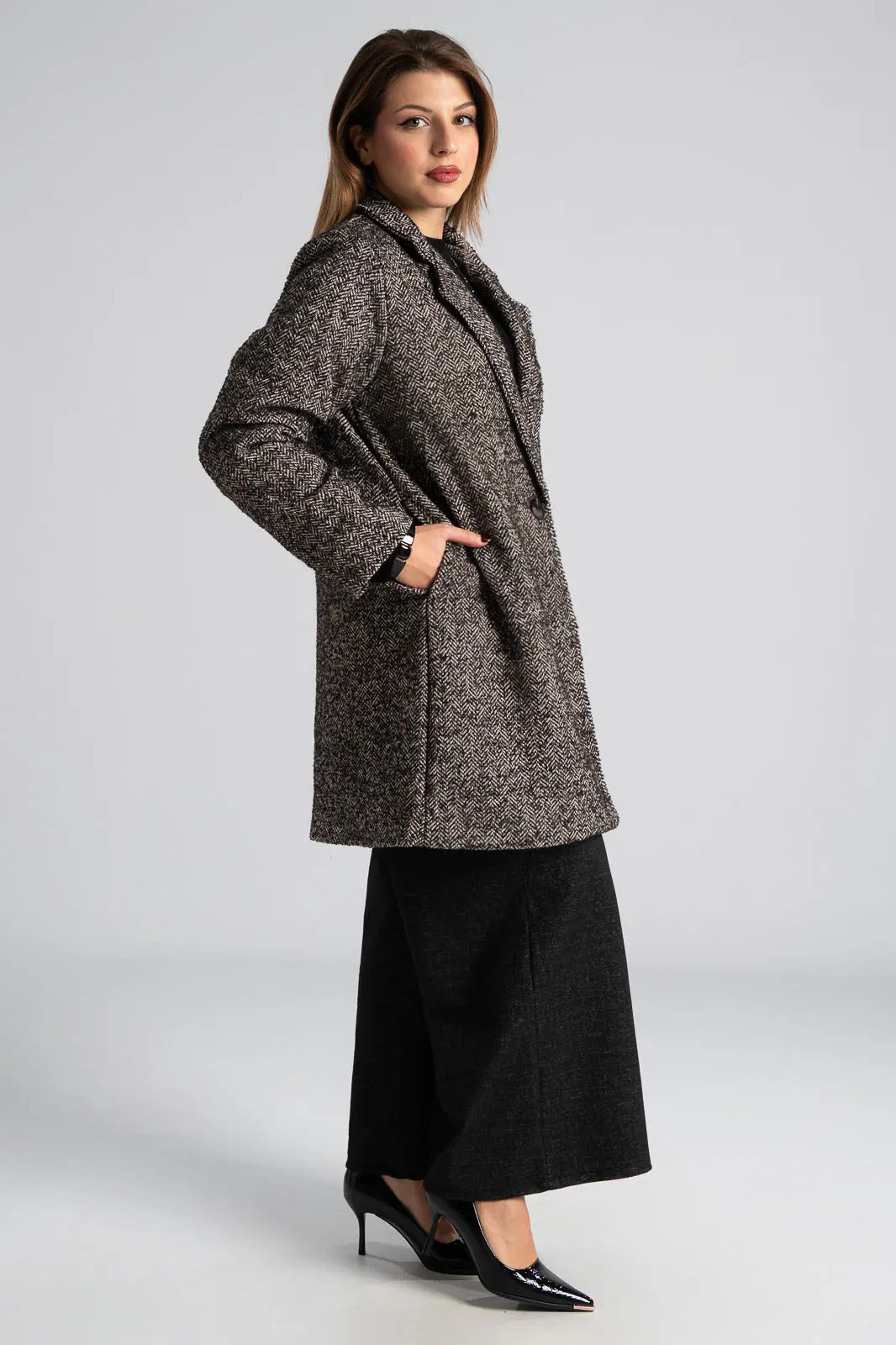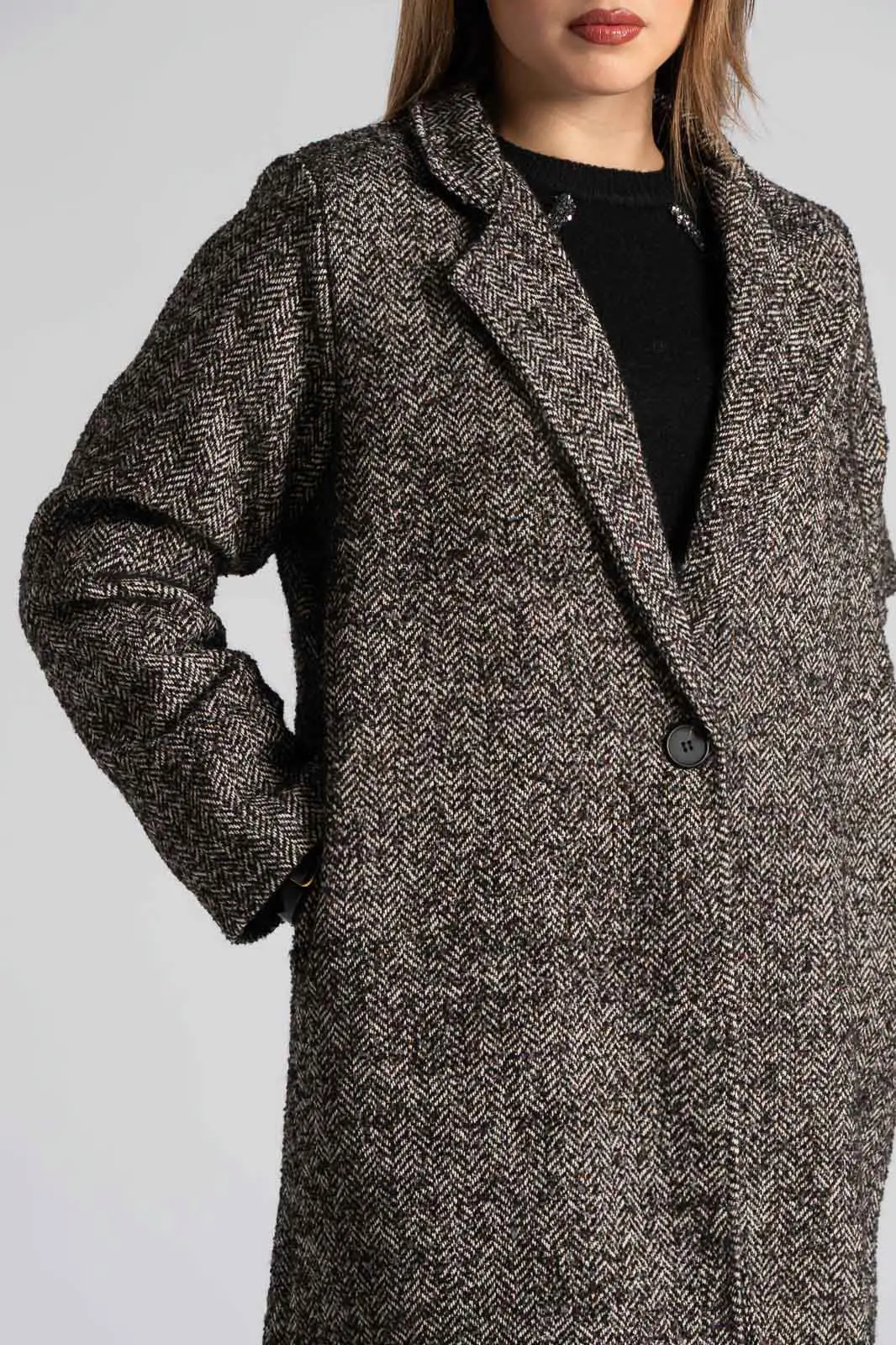 Παλτό ριγωτό σε ίσια γραμμή. Διαθέτει γιακά, πέτο και έχει μακριά μανίκια. Στα πλαινά έχει τσέπες. Εσωτερικά είναι φοδραρισμένο και κλείνει με κουμπί. Η μέτρηση έχει γίνει με κλειστό το κουμπί. Οι μετρήσεις του πίνακα είναι αντιπροσωπευτικές για κάθε κωδικό. 85% polyester, 10% lana, 5% altrefibre.