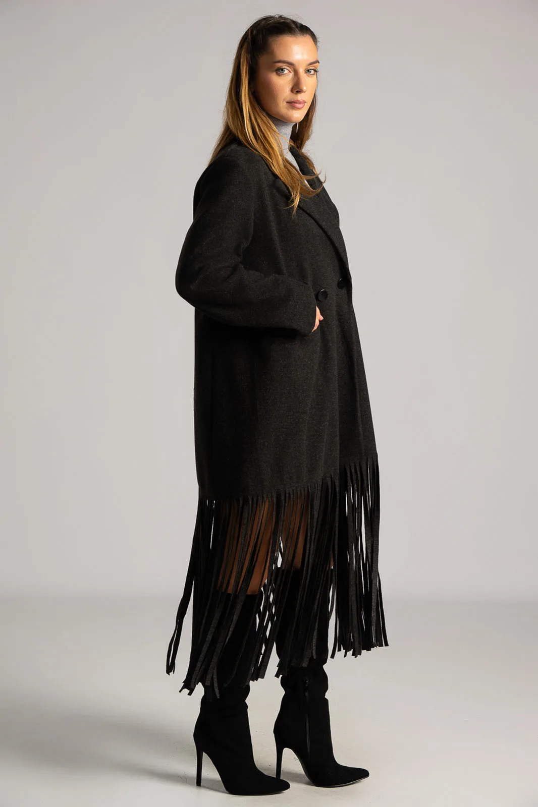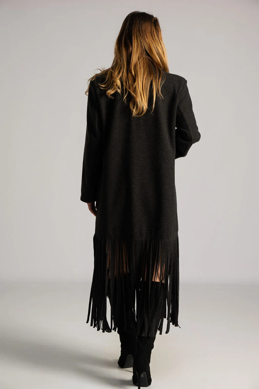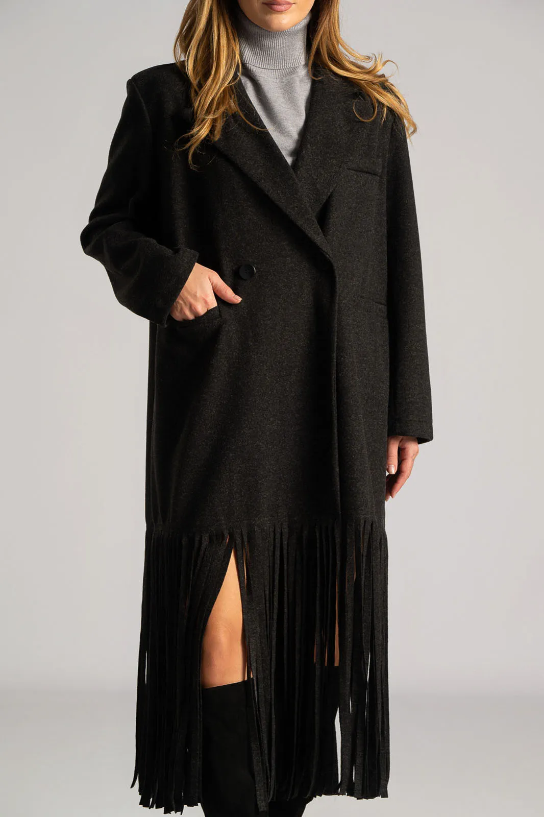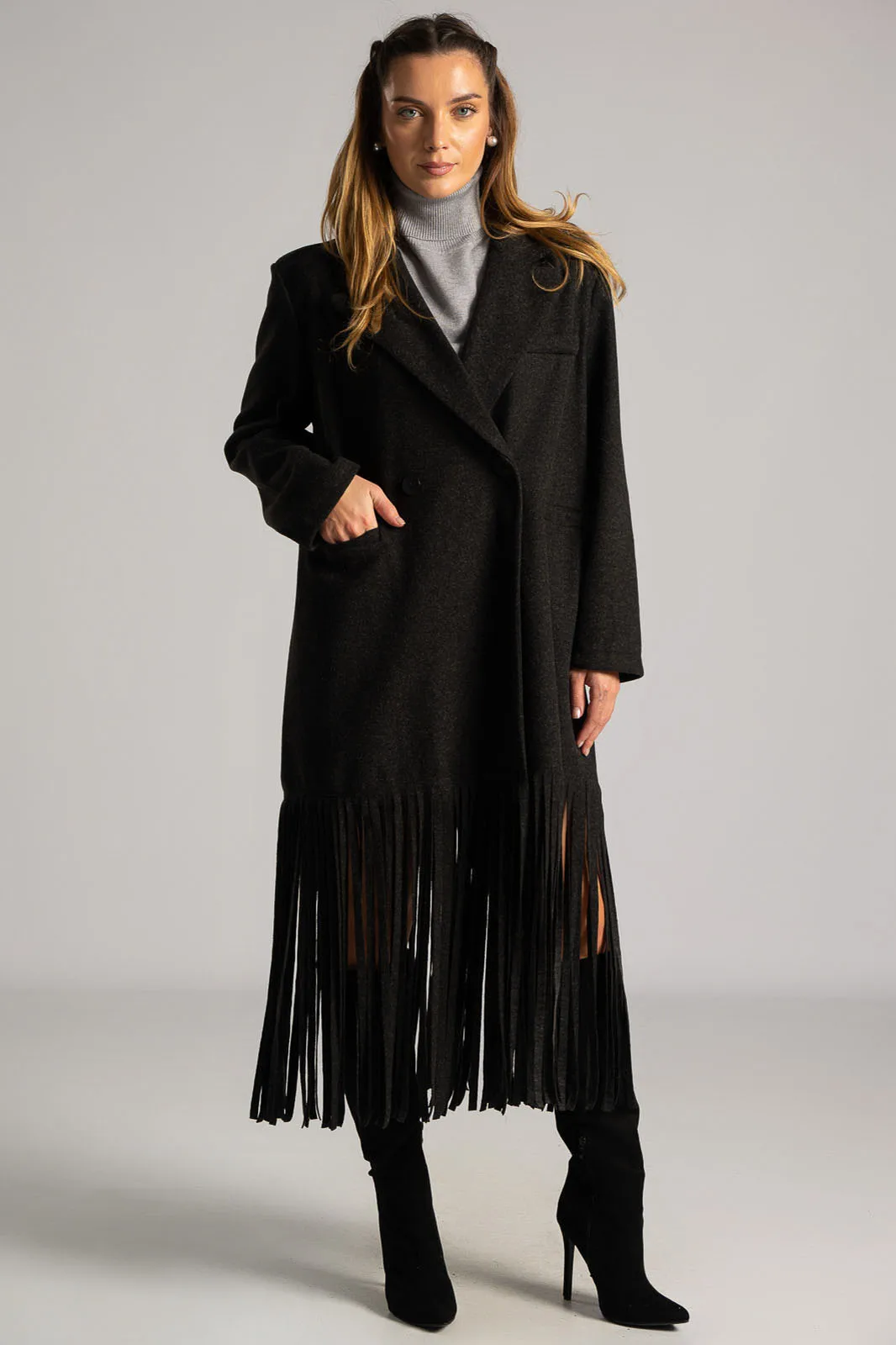 Coat with collar and lapels. It has long sleeves. It fastens with a button and has a decorative detail. It has pockets on the front and a faux pocket with a flap on the top. It ends in bold, large fringes. It does not have an inner lining. The measurements in the table are representative for each code. 83% polyester, 12% viscose.