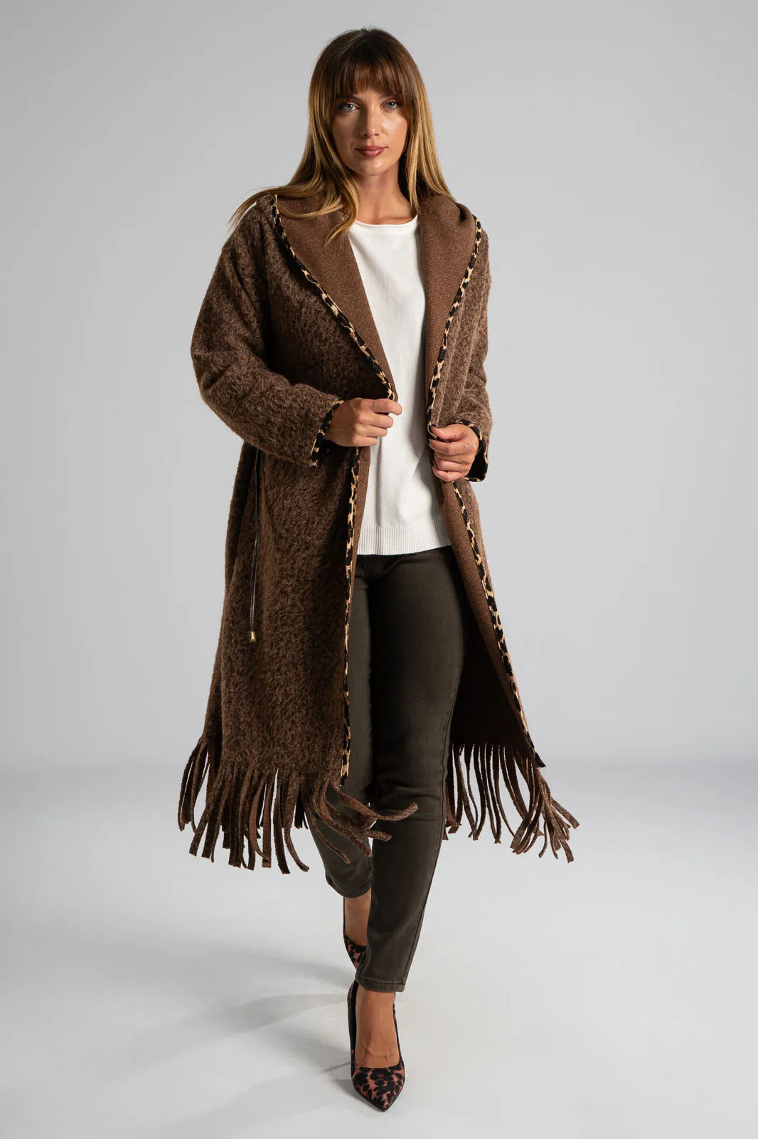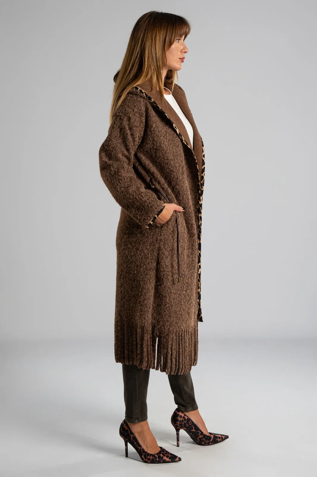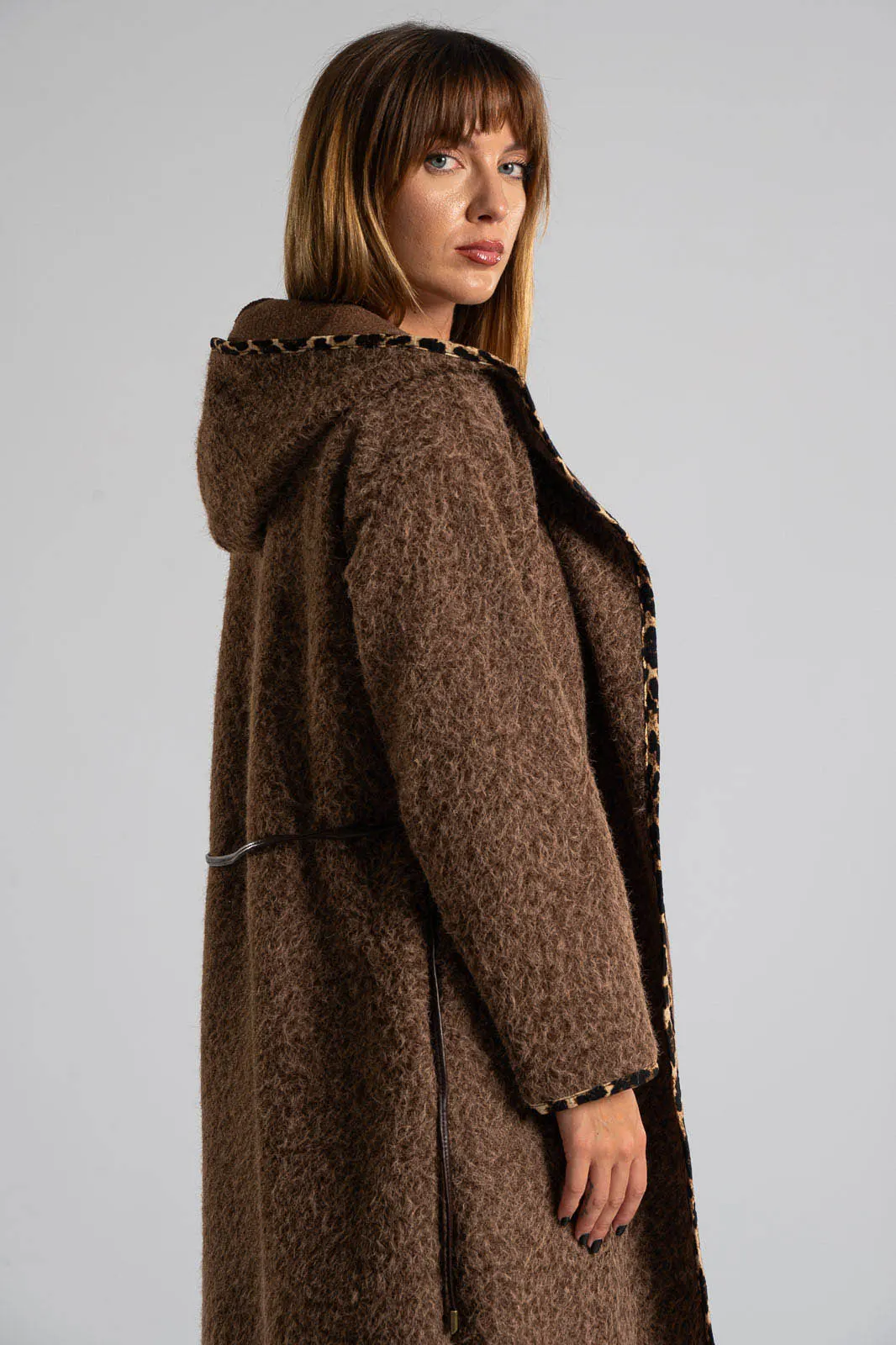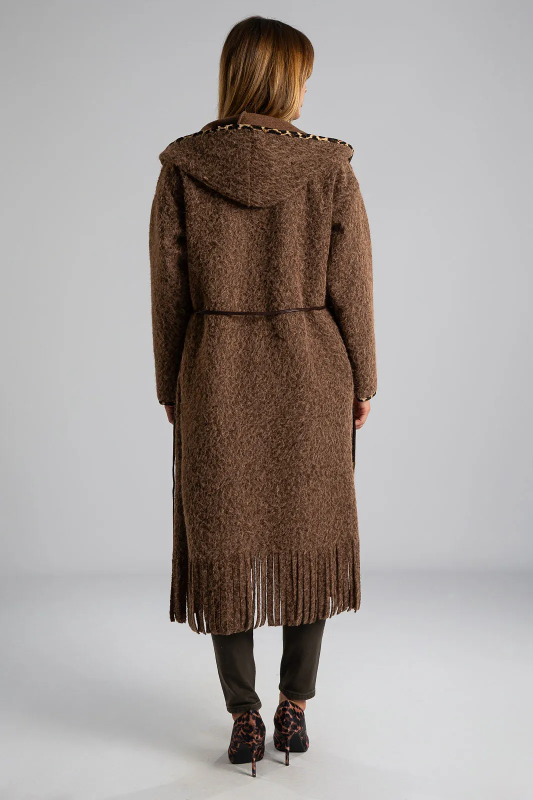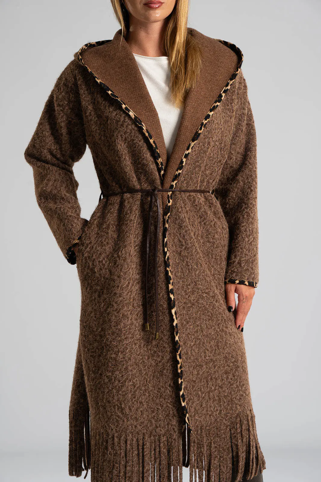 Παλτοζακέτα από νήμα με αίσθηση μαλιού. Έχει δική του ζώνη δερματίνη και έχει πλαινές τσέπες. Διαθέτει κουκούλα και είναι σε ίσια γραμμή. Περιμετρικά διαθέτει leopard λεπτομέρειες. Η μέτρηση έχει γίνει με άνοιγμα μιας παλάμης. Οι μετρήσεις του πίνακα είναι αντιπροσωπευτικές για κάθε κωδικό. 100% polyester