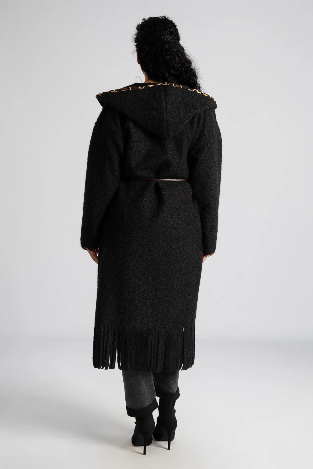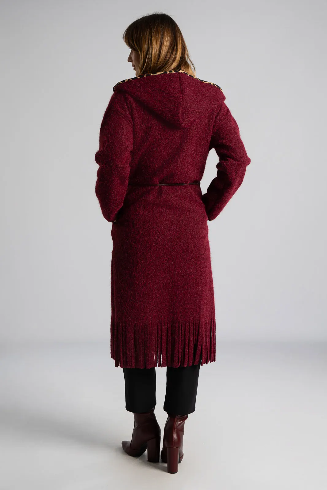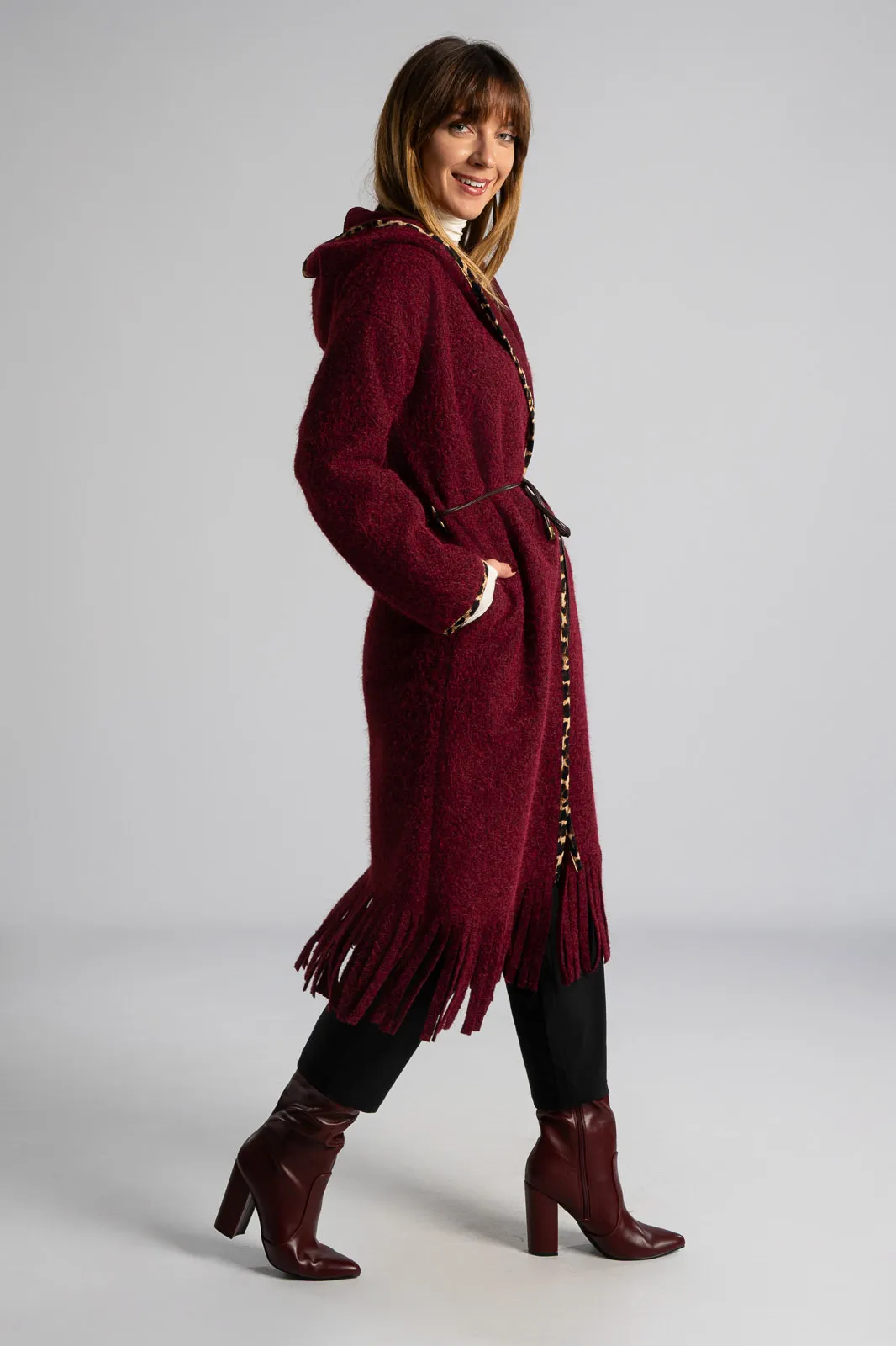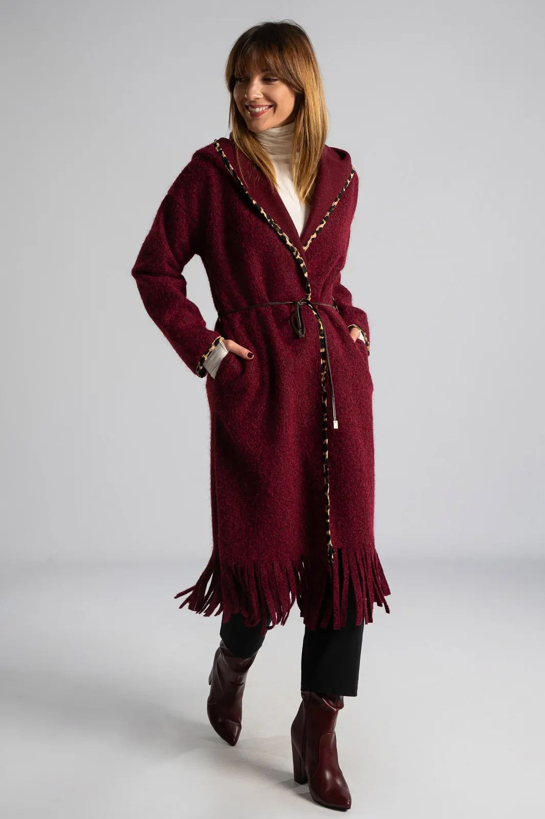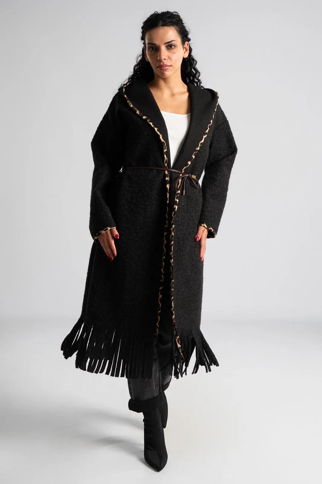 Coat made of wool blend yarn. It has its own leather belt and side pockets. It has a hood and a straight cut. It has leopard print details around the edges. The measurements were taken with one hand open. The measurements in the table are representative for each code. 100% polyester