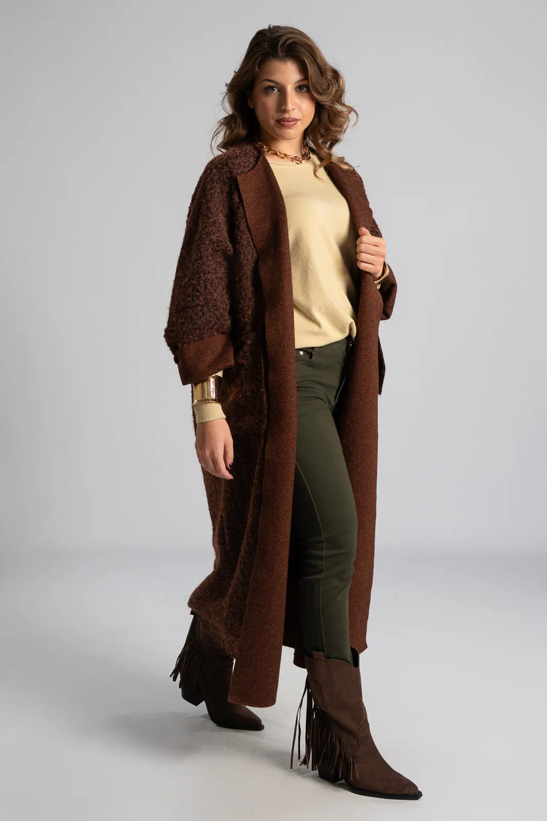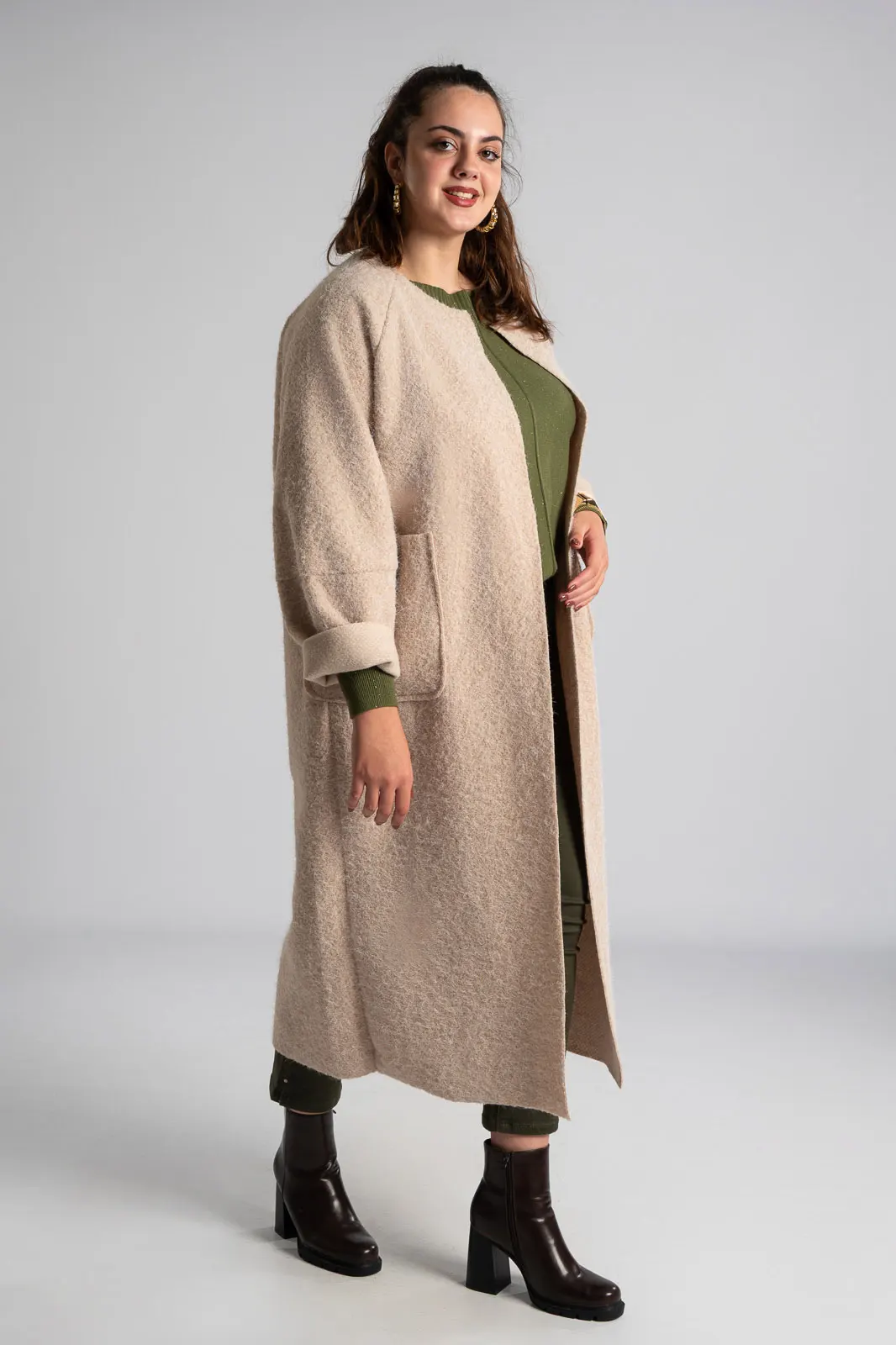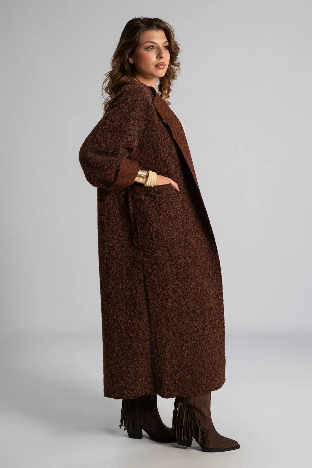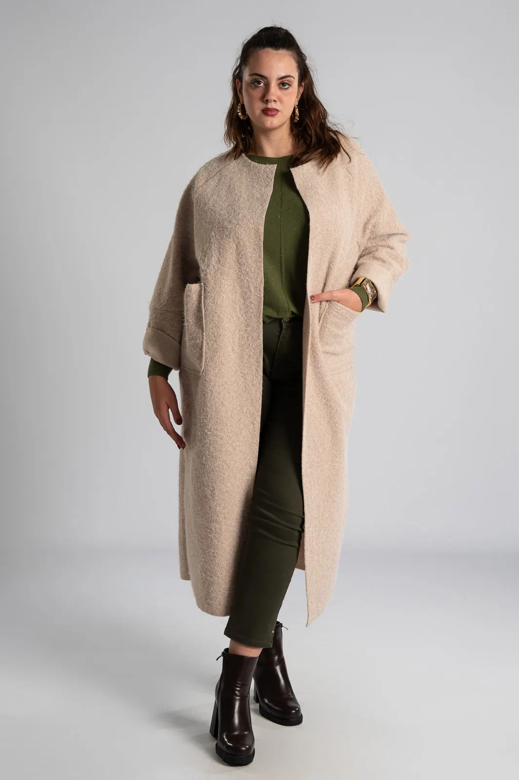 Παλτοζακέτα με στρογγυλή λαιμόκοψη. Είναι σε χνουδωτή υφή και διαθέτει μακριά μανίκια. Είναι maxi. Στο μπροστινό μέρος έχει τσέπες. Η μέτρηση έχει γίνει με άνοιγμα μιας παλάμης. Δεν διαθέτει φόδρα. Οι μετρήσεις του πίνακα είναι αντιπροσωπευτικές για κάθε κωδικό. 100% polyester.